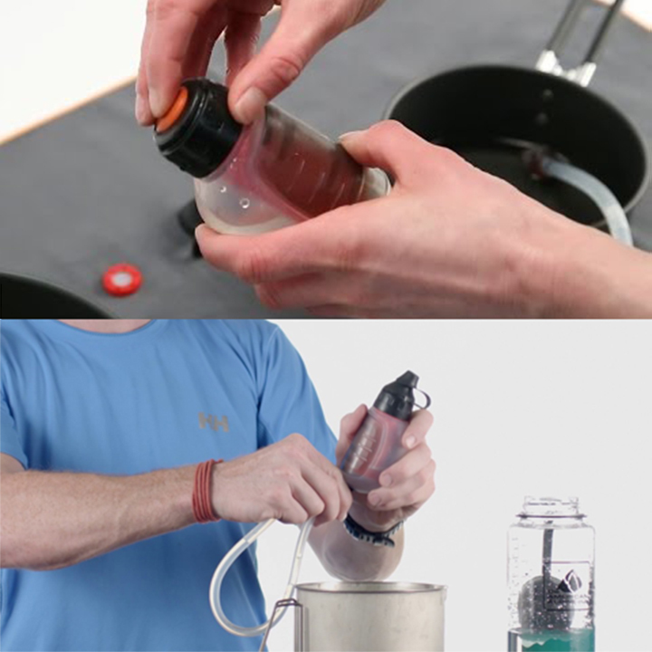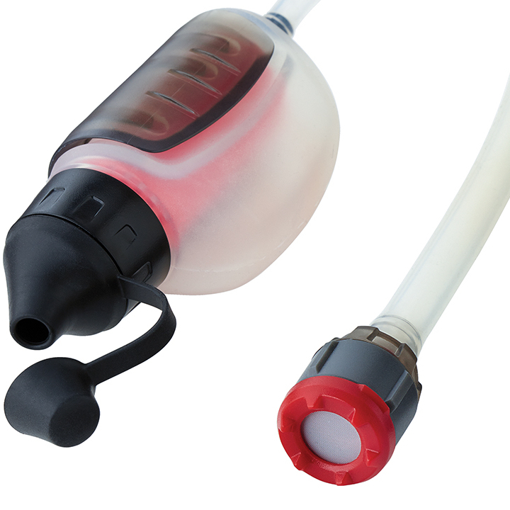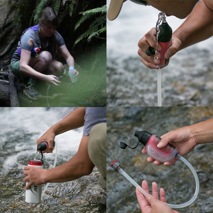 フィルターを覆う本体はポンプになっていて、握りこむだけで浄水可能。浄水しながら直接飲むことができるので、小さな水たまりからも水が得られます。