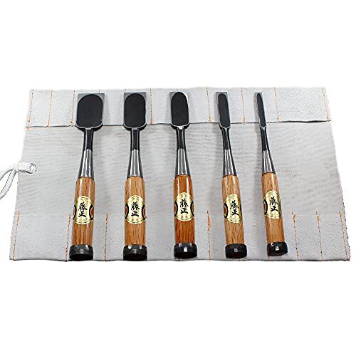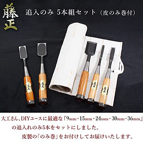―播州・三木の鍛冶工房で一本一本、職人の手による追入れのみ― 熟練職人の手打ちにより造られており、素直な鋼使いの仕上げで 『 プロの大工からDIYまで 』 幅広い層の方々に永くお使いいただける定番の人気商品。 特に需要の高い5サイズ、―9mm・15mm・24mm・30mm・36mm― 大工さん、DIYユース共に最適なこの5本をセットにしました。 皮製の「のみ巻」をお付けしてお届けいたします。 全長は5サイズ共に約22cm。(多少の差異あり。) 柄の素材には赤樫を使用。鋼の素材は青紙炭素鋼となっています。 砥石で刃を研いでご使用下さい。 カツラは十分に沈ませてから、使用してください。仕上げの刃研ぎはご自身でお願いいたします。 手作り品のため、仕様が写真と異なることがございます。ご了承下さい。