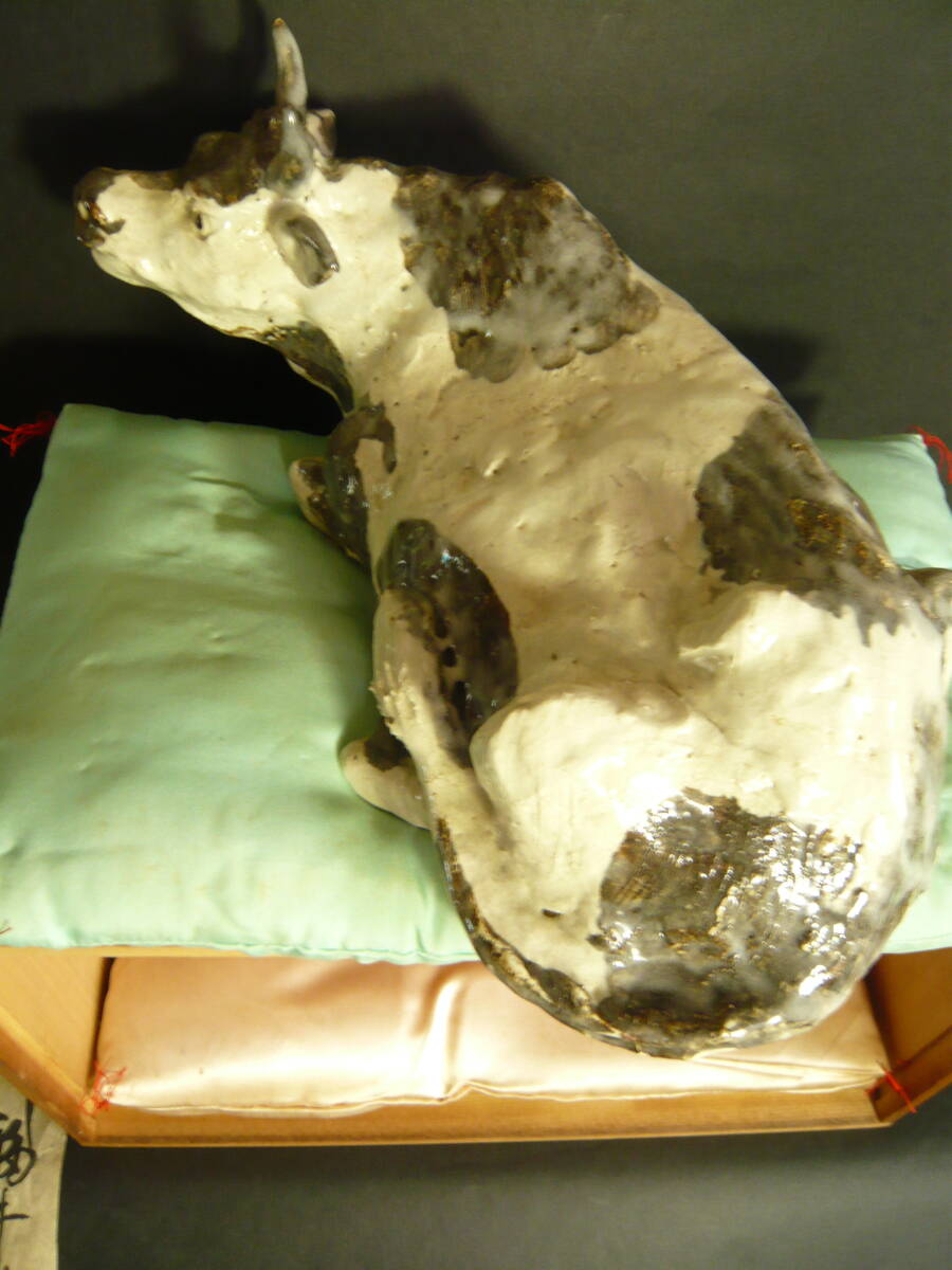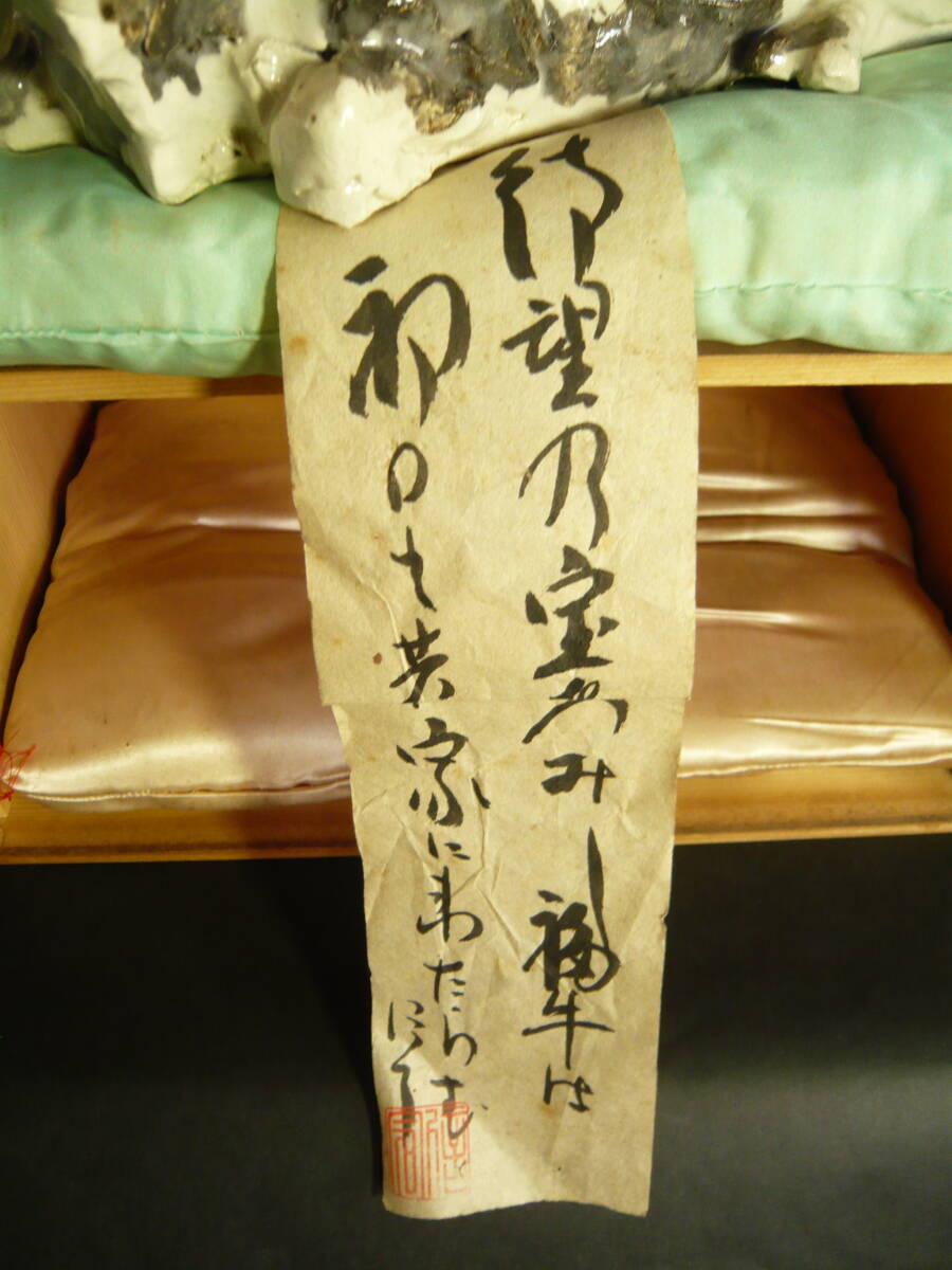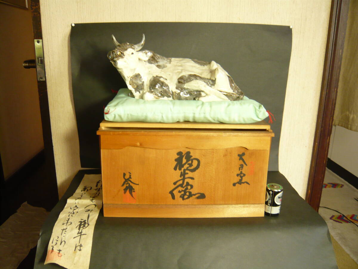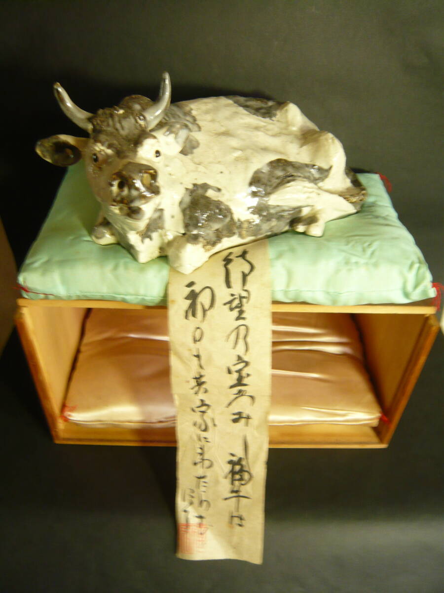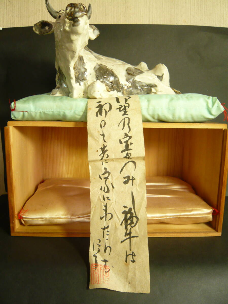 共箱のサイズ 縦約17.5センチ、横約33センチ、奥行き約20センチです。作品のサイズは、左右の長さ約28センチ、高さ約14センチ、奥行き(幅)約20センチです。傷はありません。箱には、作品のほかに、前の持ち主が作られたと思われる座布団2枚があります。他に信令作の短冊が付いてます。「待望乃宝をつみし福牛は、初日と共に家に来たらむ」です。