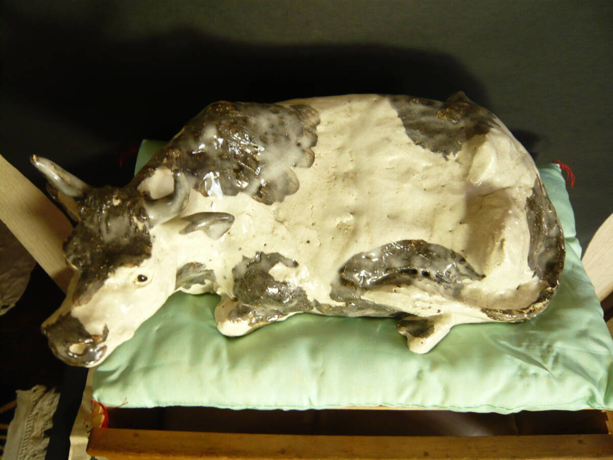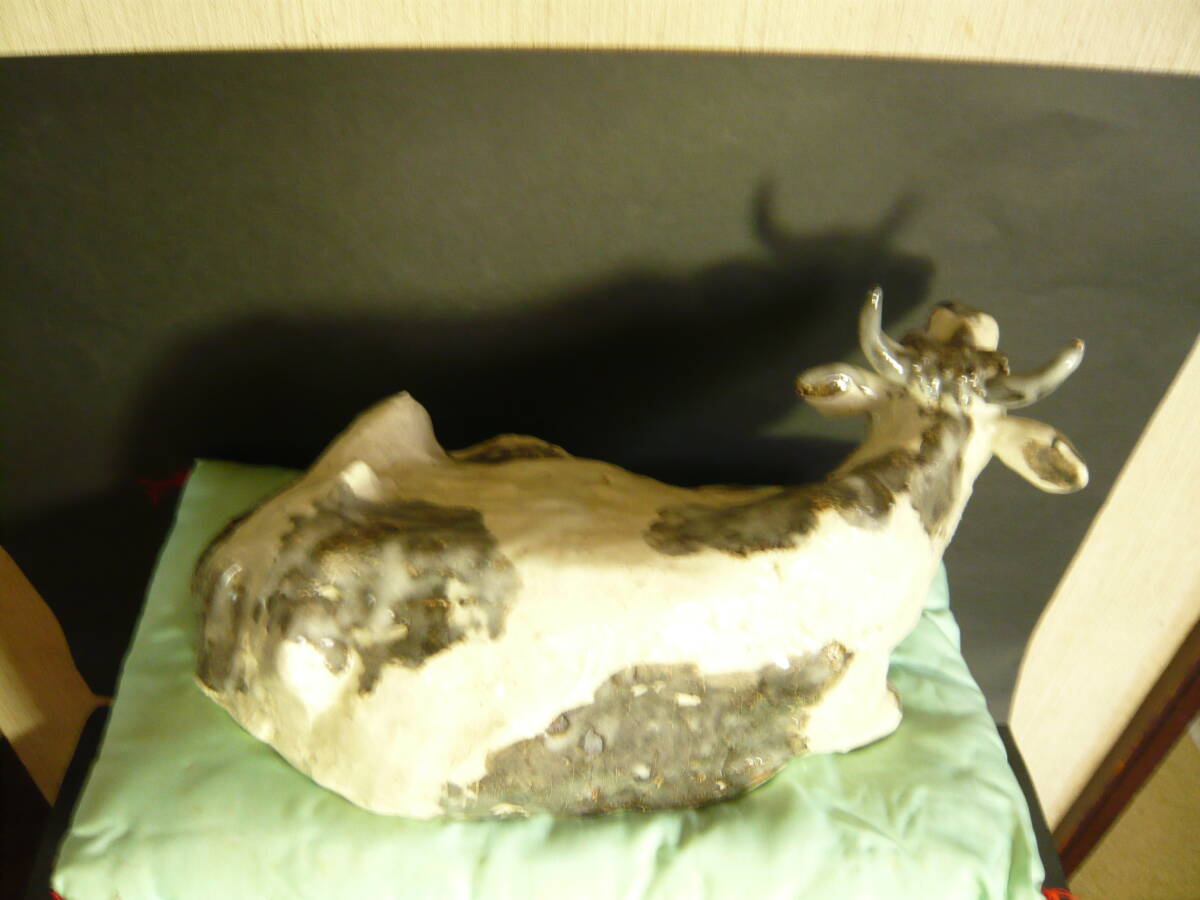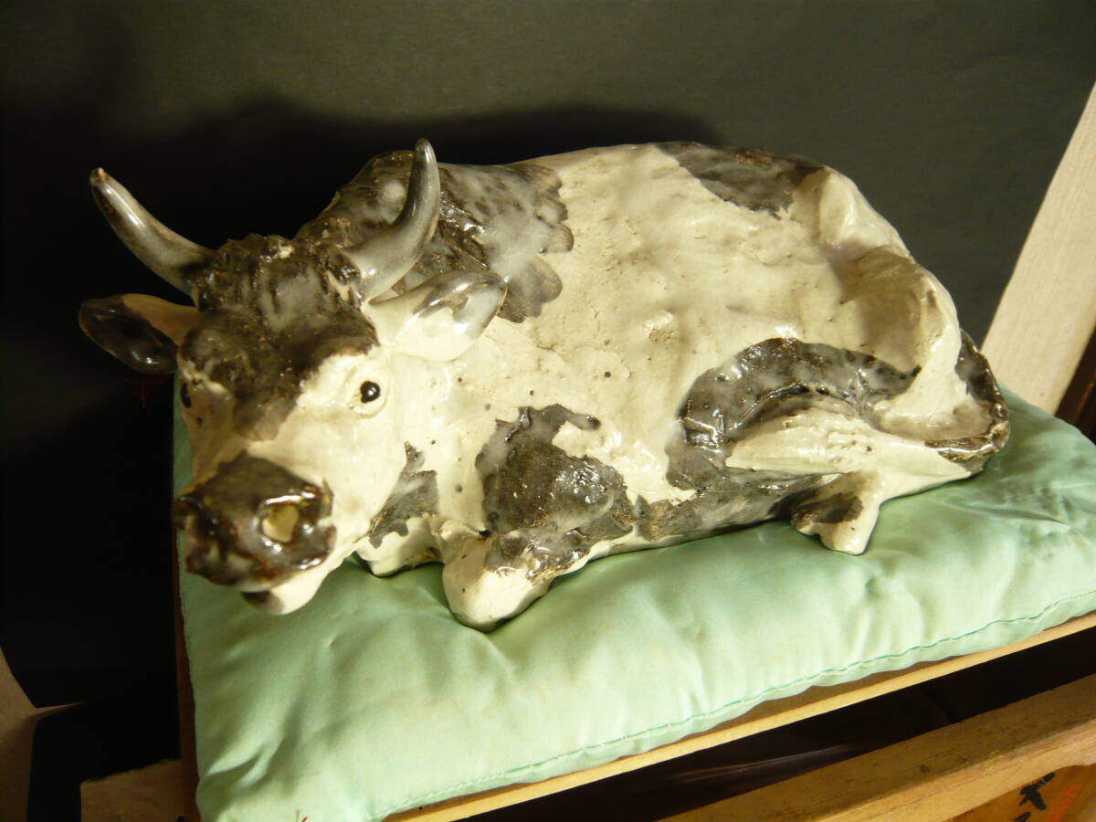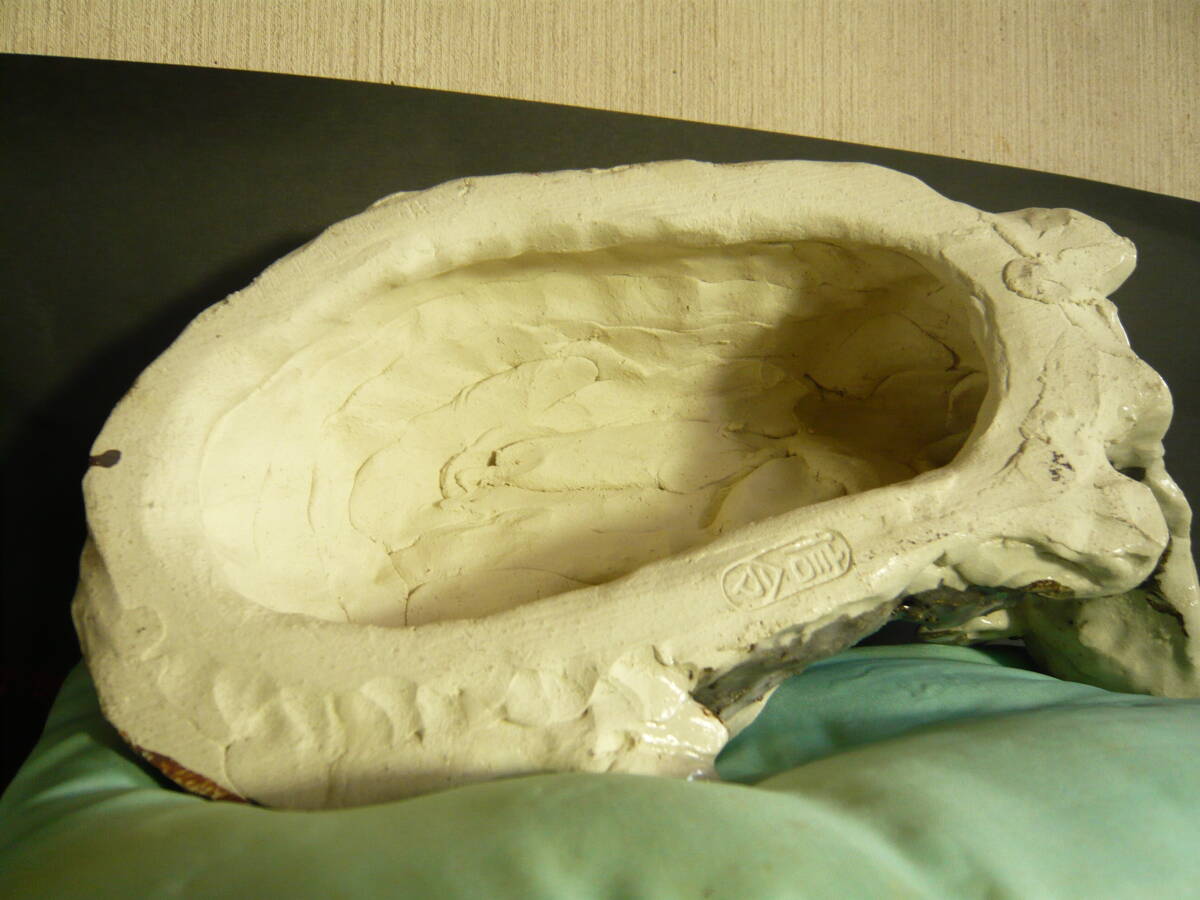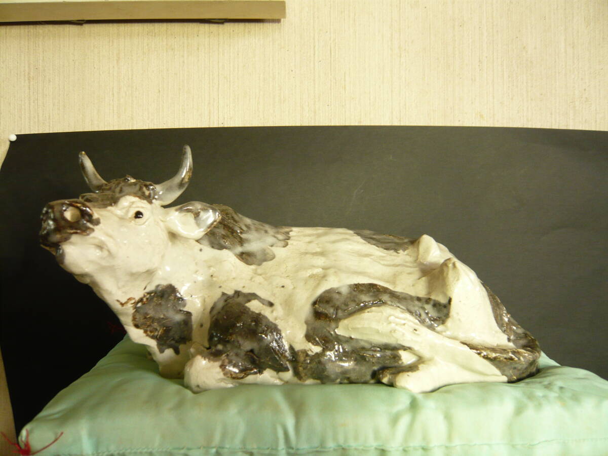 共箱のサイズ 縦約17.5センチ、横約33センチ、奥行き約20センチです。作品のサイズは、左右の長さ約28センチ、高さ約14センチ、奥行き(幅)約20センチです。傷はありません。箱には、作品のほかに、前の持ち主が作られたと思われる座布団2枚があります。他に信令作の短冊が付いてます。「待望乃宝をつみし福牛は、初日と共に家に来たらむ」です。