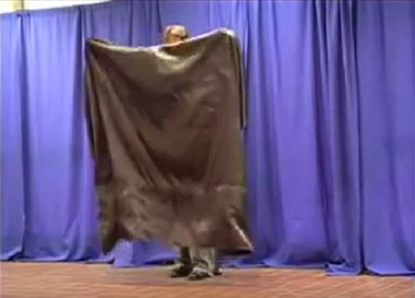 演者は大きな布を体の前に広げます。両手は完全に布の両端を持っています。