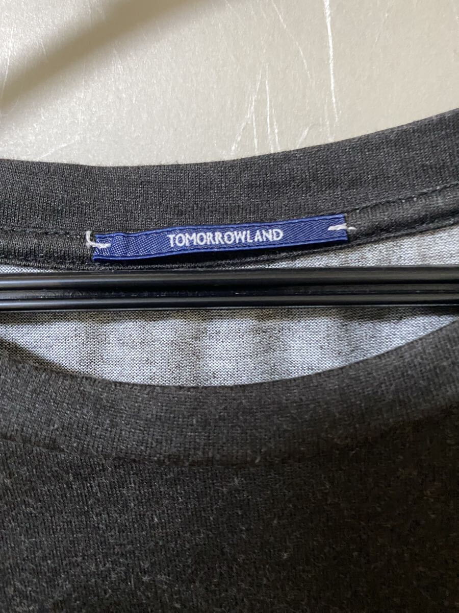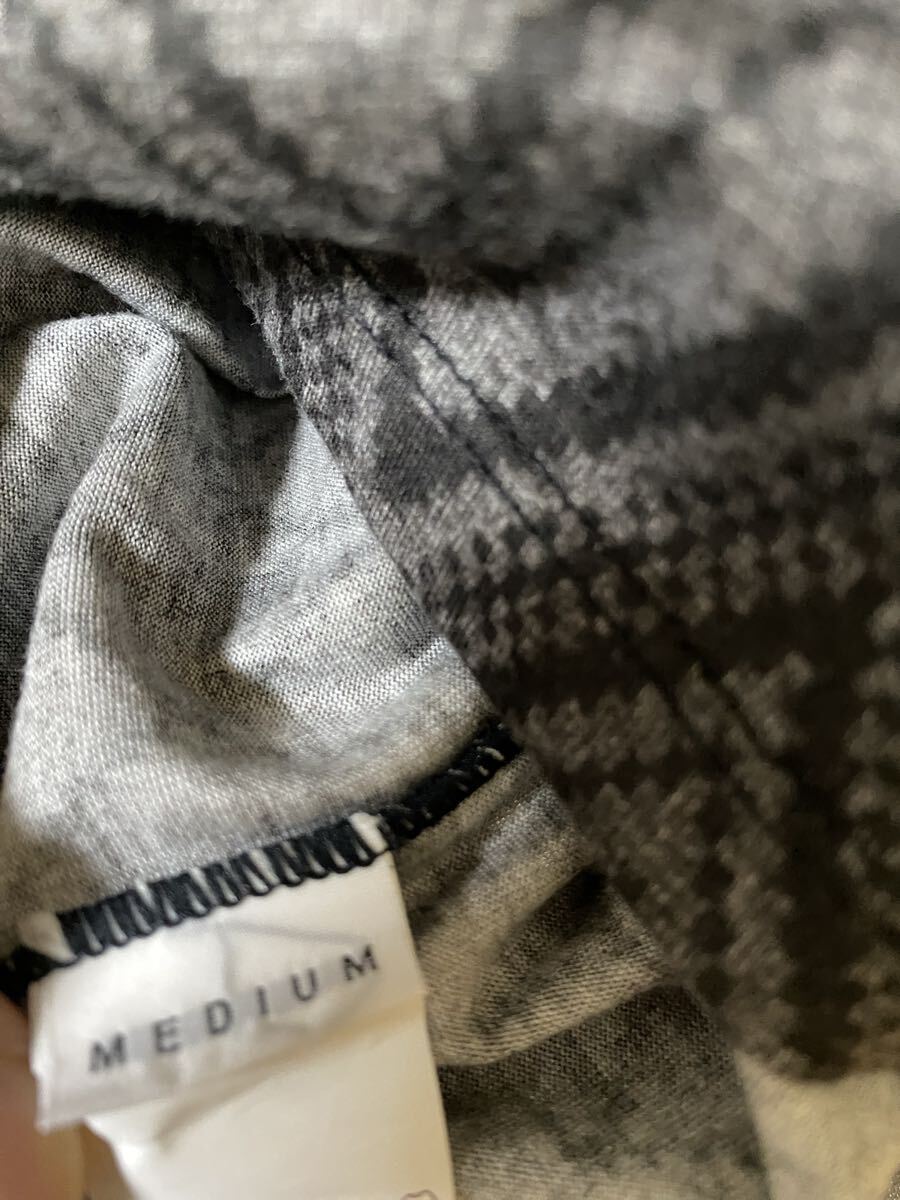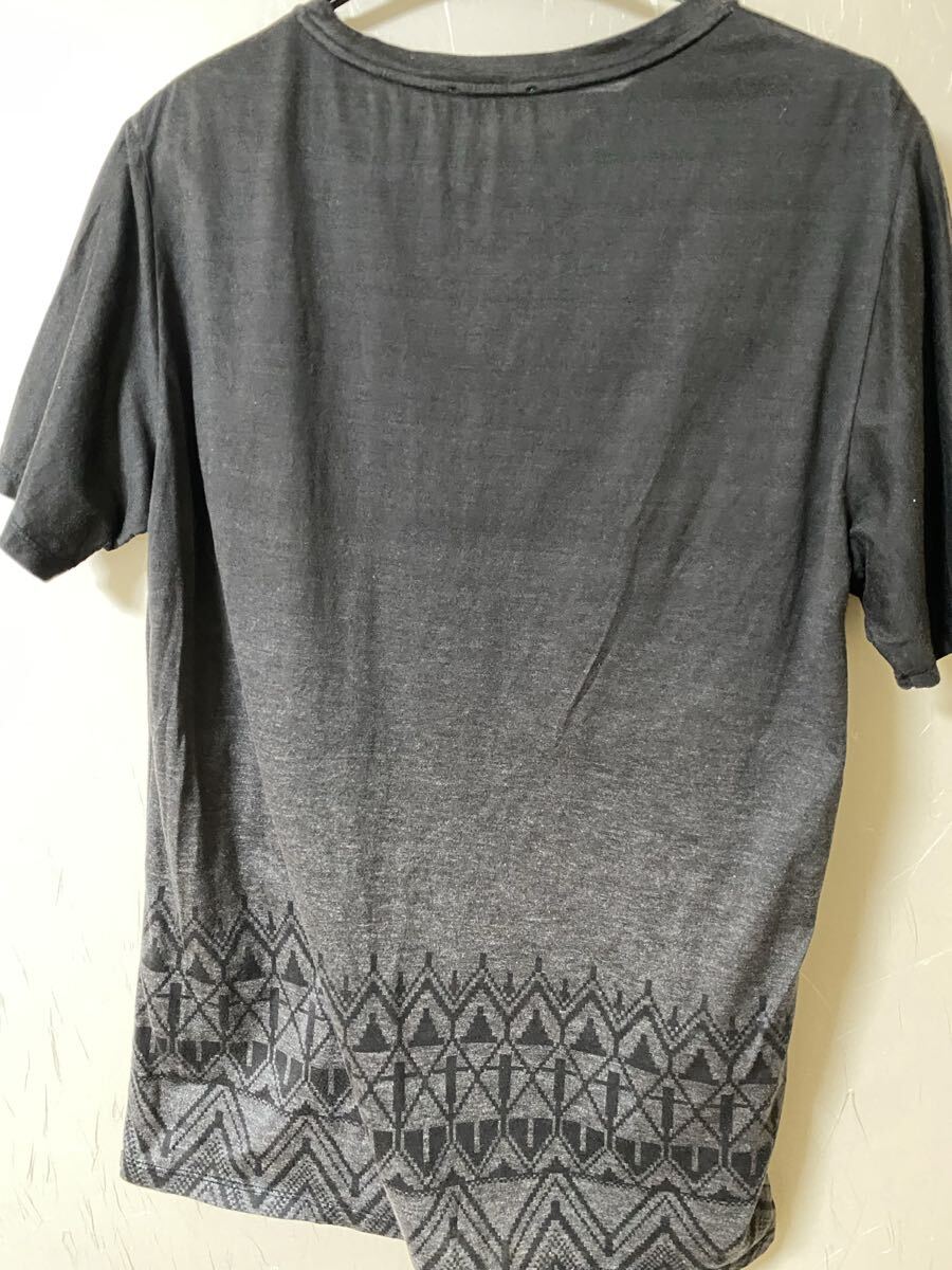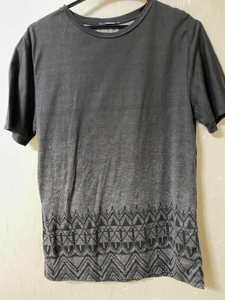幾何学模様が施されたグレーのTシャツ、サイズM。