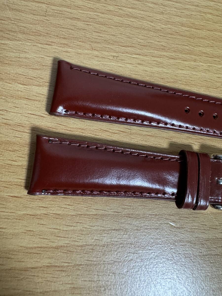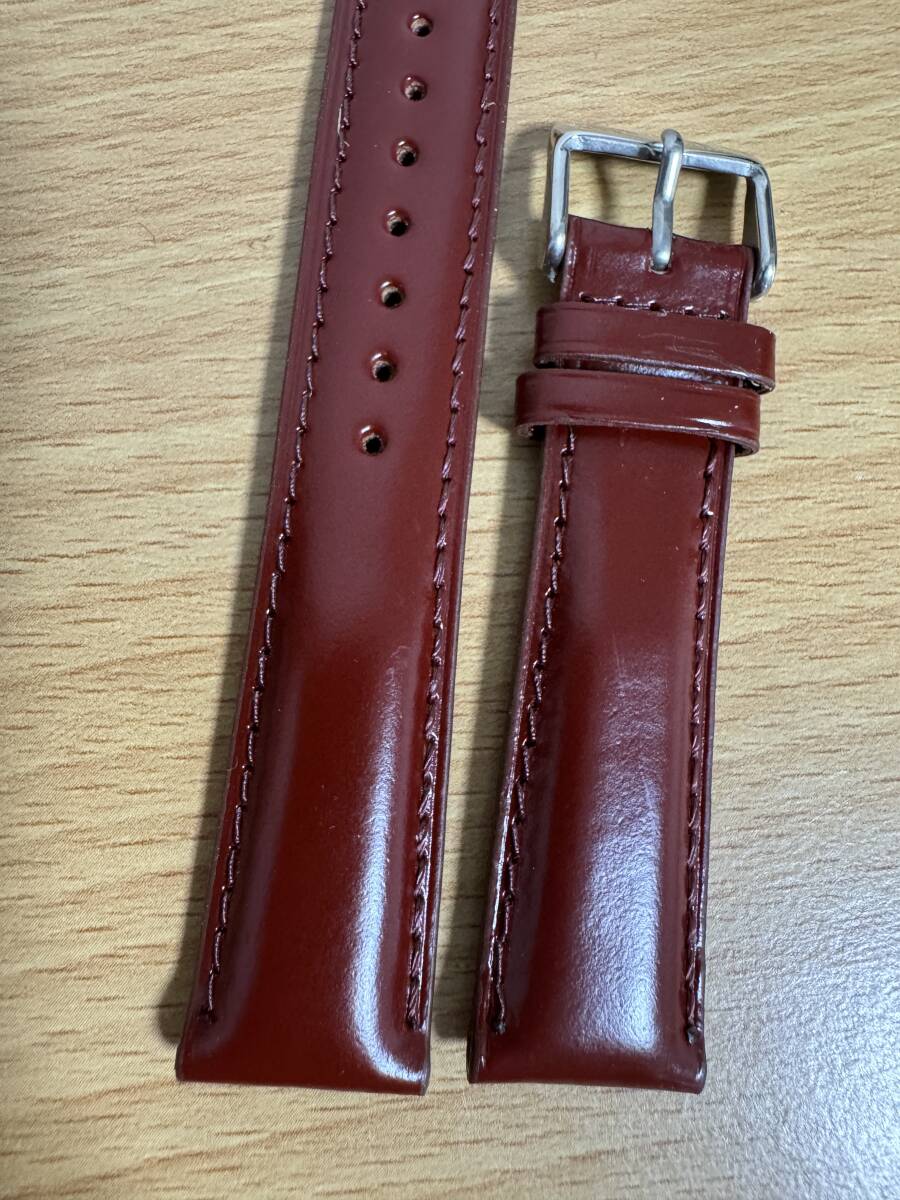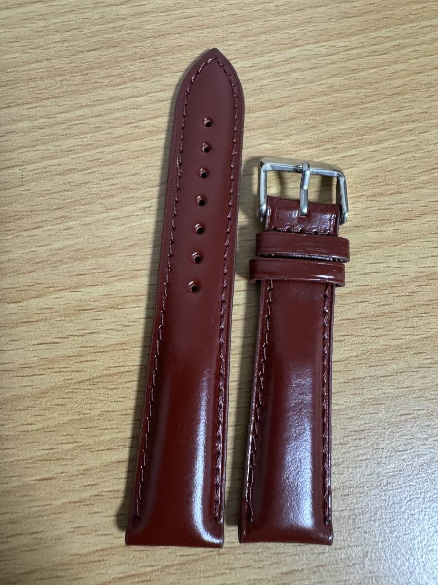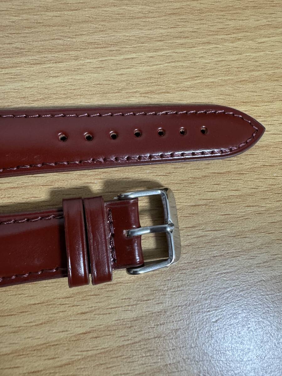 本物●新品 コードバン 時計ベルト ラグ幅20mm 馬革 ハンドメイド 銀尾錠 肉厚感●商品紹介コードバン腕時計ベルトです。顔料を用いて、平滑な表面の上に幾重にも塗膜を重ね美しい面を表現したコードバンです。最終の着色工程では何度も調整し完璧に調色された顔料を扱う為、防塵/湿度管理まで行き届いた場所での作業です。ここでは職人も不織布のつなぎを着て作業を行なっており、 徹底したクオリティコントロールが行われています。特殊な塗膜の層が製品の使用中に起こる表面的な傷をつきにくくしながらも、透明感のある表情や使うほどに増すエイジングを楽しませてくれるコードバンです。使えば使う程、本物の良さ味が出て来ます。ハンドメイド品ですので、作りの荒い所もあるかとは思いますが、ハンドメイドの個性とお考えください。ハンドメイドに理解頂けない方は、入札をお控えください。大手デパート等での購入をお勧め致します。■素材表: コードバン裏:羊革(イタリア産 耐汗加工)■色ワイン■状態新品未使用品■サイズ時計取り付け幅 20mm 尾錠幅 18mm(厚み 6㎜、6時側 118mm 12時側 75mm)●コンディション:【10】※銀尾錠は脱着可能です。ご希望される方は、取引メッセージ欄にお申し付けください。◆コンディション説明◆【10】・・・ 未使用、新品です。【9】 ・・・数回使用程度で、新品同様です。【8】 ・・・少し使用感がありますが、ヨゴレやダメージが見られない、極美品です。【7】 ・・・多少の使用感がありますが、大きなヨゴレやダメージが見られない、美品です。【6】 ・・・それなり使用感があります、ヨゴレ、キズが見られますが、一般的な中古品です。【5】 ・・・不良品箇所があります、ジャンク品です。 | |||||||