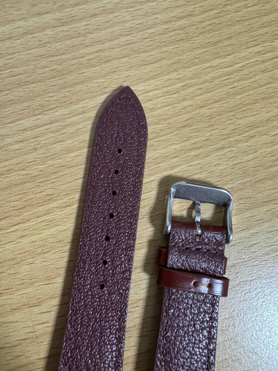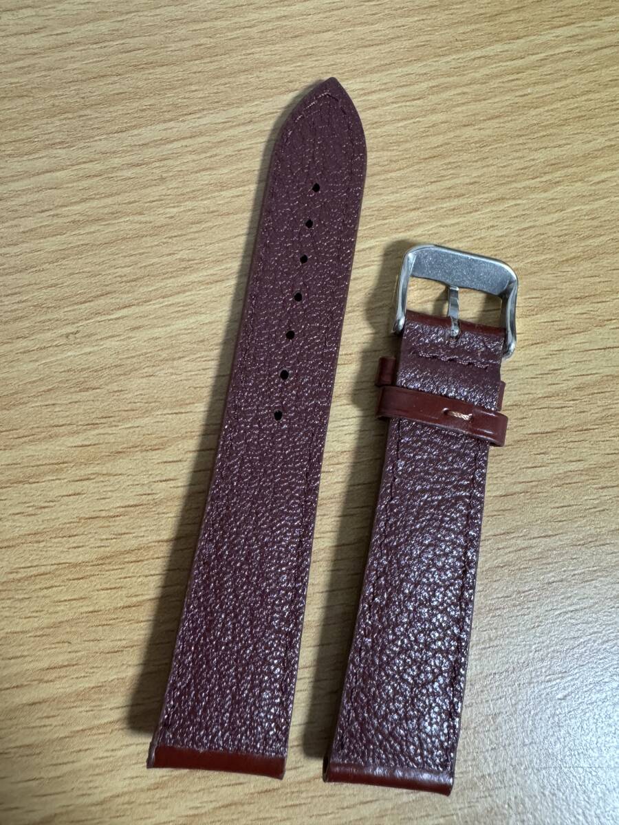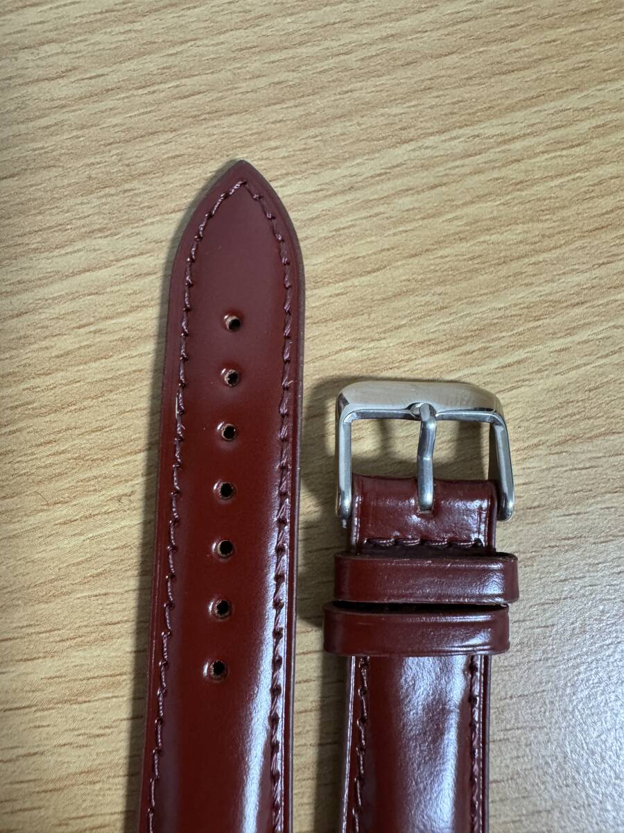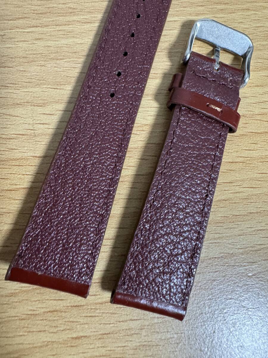 本物●新品 コードバン 時計ベルト ラグ幅20mm 馬革 ハンドメイド 銀尾錠 肉厚感●商品紹介コードバン腕時計ベルトです。顔料を用いて、平滑な表面の上に幾重にも塗膜を重ね美しい面を表現したコードバンです。最終の着色工程では何度も調整し完璧に調色された顔料を扱う為、防塵/湿度管理まで行き届いた場所での作業です。ここでは職人も不織布のつなぎを着て作業を行なっており、 徹底したクオリティコントロールが行われています。特殊な塗膜の層が製品の使用中に起こる表面的な傷をつきにくくしながらも、透明感のある表情や使うほどに増すエイジングを楽しませてくれるコードバンです。使えば使う程、本物の良さ味が出て来ます。ハンドメイド品ですので、作りの荒い所もあるかとは思いますが、ハンドメイドの個性とお考えください。ハンドメイドに理解頂けない方は、入札をお控えください。大手デパート等での購入をお勧め致します。■素材表: コードバン裏:羊革(イタリア産 耐汗加工)■色ワイン■状態新品未使用品■サイズ時計取り付け幅 20mm 尾錠幅 18mm(厚み 6㎜、6時側 118mm 12時側 75mm)●コンディション:【10】※銀尾錠は脱着可能です。ご希望される方は、取引メッセージ欄にお申し付けください。◆コンディション説明◆【10】・・・ 未使用、新品です。【9】 ・・・数回使用程度で、新品同様です。【8】 ・・・少し使用感がありますが、ヨゴレやダメージが見られない、極美品です。【7】 ・・・多少の使用感がありますが、大きなヨゴレやダメージが見られない、美品です。【6】 ・・・それなり使用感があります、ヨゴレ、キズが見られますが、一般的な中古品です。【5】 ・・・不良品箇所があります、ジャンク品です。 | |||||||