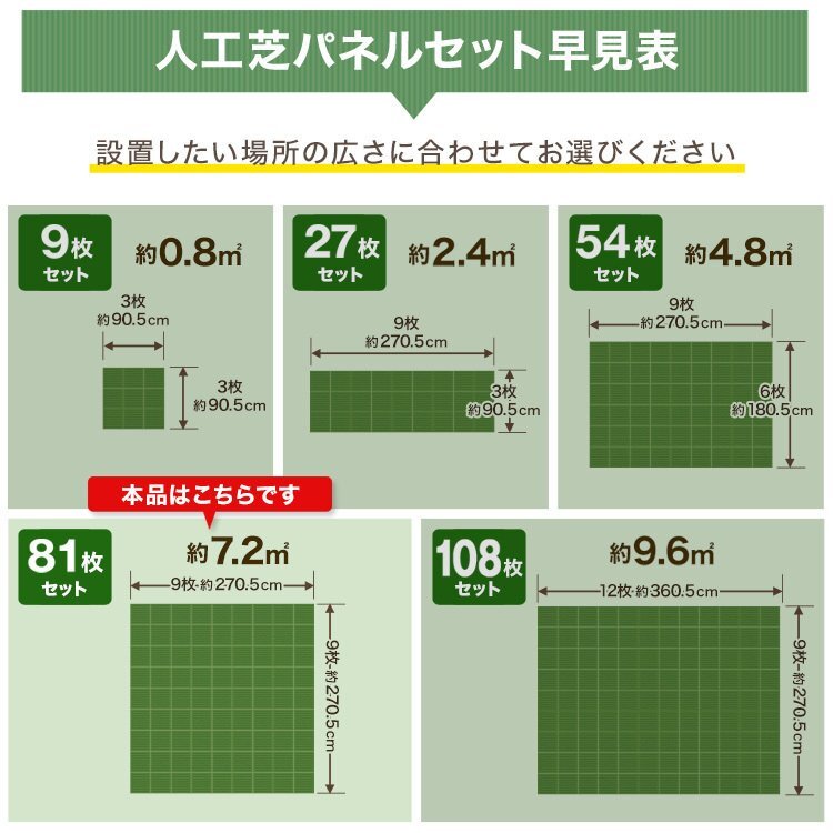 素足で歩きたくなるやわらかさ。 本物の天然芝と見間違えるほどのリアル感! パネルタイプの人工芝です。 ジョイント式で簡単設置! 人工芝なので枯れる心配も無ければ、メンテナンスもほぼ不要。 年間を通してきれいな緑が素晴らしい景観を保ちます。 水抜き穴が空いているので水が溜まる心配はありません。 屋外用の照明やイルミネーションなどの配線を裏面の隙間に通すことも可能です。 のこぎりや園芸用の大型ハサミでカットできるので自由に配置も可能です。 ジョイント式タイプのものと組み合わせ自由♪ 大切なお庭のアレンジにぜひお役立てください♪ 【商品仕様】 ●内容 人工芝パネル × 81 ●サイズ 人工芝部分の寸法:(約)幅29.5cm×長さ29.5cm×高さ3cm ジョイント部分を含めた寸法:(約)幅30.5cm×長さ30.5cm×高さ4cm ●重量 1枚あたり:(約)0.35kg ●適用箇所 屋外(テラス、バルコニー、庭等) 【注意事項】 ・海外製品のため多少の傷、汚れがある場合がございますがご了承ください。 ・商品は、モニターによって色合いが異なって見える場合があります。 ・仕様・デザインは改良のため予告なく変更することがあります。 保証期間 7日 ※使用開始時期や使用期間に関わらず、お買い上げ日から7日間です。 商品到着後から7日を過ぎますと、交換の際の往復送料はお客様負担となりますのでご了承ください。 場合によっては対応出来ないケースもございます。 |