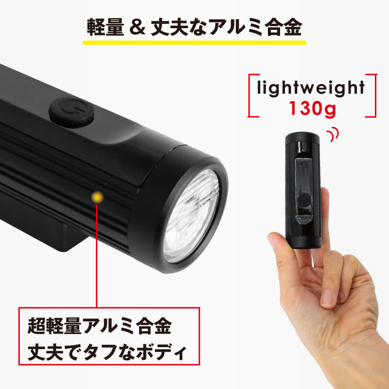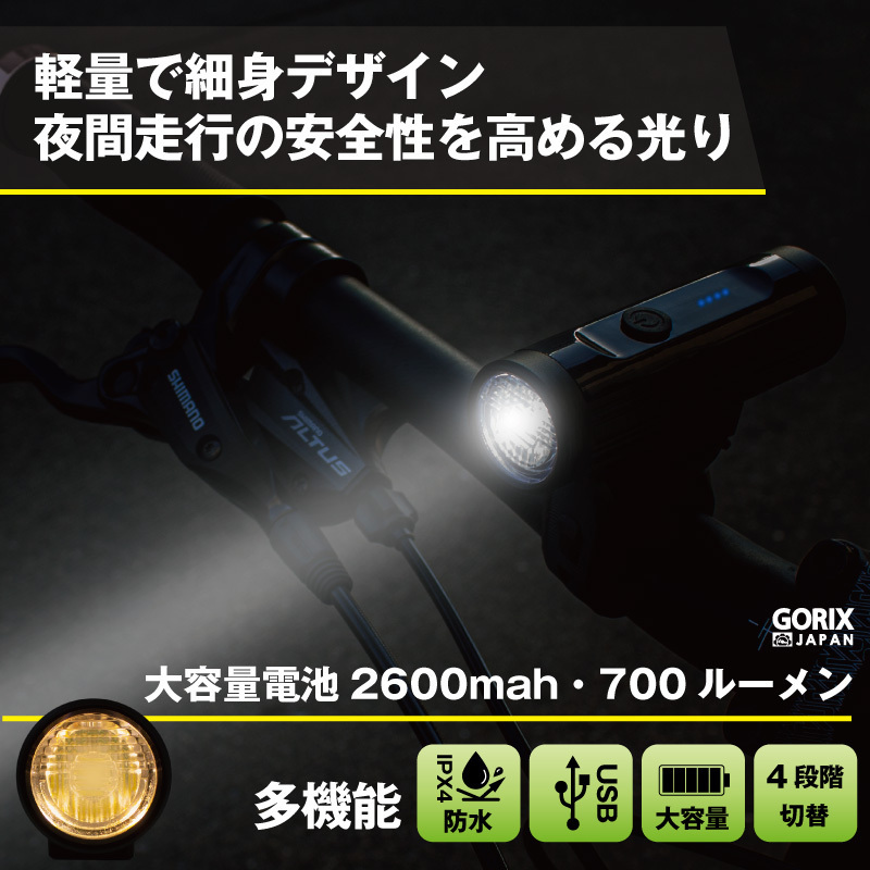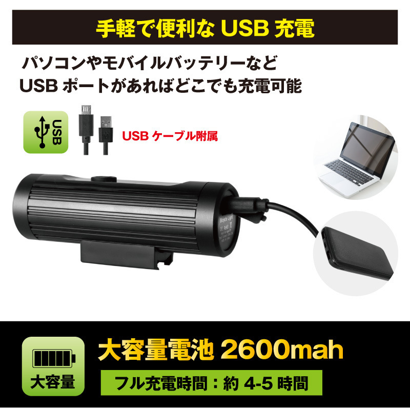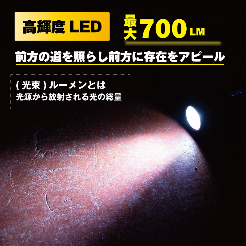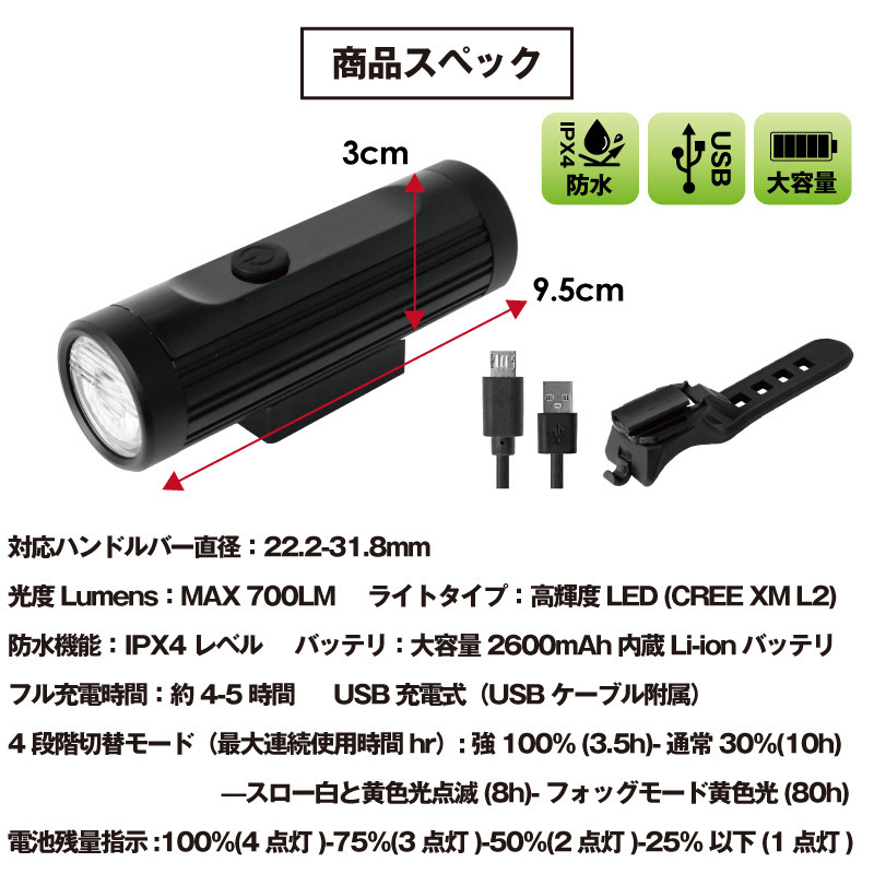 | 細身なスマートデザインの自転車ライト コンパクトな形状で自転車のビジュアルを邪魔しない ロードバイクやクロスバイク、マウンテンバイク、ママチャリなど様々な自転車に最適です。 ライト本体の取り外しが簡単なので取り外す事で盗難防止に。 また非常時の懐中電灯にもなります。 ・防水機能IPX4で急な雨や天候に左右されない ・USB充電式で気軽に使える ・電池残量が一目で分かるので充電タイミングを逃さない ・大容量電池2600mah ・超軽量アルミ合金でタフなボディ ・4パターン切替で状況に応じて選択できる ・珍しい淡黄光搭載 ・高輝度LEDで暗闇もしっかり明るい ・最大700ルーメン ・バンド式で簡単取付け 付属USBケーブル、ブラケット 材質アルミ合金ライト、ABSブラケット 本体サイズ長さ9.5cm 直径3cm 本体重量130g 対応ハンドルバー直径22.2-31.8mm 光度LumensMAX 700LM ライトタイプ高輝度LED (CREE XM L2) 防水機能IPX4 レベル バッテリ大容量2600mAh内蔵Li-ionバッテリ フル充電時間約 4-5時間 充電タイプUSB充電式(USBケーブル附属) 4段階切替モード (最大連続使用時間hr)強100% (3.5h)-通常30%(10h)―スロー白と黄色光点滅 (8h)- フォッグモード黄色光 (80h) 四段階電池残量指示機能100%(4点灯)-75%(3点灯)-50%(2点灯)-25%以下(1点灯) 《ご注意》・商品は入荷によりキズがある場合があります。 ・保証対象外になりますのでご了承お願い致します。 ・ディスプレイ環境により実物と色が異なる場合が有ります。 ・入荷時期により予告無く一部仕様変更する場合が有ります | |