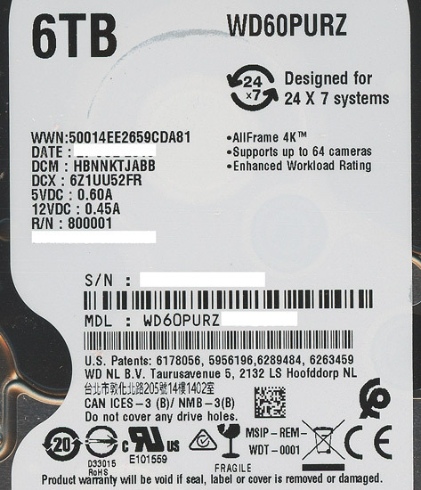 Western Digital製HDD WD60PURZ 6TB SATA600 5400 2000~3000時間以内 | |