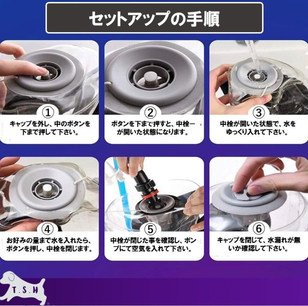 ☆  メモリに合わせてお好みの量の水を入れ、重量を調整して下さい。その後、専用ポンプにて空気を入れて、しっかりと蓋をして下さい。
