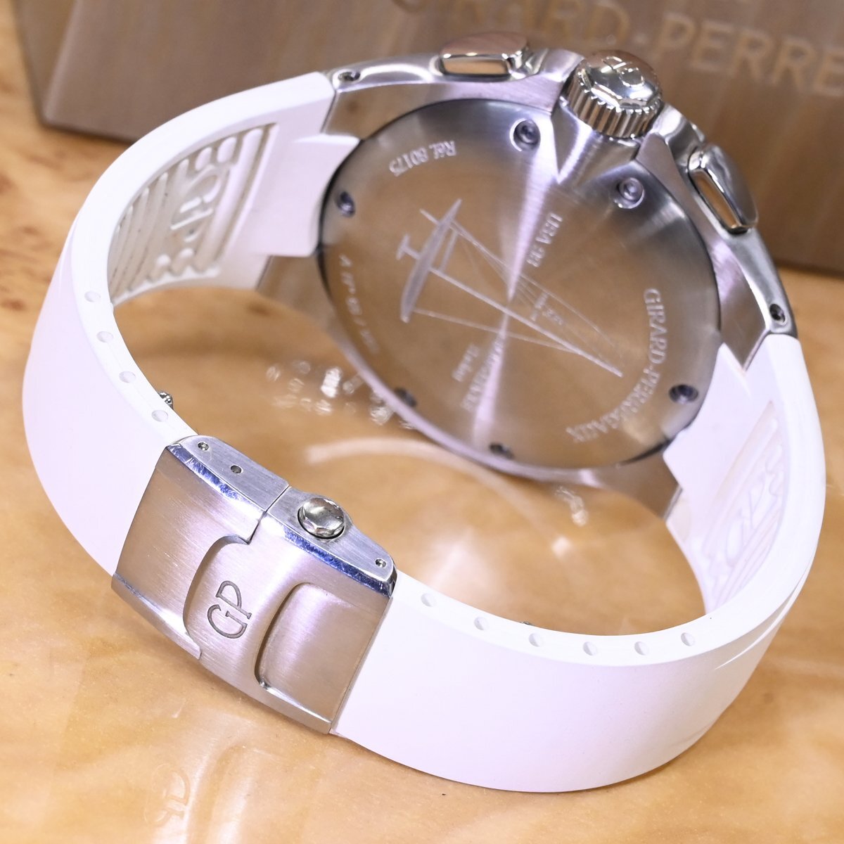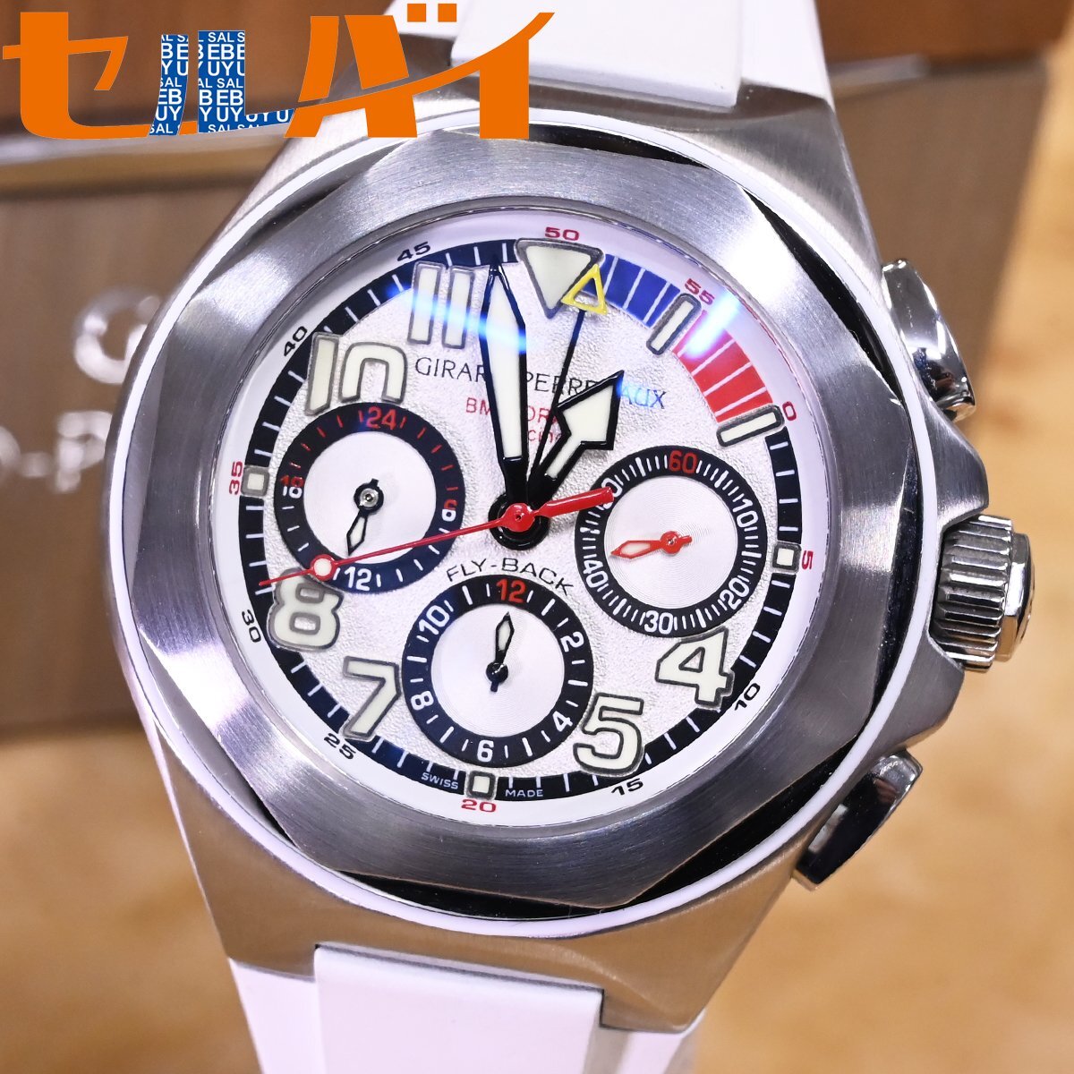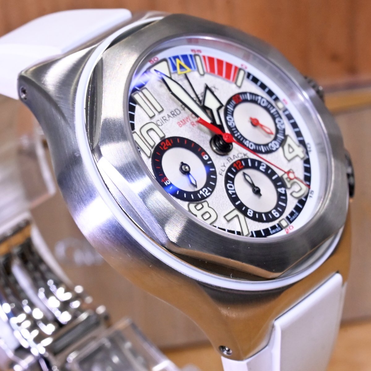 ジラール・ペルゴのフライバック クロノグラフ ロレアートです。 世界のセレブの間で人気の高い、ヨットレースの最高峰「アメリカズカップ」。 八角形のベゼルが特徴のロレアートに、ヨットレースのルールである10分間カウントダウンスタートを追加。 さらにフライバック クロノグラフまでも搭載した多機能モデルです。 市場にも全く出て来ないモデルなのでお探しの方も非常に多いかと思います。 ※基本動作確認済。 |