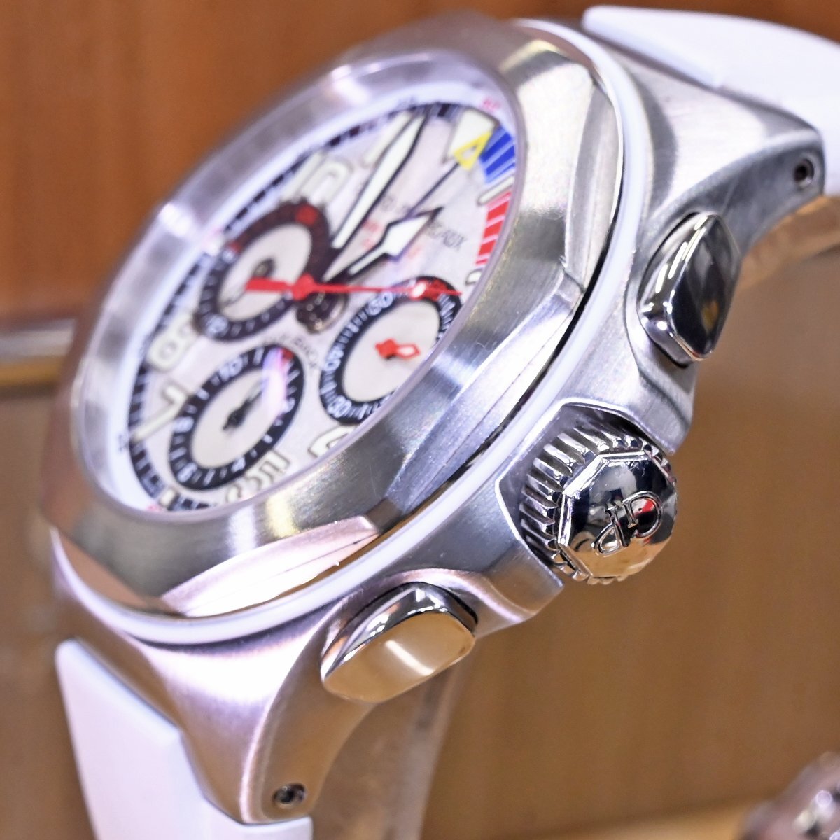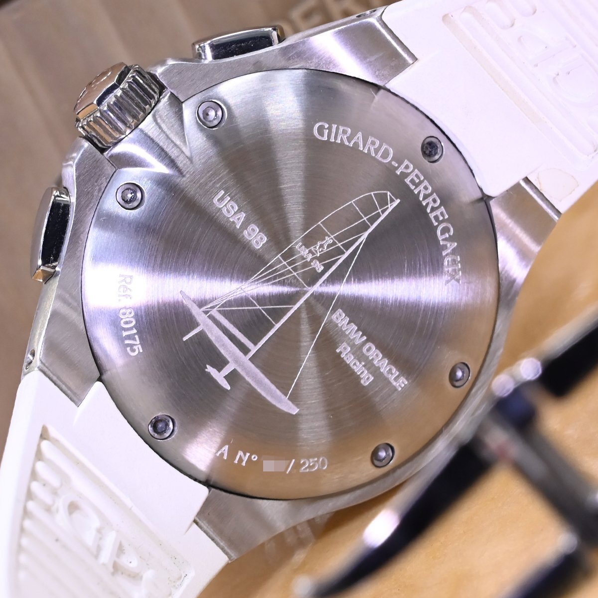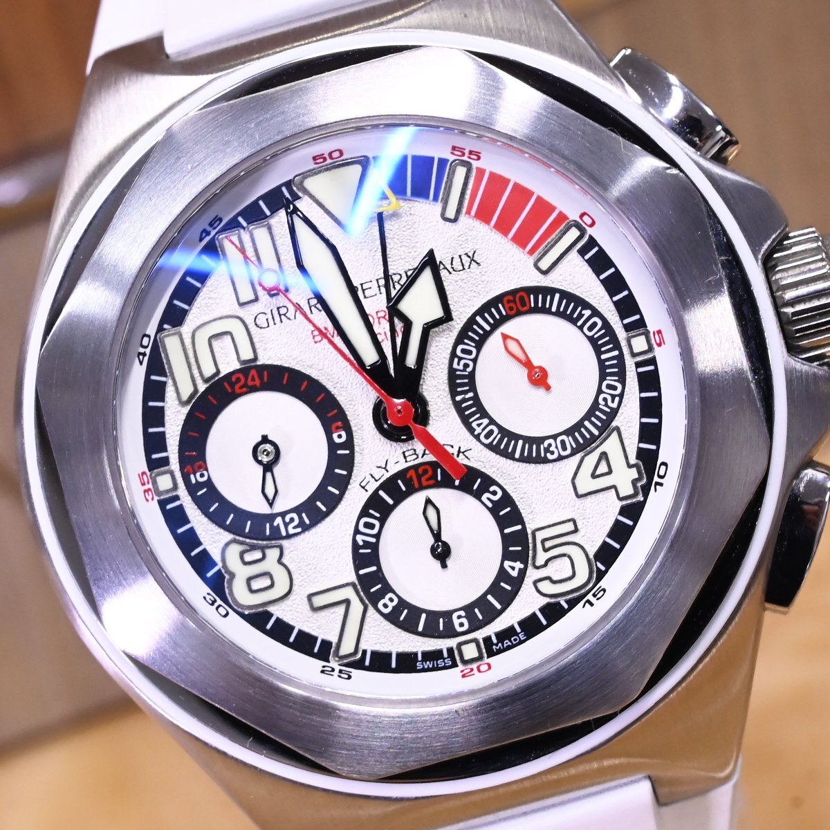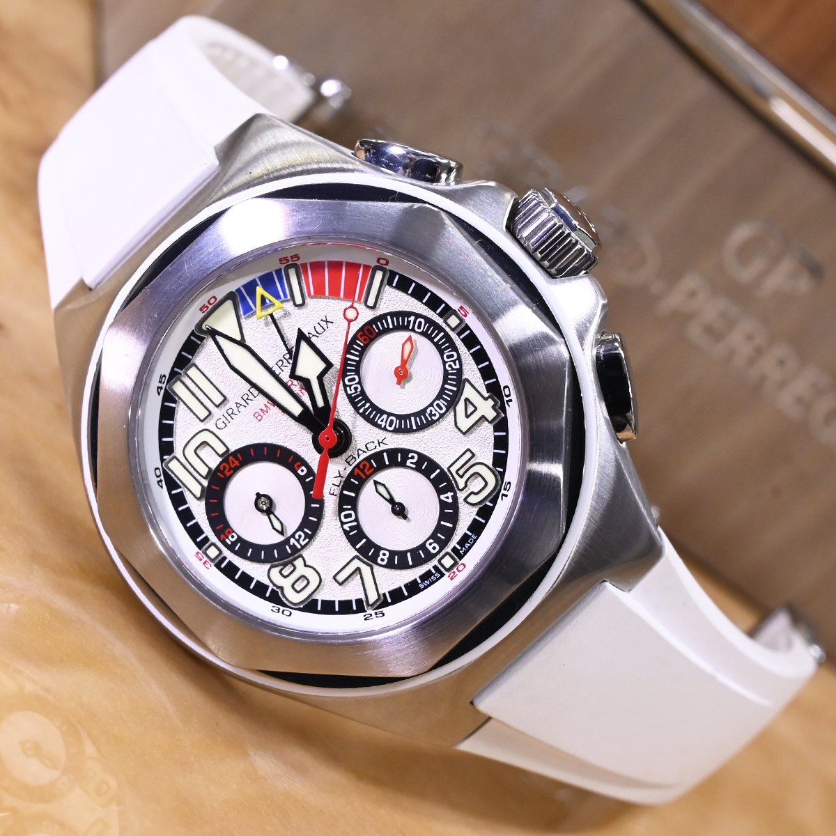 ジラール・ペルゴのフライバック クロノグラフ ロレアートです。 世界のセレブの間で人気の高い、ヨットレースの最高峰「アメリカズカップ」。 八角形のベゼルが特徴のロレアートに、ヨットレースのルールである10分間カウントダウンスタートを追加。 さらにフライバック クロノグラフまでも搭載した多機能モデルです。 市場にも全く出て来ないモデルなのでお探しの方も非常に多いかと思います。 ※基本動作確認済。 |