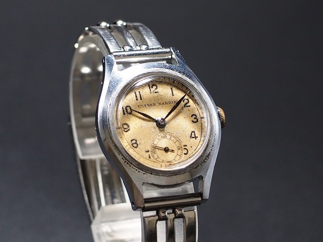 ※入札前に画像や商品説明等をご覧になって下さい。 【製造年代・ムーブ】 1940年頃手巻き 【特徴・セールスポイント】 1846年にスイスのル・ロックルに創業の、老舗高級時計メーカーユリスナルダン。 ひとつつとして同じものはない、一点もののユリスナルダンのアンティークモデルのご紹介です。 経年により色づいたエイジング文字盤、アラビア数字のインデックスに青焼きのリーフ針は、洗練された上質なアンティークナルダンの魅力を感じさせます。 現行の腕時計にはない、アンティークの魅力がたっぷり詰まった貴重な一本です。 【コンディション】 ダイヤル(文字盤)は経年を感じるアンティークダイヤルです。 ケース・裏蓋は経年等ありますが古いものとしては概ねきれいな状態です。 風防は概ねきれいな状態です。 社外品の当時モノのベルトをお付けしております。 ※数時間程度の稼働確認しておりますが古い時計の状態は自然に変化致しますので性能や長時間の稼働等について商品到着後の補償は出来かねます。その他輸送に起因する破損や商品到着後の一切の不具合については補償出来かねます。何らかの不具合があった場合は落札者様のご負担で修理等してお使いください。また入札や落札された場合はこの点についてご理解いただけたものと判断させていただきます。 【サイズ】 縦約38.0mmラグ含む/ 横約290mmリューズ含まず/ラグ幅約15.0mm |