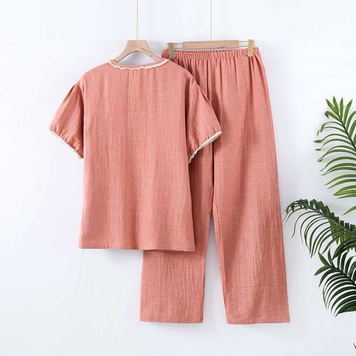 飽きのこない優しい色の無地カラーとベーシックなシルエットで、長く愛用いただけるパジャマです。カジュアルな風合いと心地よい肌触りは、お風呂上りや部屋着などリラックスタイムのルームウェアにぴったりです。