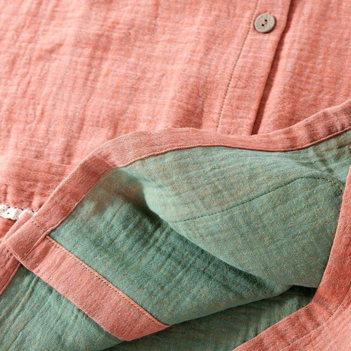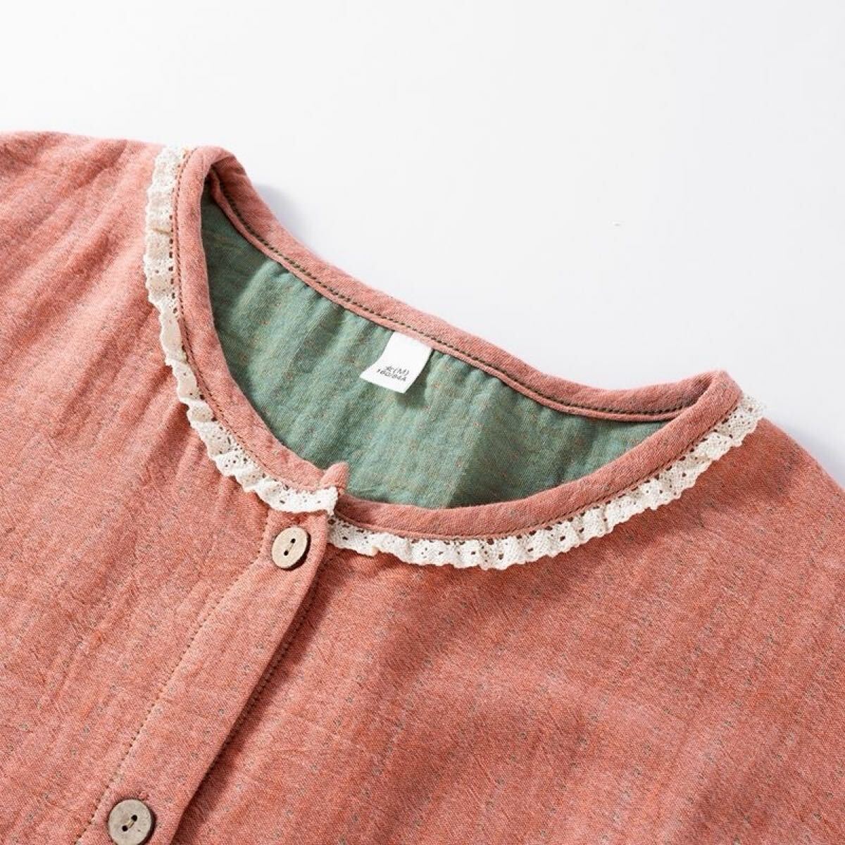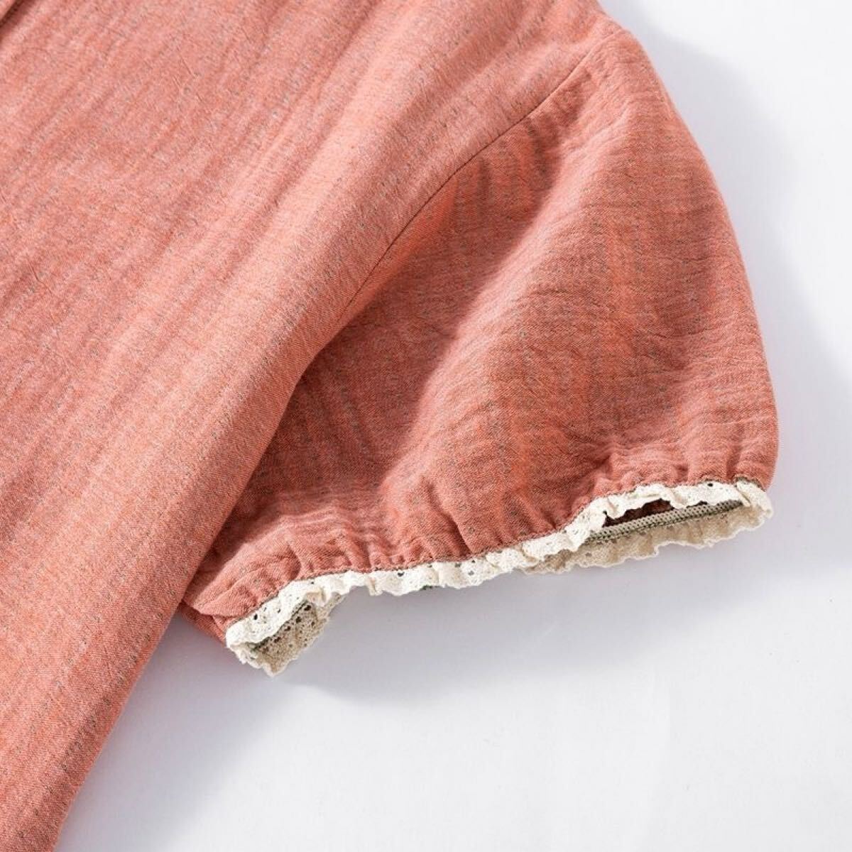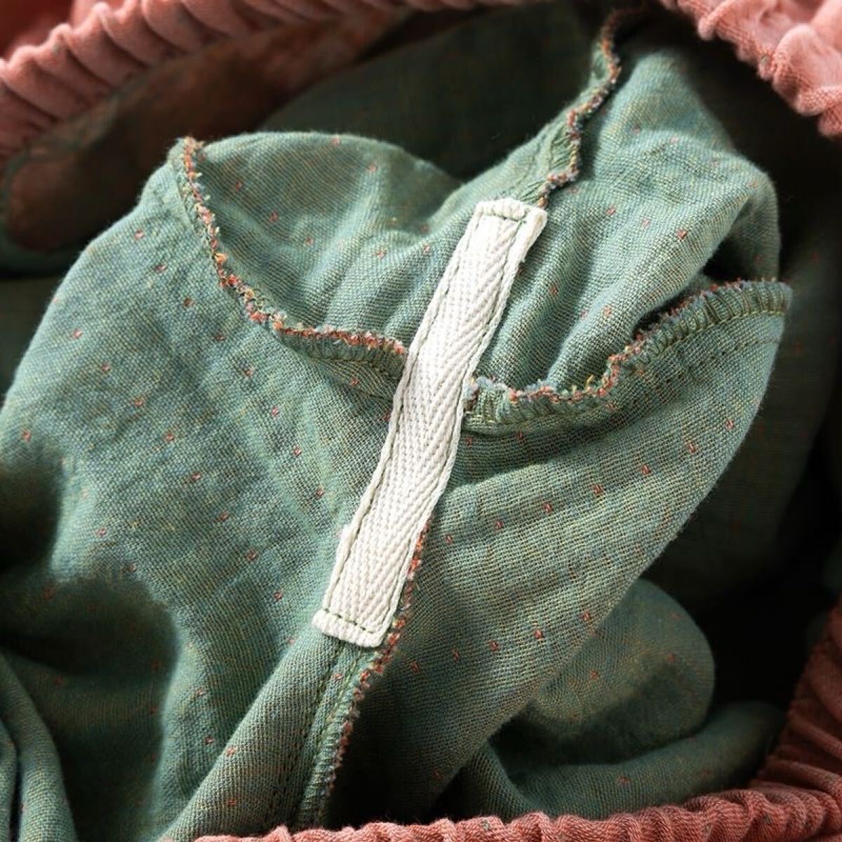 薄い綿のガーゼ生地が2枚の二重構造になっているダブルガーゼ仕様で生地と生地の間に空気の層が生まれるので通気性抜群、お風呂上りにも気持ちの良い素材です。