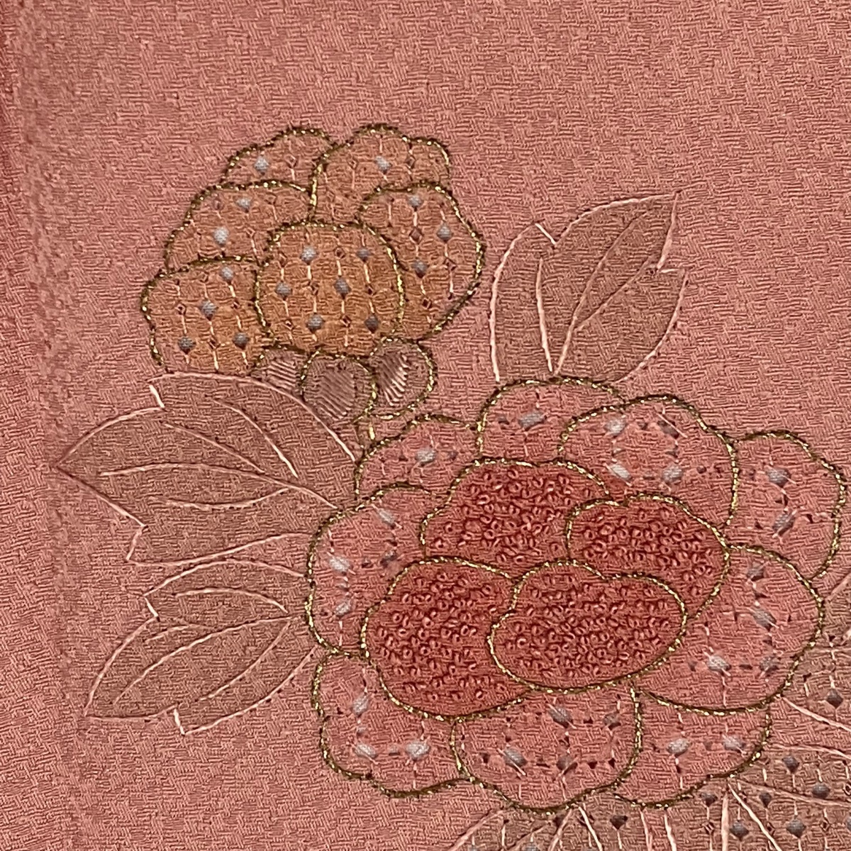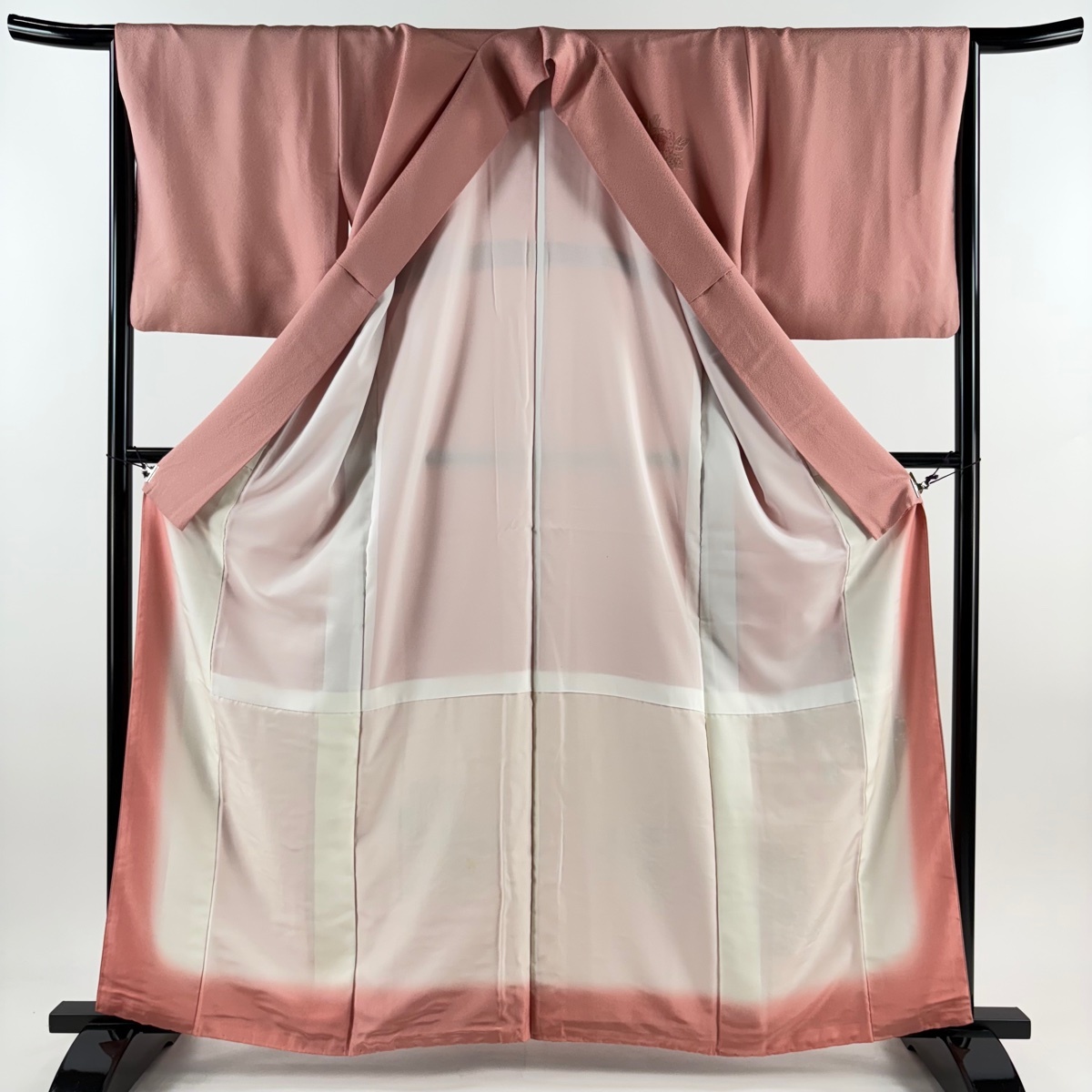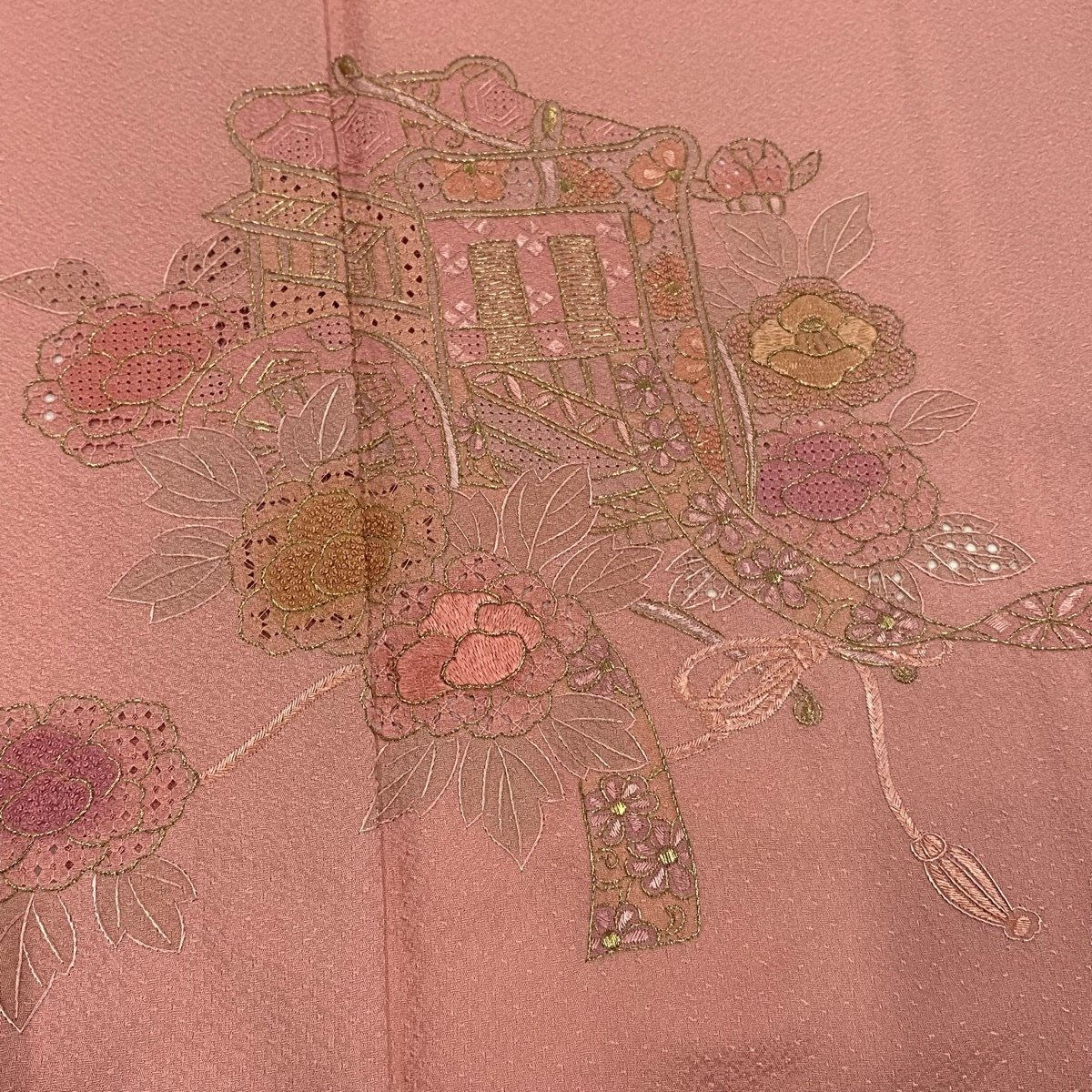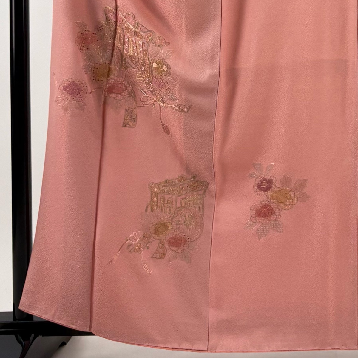 | 付下げ 秀品 御所車 牡丹 刺繍 金糸 ピンク 袷 身丈162 裄丈66 M 正絹 【中古】 |