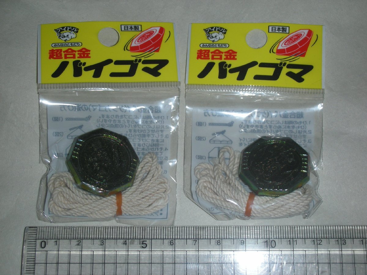 関西版ベーゴマ バイゴマ2個セット 関西版ベーゴマバイゴマ2個セットです。 関東では、ベーゴマでも関西のけんか独楽といえば「バイ」が本当の本物です。関西出身の方は、懐かしいのではありませんか?現在、子供に人気のベイブレードなどの元祖的存在超合金?です。この商品は当時物ではありません、発売会社が変わり、現在、製造販売されている物です。当時物との違いは「柄・絵」は(現在、プロレス柄は有りません。)や漢字、蛇などの柄になっておりますが、「柄・絵」はその時により違います。柄や絵に関してはNC.NRでお願いします。 柄・絵のある商品ですがアトランダムに選ぶので、お客様のリクエストにはお応えできません。