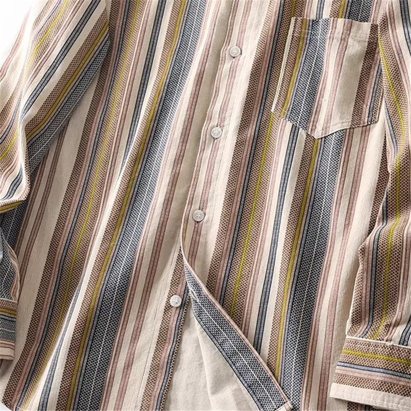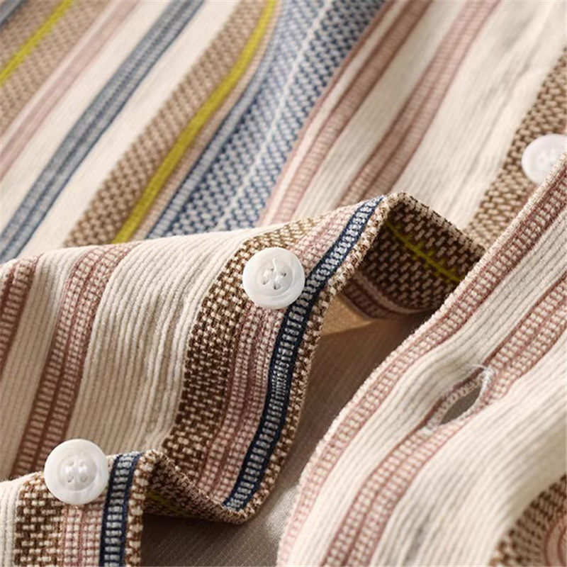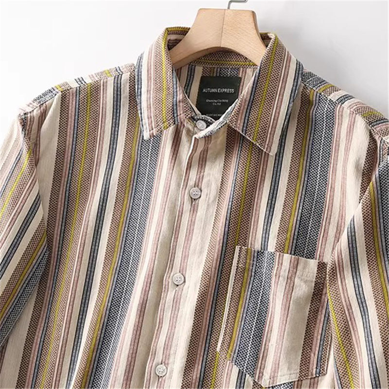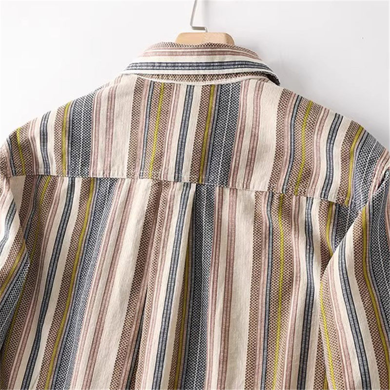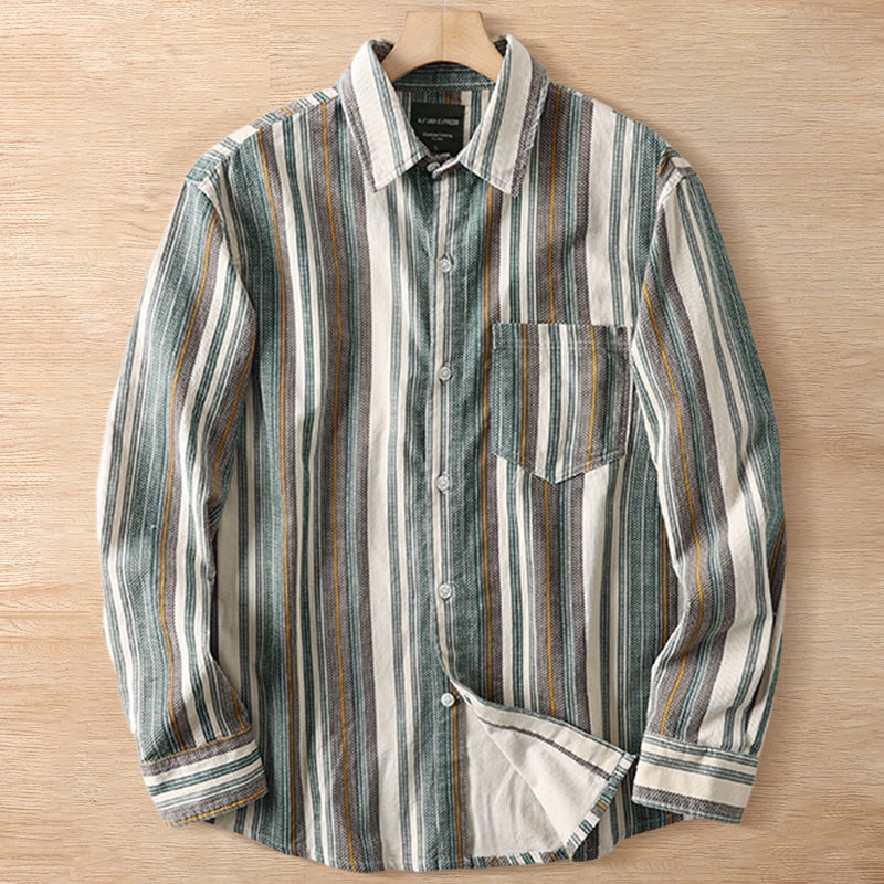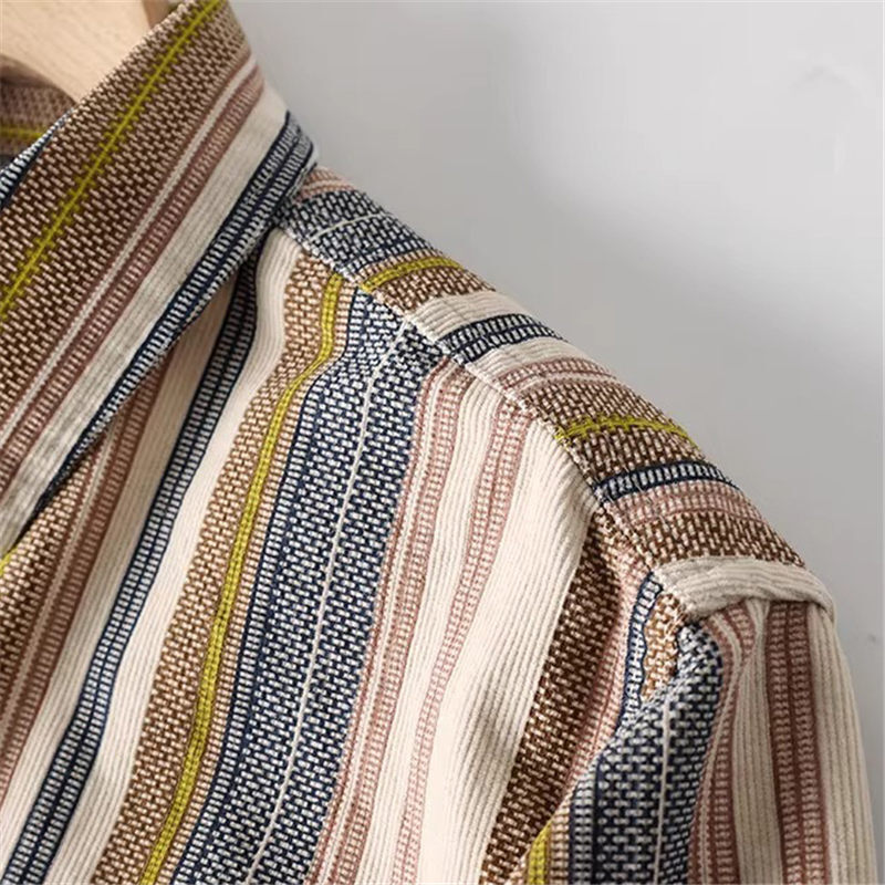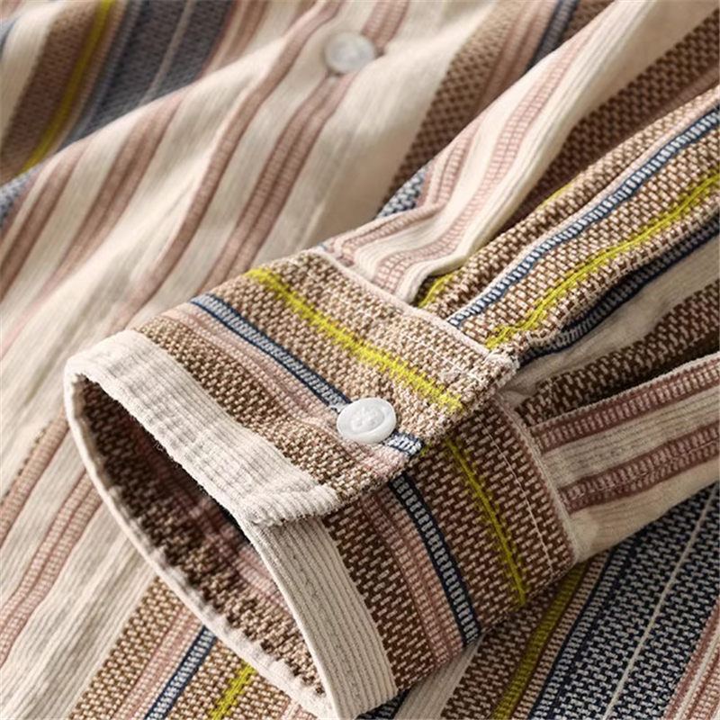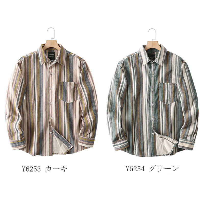ナチュラルなアイボリーをベースに、グリーン・ブラウン・イエローのストライプがアクセントになった、ヴィンテージ感漂う長袖コーデュロイシャツです。