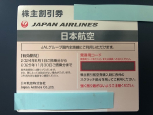 日本航空株主優待券 1枚 有効期限:2025.11.30までに搭乗 番号通知のみ