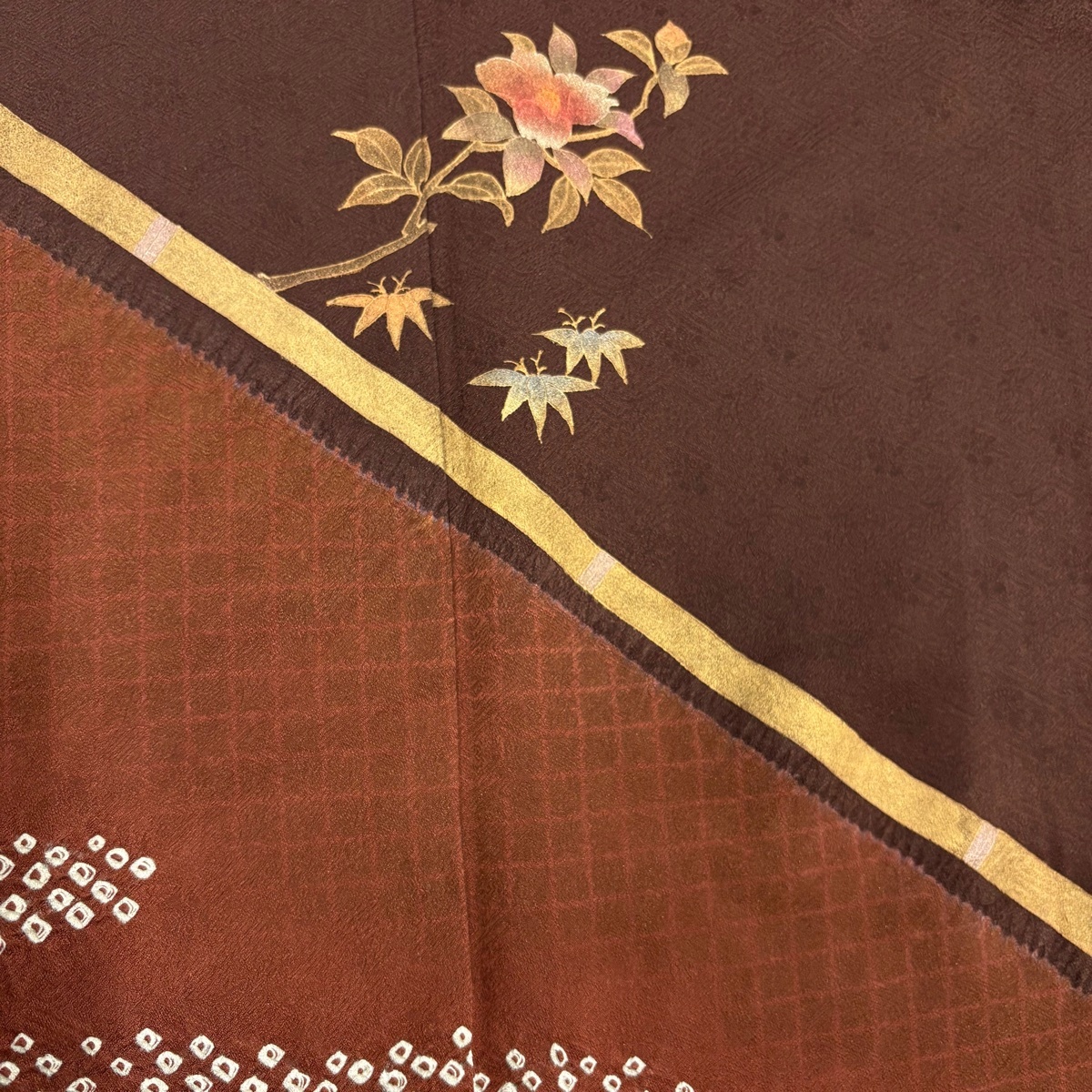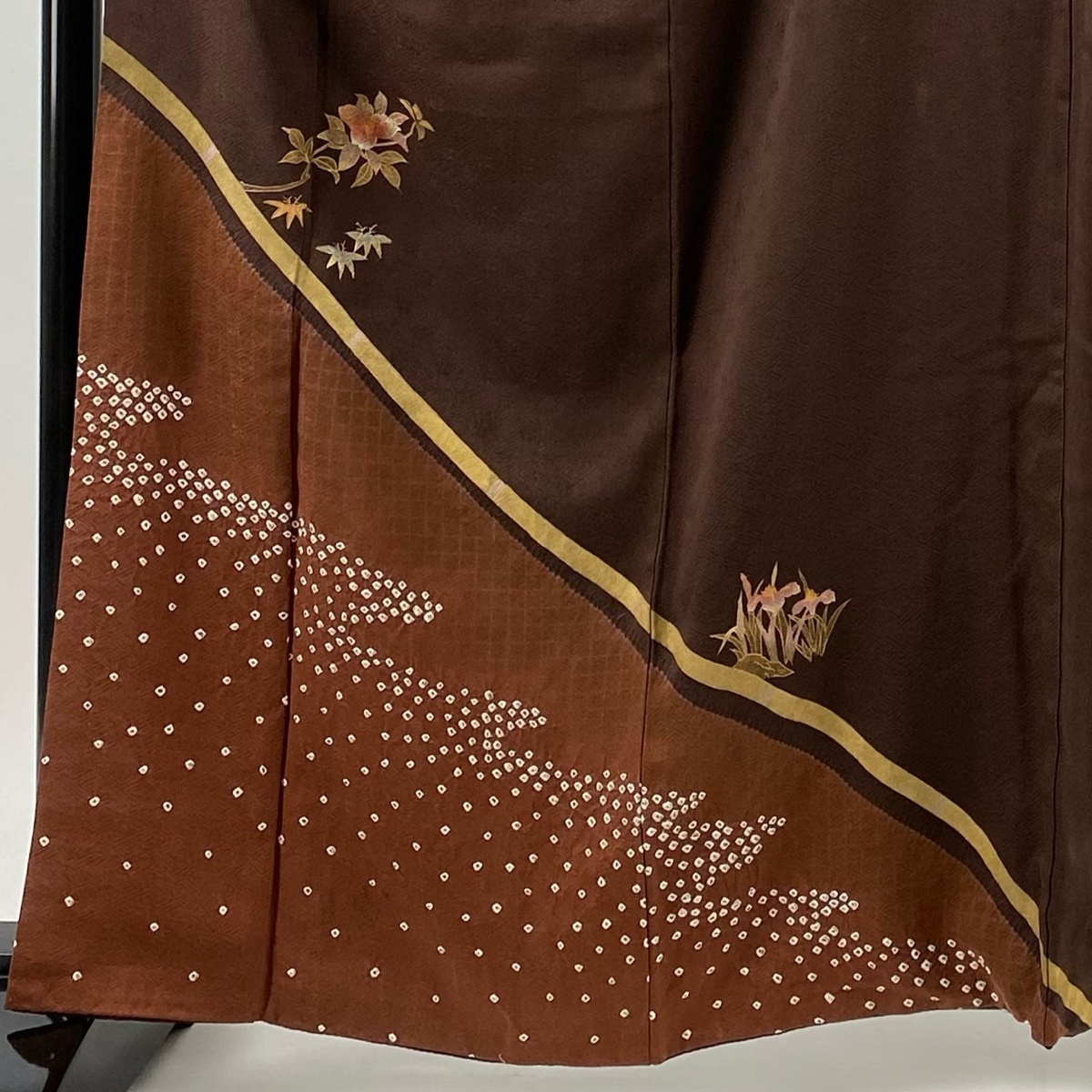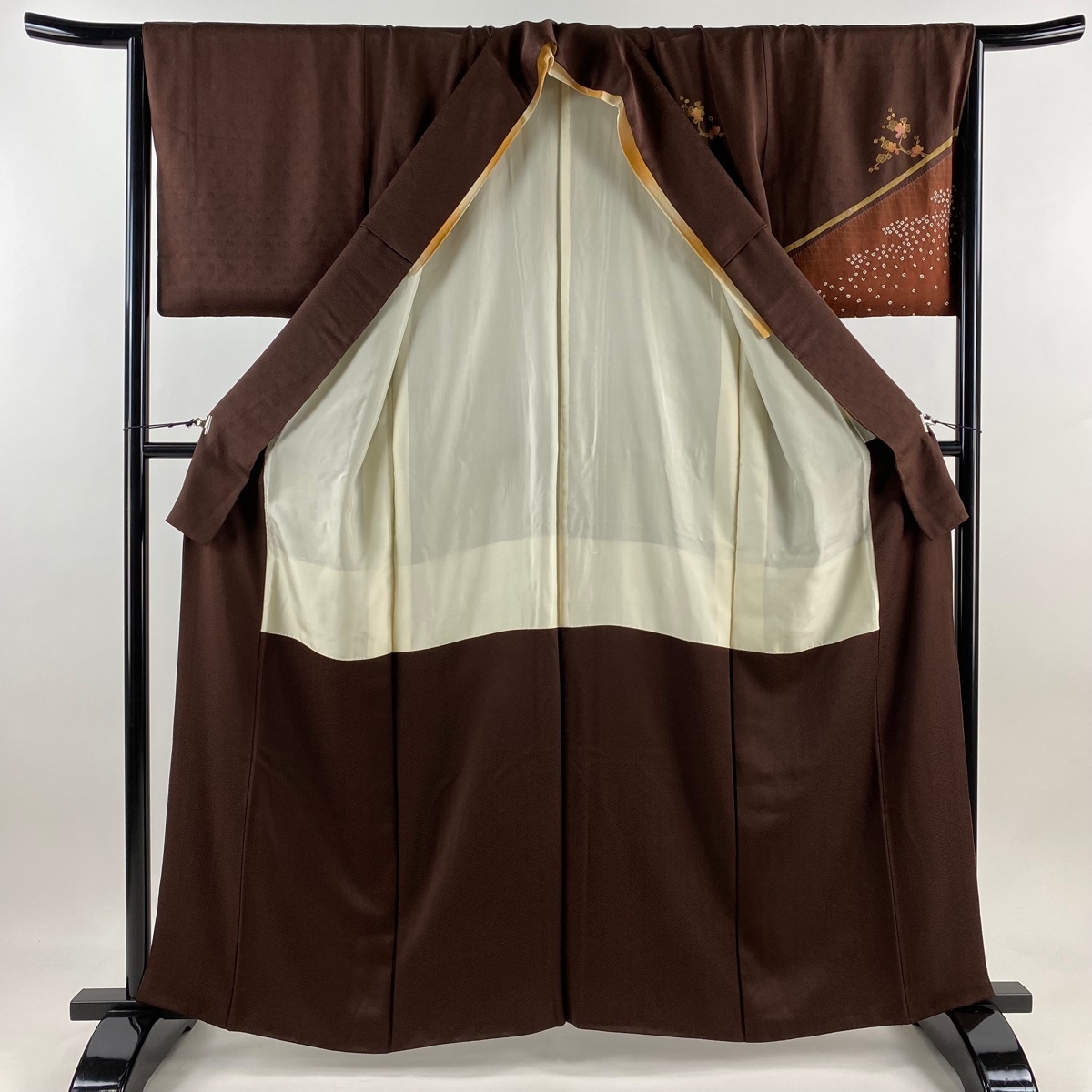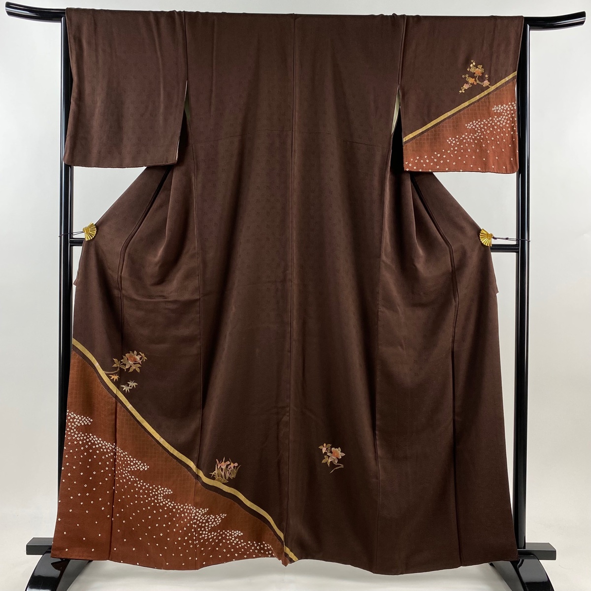 | 付下げ 秀品 枝花 霞 金銀彩 絞り 茶色 袷 身丈162 裄丈66.5 M 正絹 【中古】 |