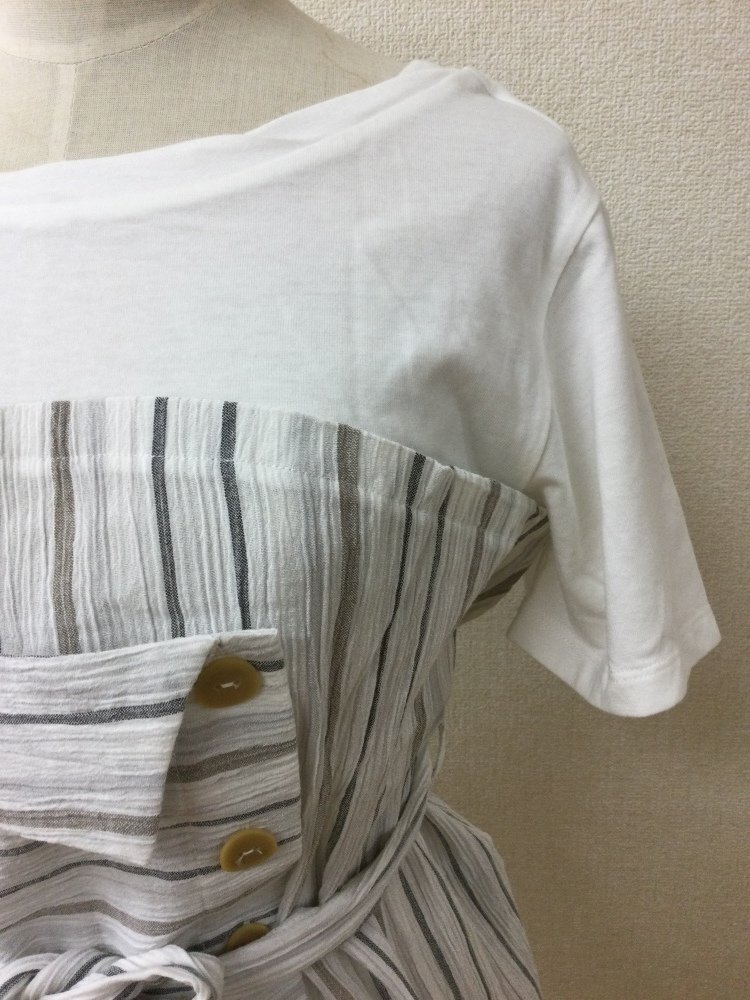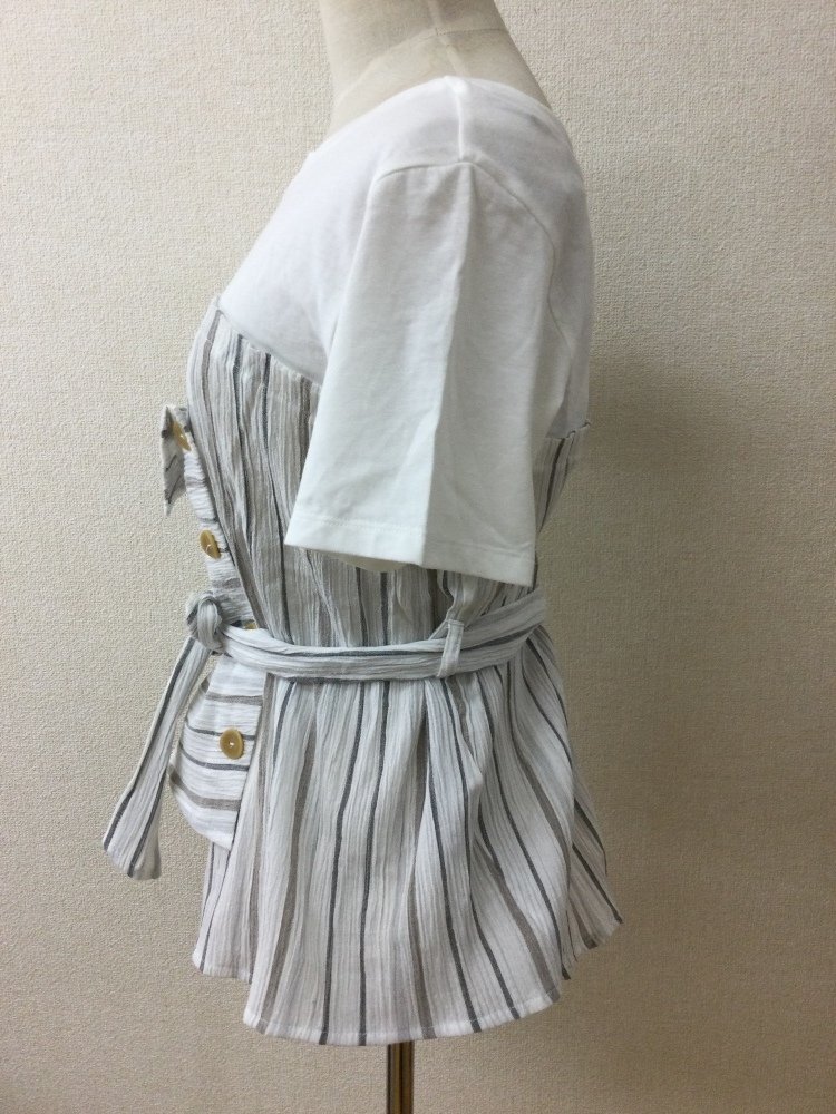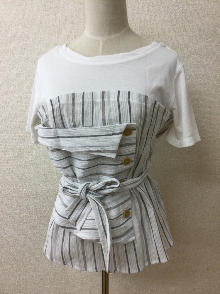 管理番号:10^133134 マウジー タグ付き未使用 重ね着風カットソー 白Tシャツにグレー系ストライプ 表示サイズ:S 実寸(参考)
