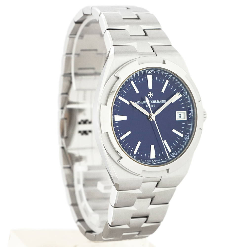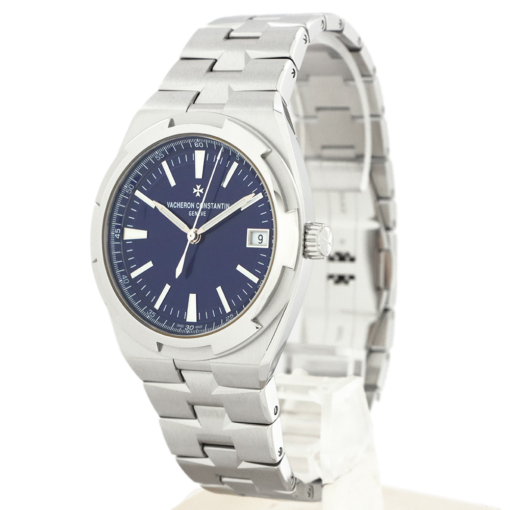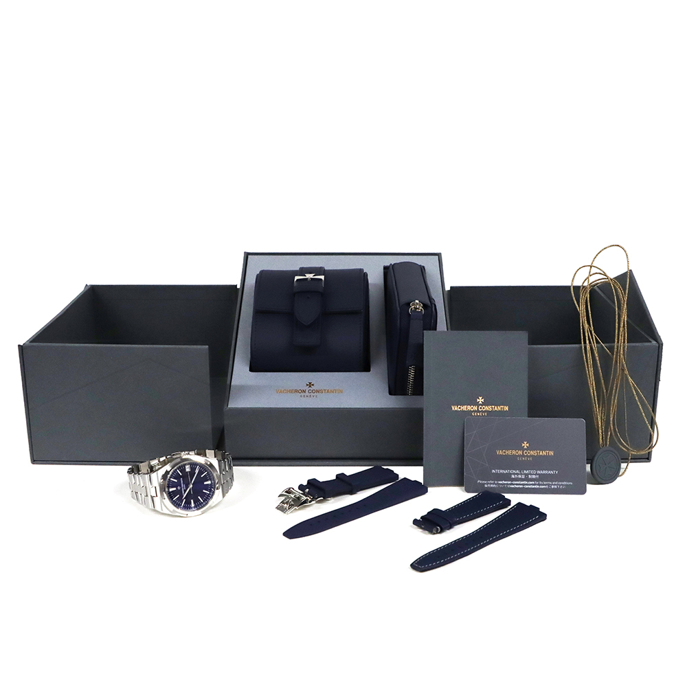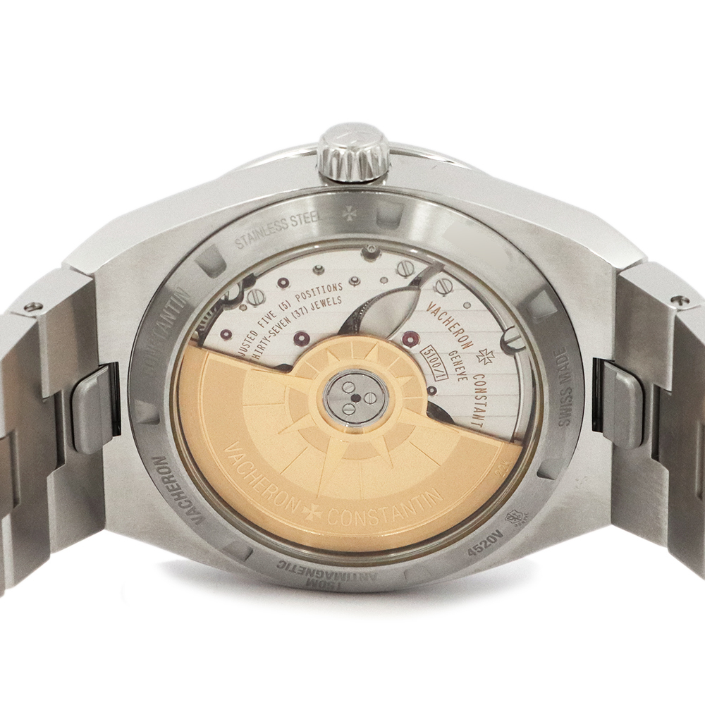 こちらはオーヴァーシーズ 4520V/210A-B128です。素材にはステンレススティール、文字盤にはブラス(真鍮)素材の鮮やかなブルーカラーとなっており、非常に上品な色合いとなっております。ムーブメントには前作同様、ヴァシュロン・コンスタンタンが設計から開発、製造までを自社で完全に行ったCal.5100(ジュネーブ・シール取得)を搭載。また、インターチェンジャブル・システムによる交換時のボタンが改良された事で、よりお客様自身がベルトの交換を容易に行えるようになっており、バックルの仕様も変更されております。世界最高峰の技術が凝縮された腕元に身に着ける喜びを与えてくれる最高の逸品をぜひこの機会にご堪能ください。