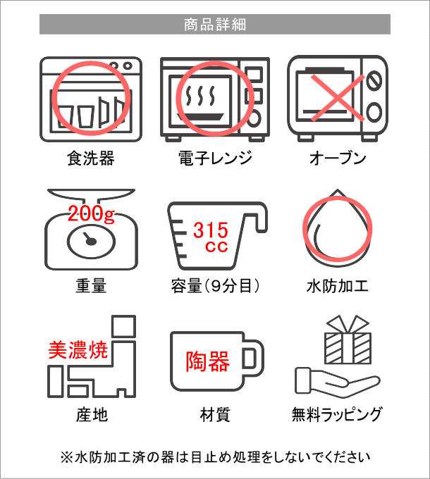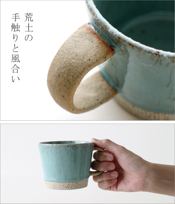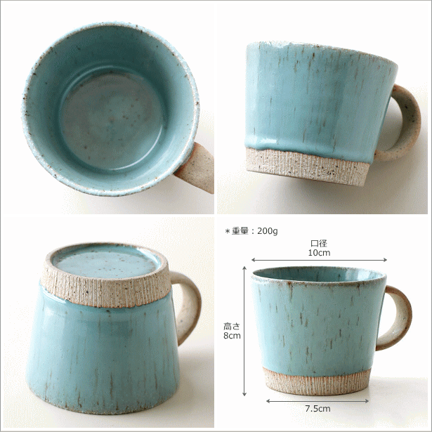 美しいターコイズブルーのカップに 細い線を削った化粧土を裾に巻いた とってもお洒落な美濃焼のマグカップ 山から掘り出した、 粘土に細かい石が入った天然土である 「荒土」を使用し 昔ながらの製法を 受け継いで作られる土物の器は 風合いや味わいのある 素朴な仕上がりが魅力 薄口の飲み口で 長く愛着が持てそうな優しい口当たりです 商品名 : ターコイズマグ 商品番号 : kyt8276 全体サイズ(cm) : 口径10×高さ8 容量(9分目) : 315cc 材質 : 陶器 重量 : 200g 使用方法 : 電子レンジ)○ 食洗機)○ オーブン)× 生産国 : 日本(美濃) ※水防加工済(水漏れ防止加工)のため、目止め処理は必要ありません ※ディスプレイによる色の違いはご了承下さい |