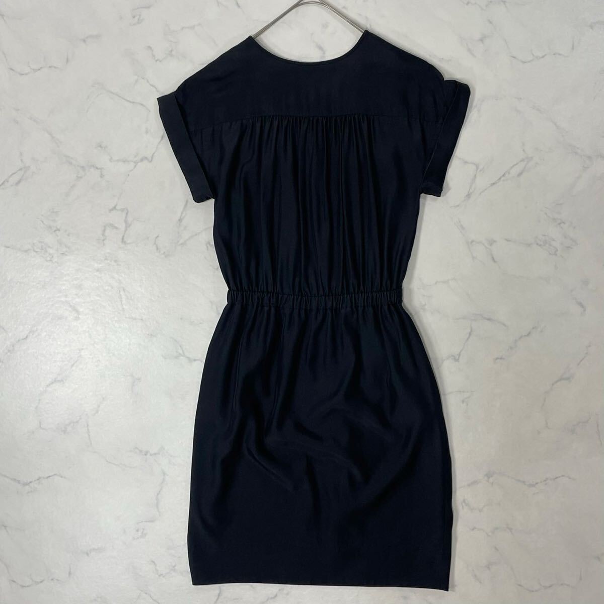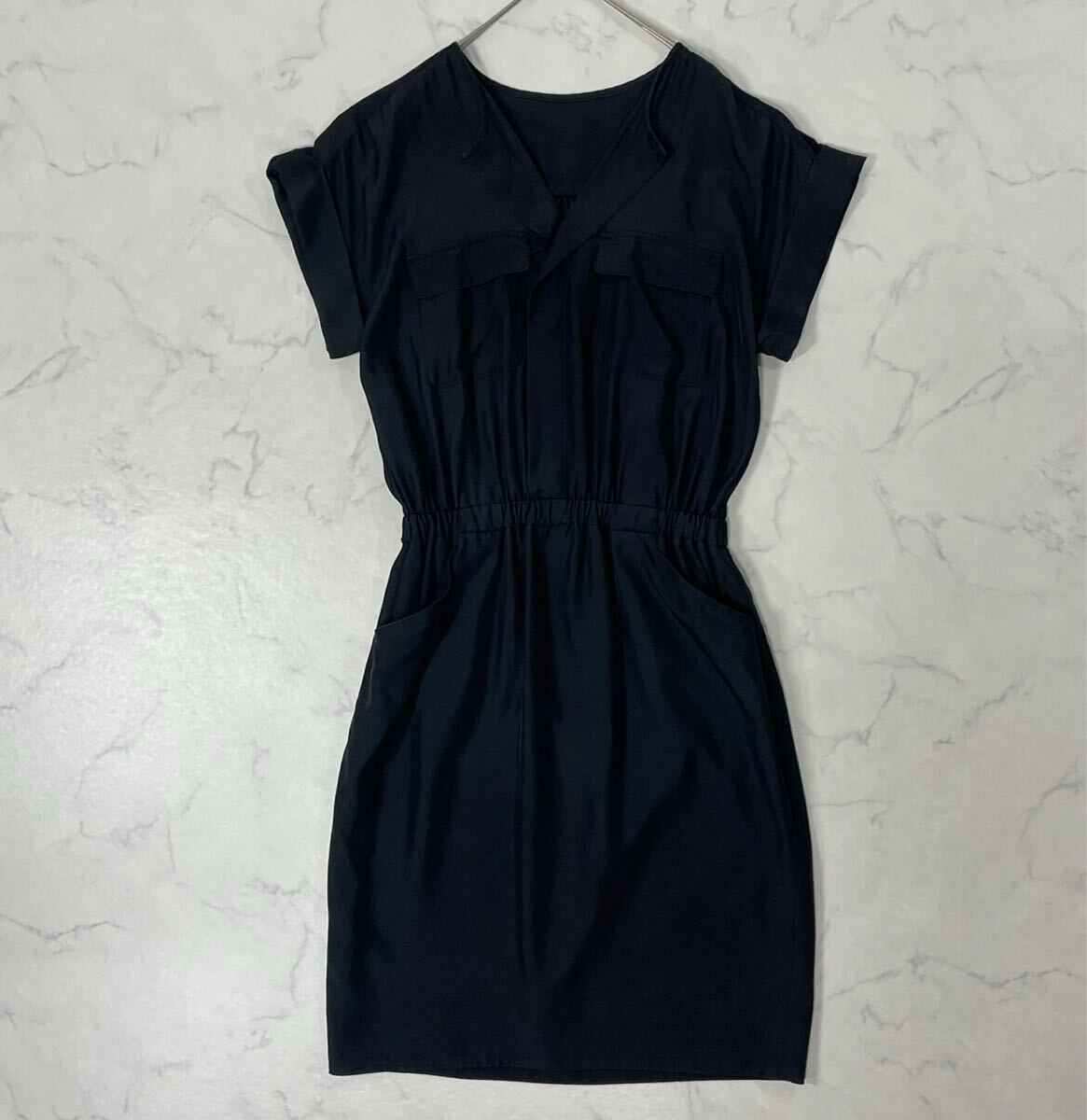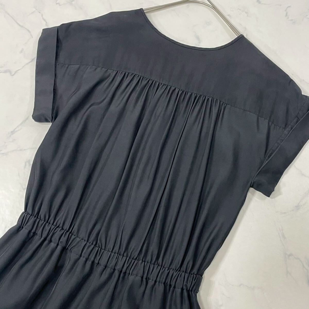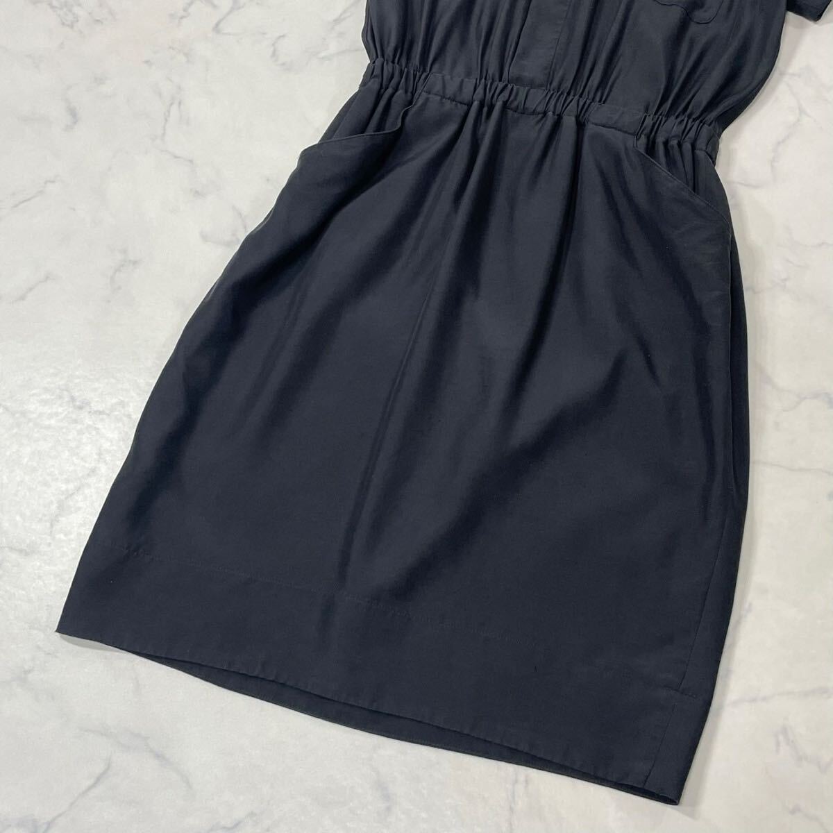 日本製 切替 ワントーン 裏地付き ウエストゴム ギャザー ポケット Vネック フレンチスリーブ ひざ丈 ワンピース
