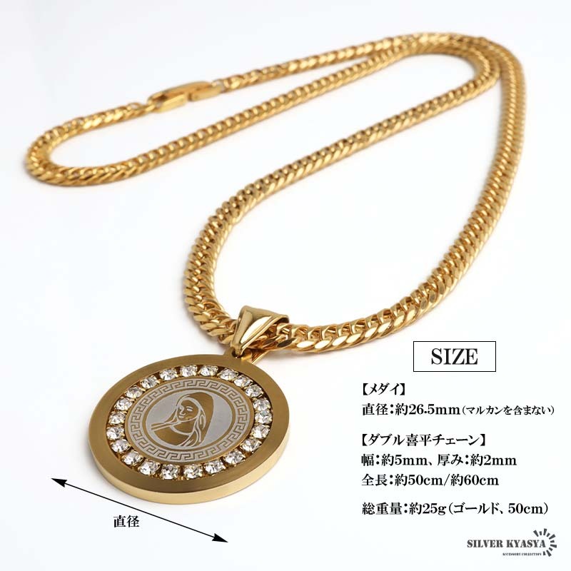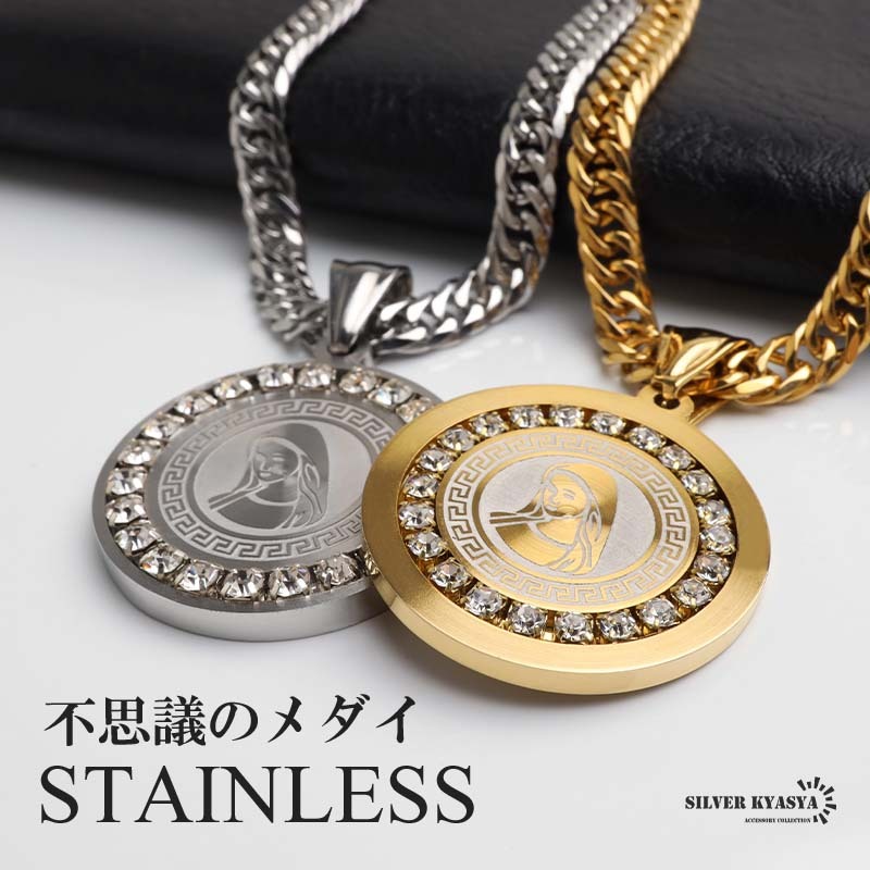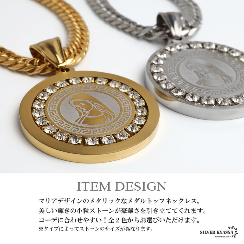 マリアデザインのメタリックなメダルトップネックレス。美しい輝きの小粒ストーンが豪華さを引き立ててくれます。コーデに合わせやすい!全2色からお選びいただけます。※タイプによってストーンのサイズが異なります。