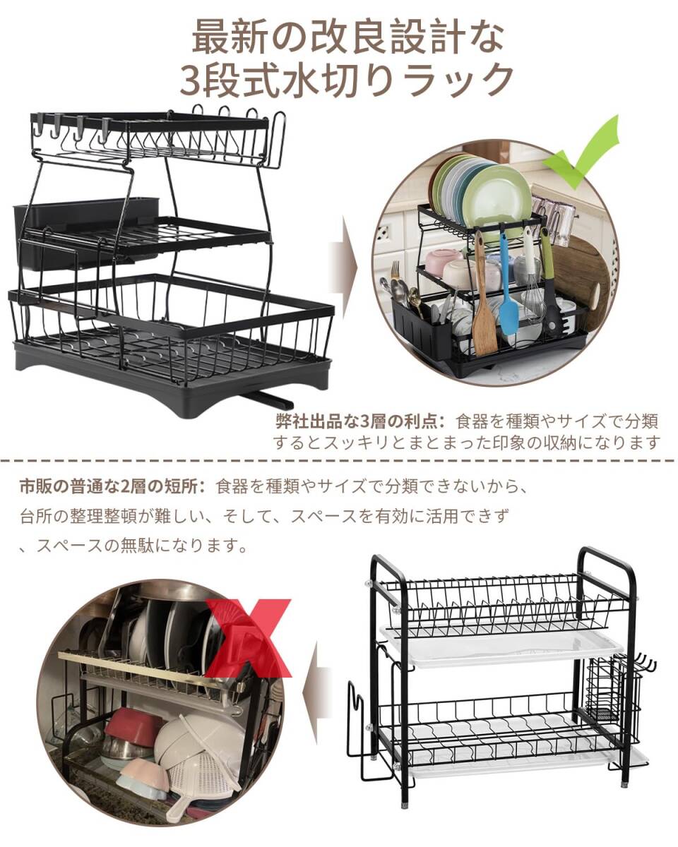 水切り ラック 食器 水切り カゴ 3段 大容量 収納 ラック【360度回転なトレー・箸立て・カップホルダー ・まな板立て・4枚の物掛けフック付き】水が流れる 食器置き場 防錆炭素鋼製 食器乾燥 キッチンラック 食器棚 水切りかご