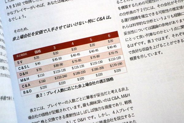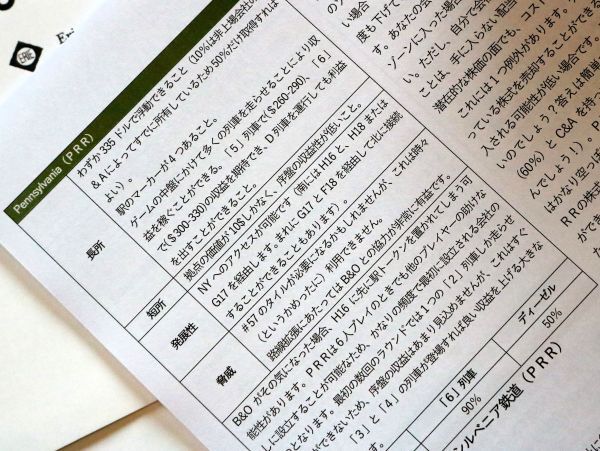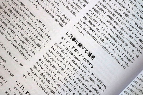 これはより上級者向けで、ゲームを序盤、中盤、終盤に分けてそれぞれの時期に応じた戦略を解説しています。非上場会社の適正価格や鉄道会社ごとの戦略、会社の設立と運営、株式の取得と売却、自分の鉄道会社から利益を吸い上げた上で他のプレイヤーに無価値の会社を押し付けるテクニックなどが解説されています。