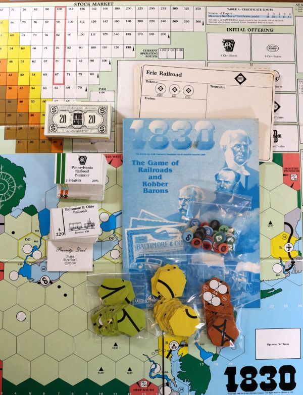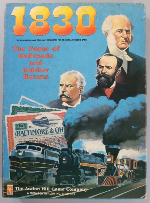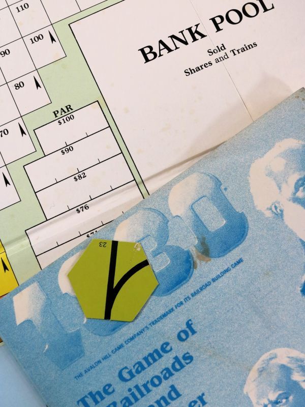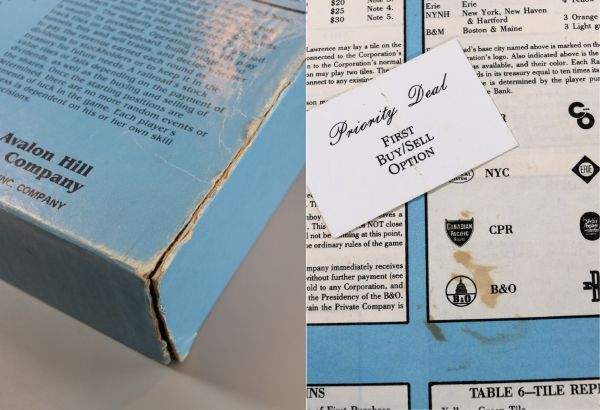 アバロンヒル版です。箱はかなり傷んでおり、破れとシミが目立ちます。内容物は箱に比べると良好ですが、地図盤とルールブック、鉄道会社シートにはシミがあります。カウンターと紙幣はかなり良好で、線路タイルも良好ですが1枚(緑)、切り離しの際のものと思われる小さな剥がれのようなものがあります。内容物は全て揃っていることを確認済みです。