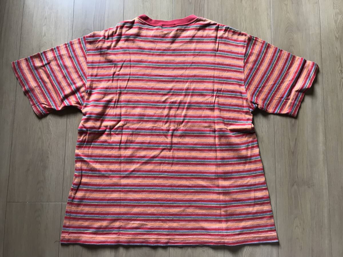 赤色地にオレンジやカーキ・青・白の細いラインが入った鮮やかなTシャツです。
