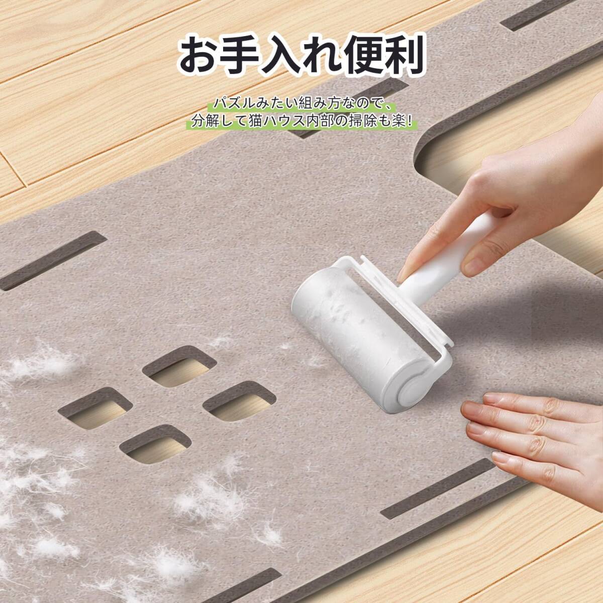 【お手入れ便利】この猫ハウスは掃除が簡単です。取り外し可能なクッションや洗えるカバーが付いているため、清潔を保つのが容易です。また、ポリエステル繊維素材は汚れに強く、拭くだけで簡単に汚れを落とせます。忙しい飼い主さんにとって、手間をかけずに清潔な環境を維持できるのが魅力です。