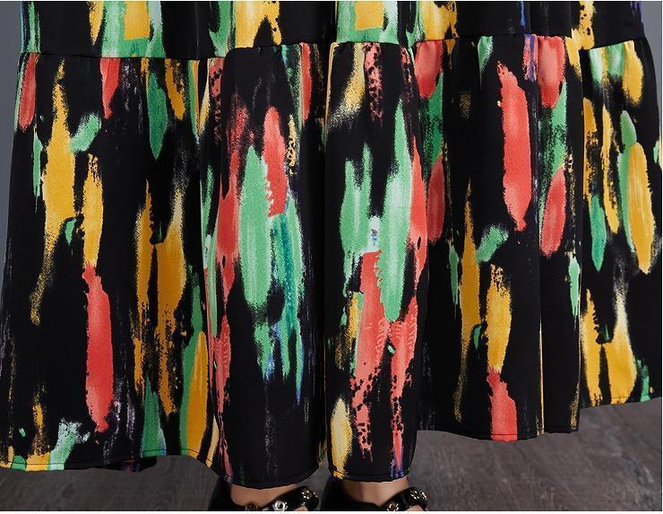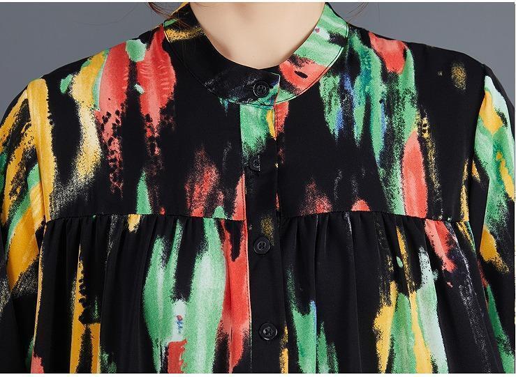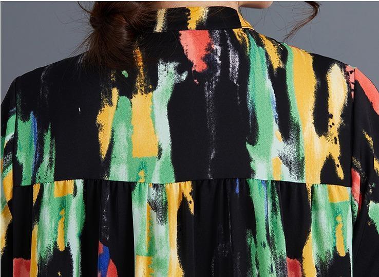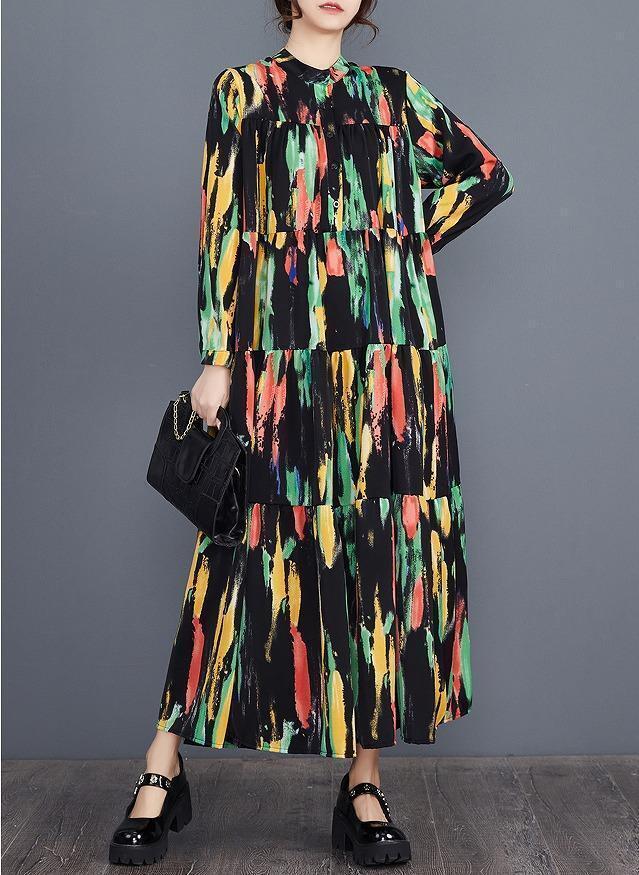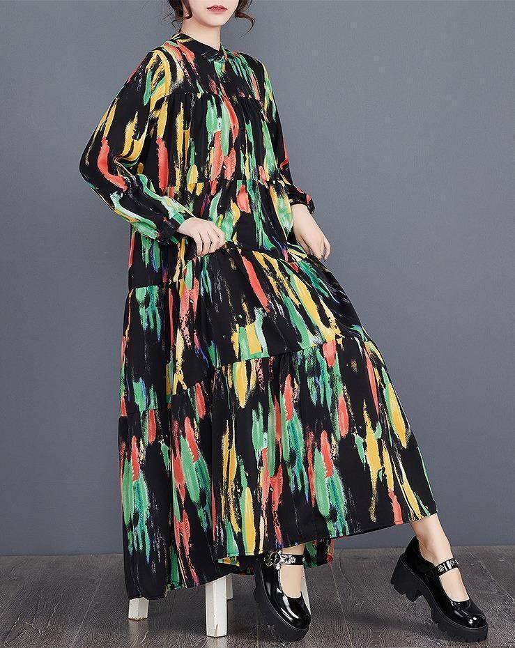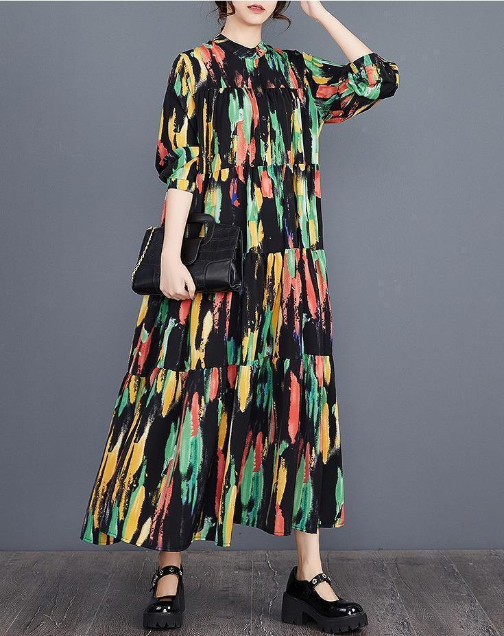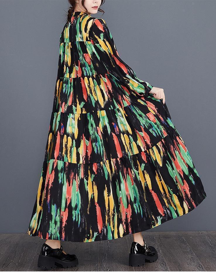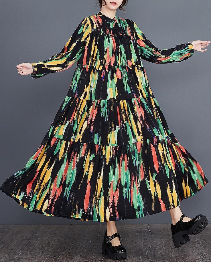 【大きいサイズ】新品ティアードワンピース長袖秋冬 抽象柄 カラフル ロング マキシ丈