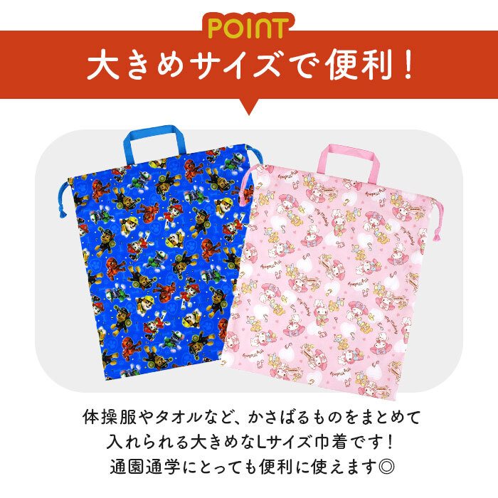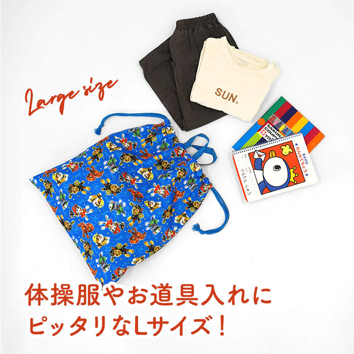 | 商品説明 | ・・体操着やお道具入れにぴったりな巾着(Lサイズ)が登場。 ・サイドの巾着紐をキュッと絞るだけ!お子さまでも簡単に開閉が可能。 ・口を絞れば、中身が飛び出すことなく安心。 ・持ち手付きで手提げとしても使用OK。 ・内側にお名前を記入できるネームタグ付きだから、お友達とお揃いでも大丈夫◎ ・汚れが気になったら手洗いOK。 ・お子さまに人気のキャラクターや乗り物デザインをラインナップ! ・入園・入学準備にもおすすめ。 |
