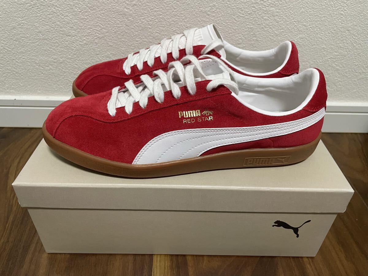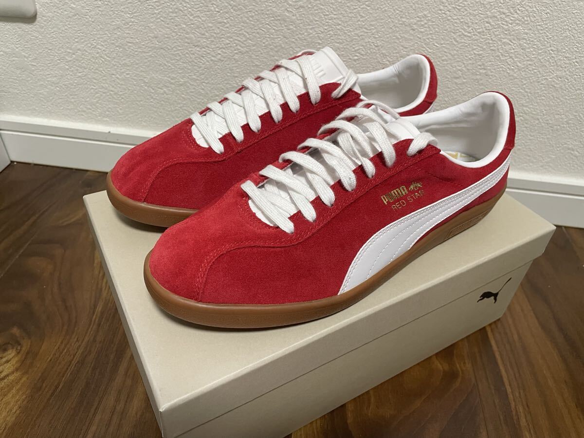 スエード素材のレッドとホワイトのコンビネーションが特徴のPUMA RED STARスニーカー。