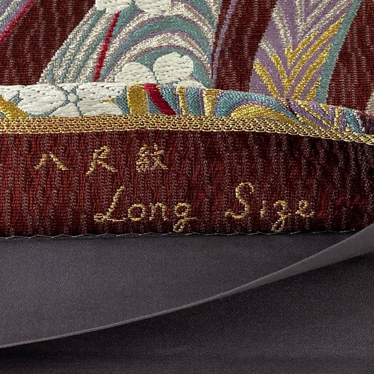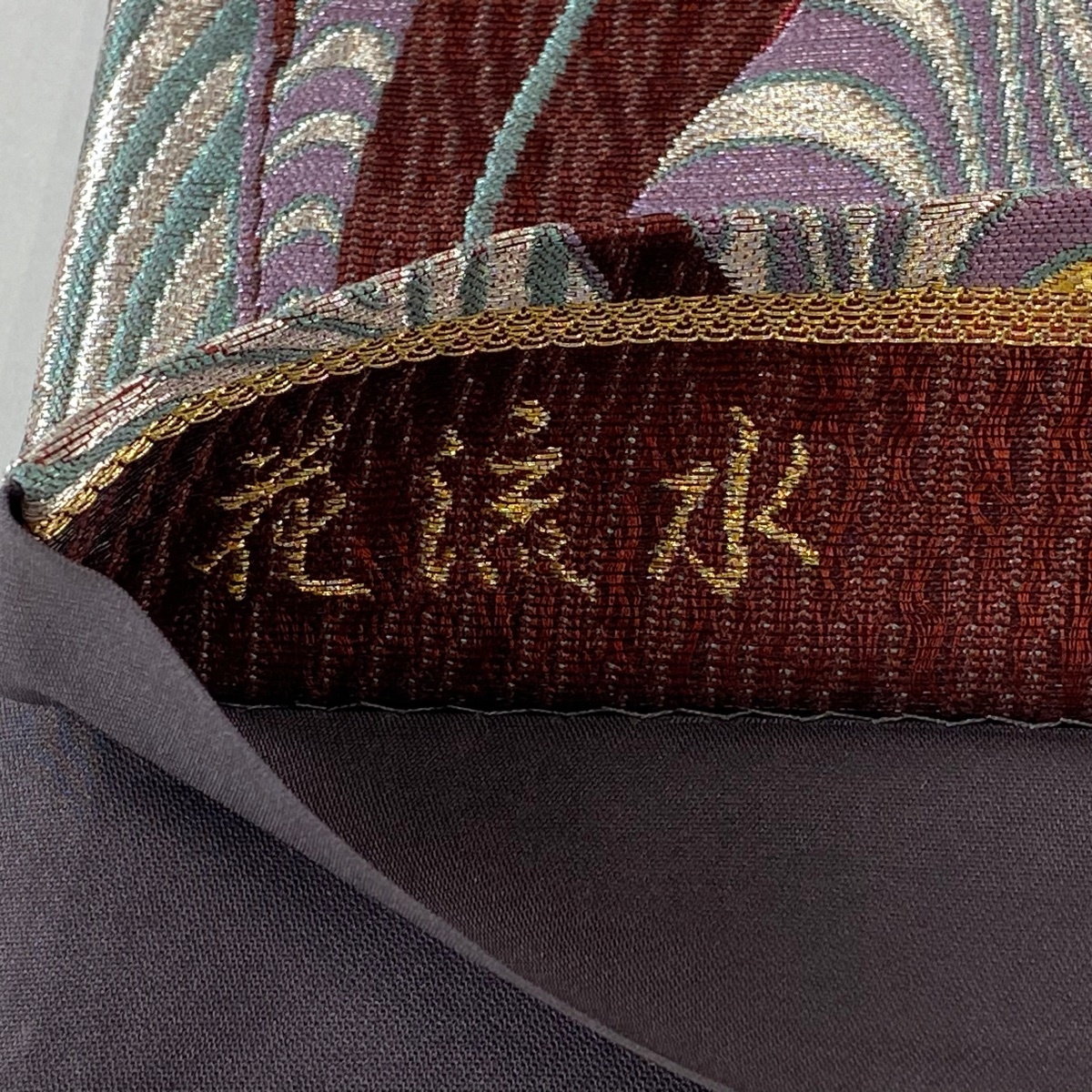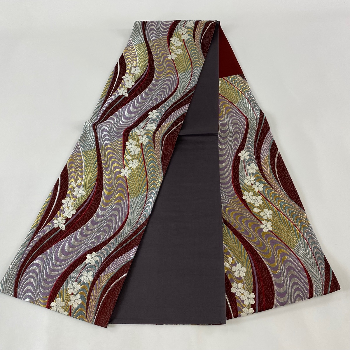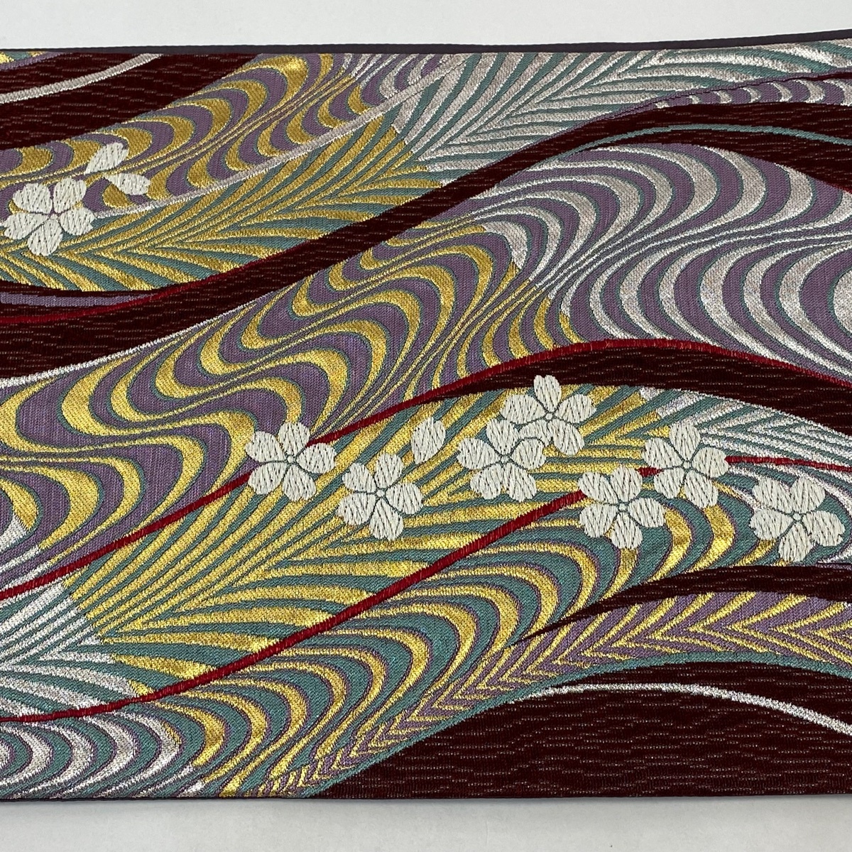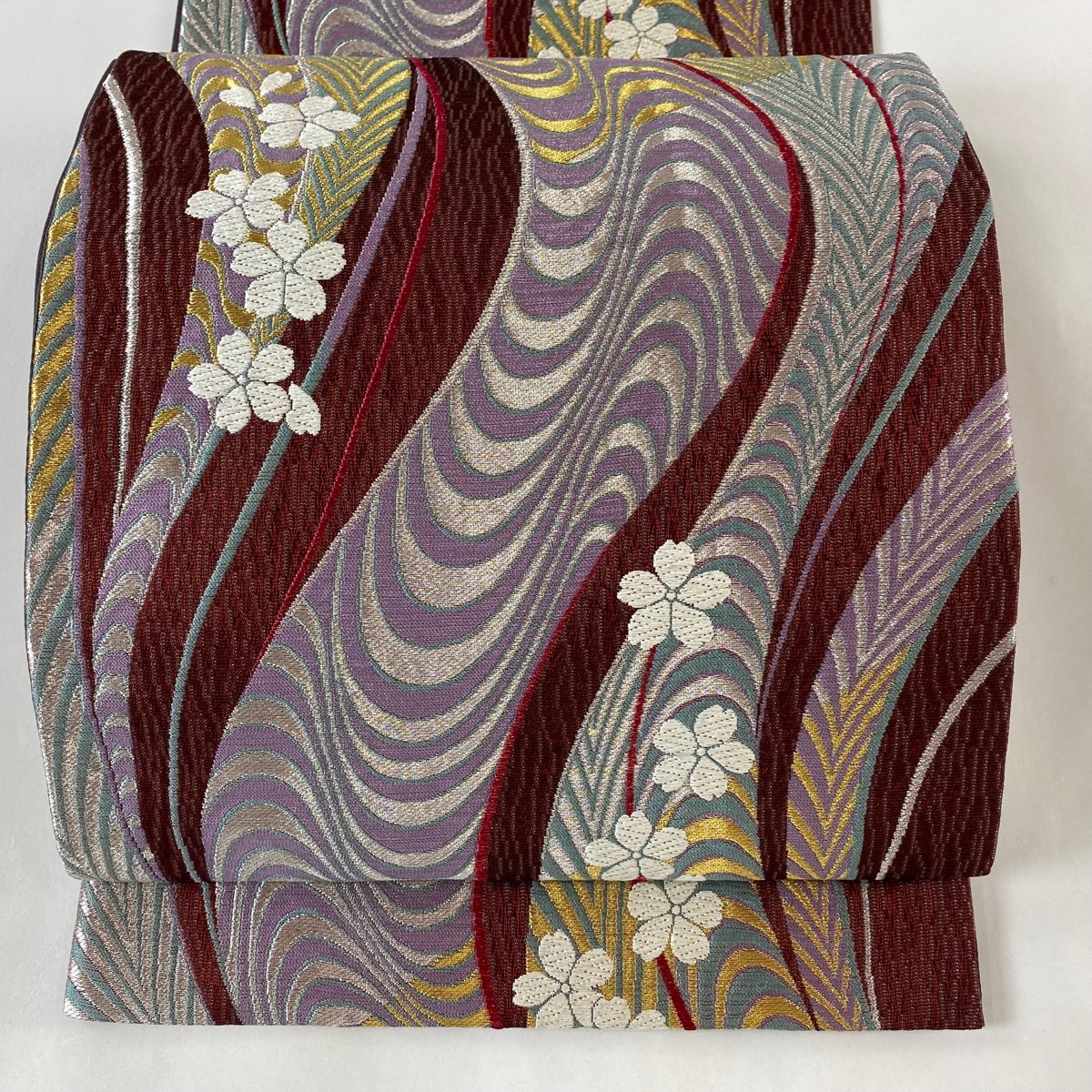 | 袋帯 秀品 八尺紋 花流水 幾何学模様 金銀糸 ラメ箔 赤紫 六通 正絹 【中古】 |