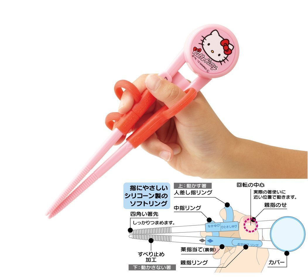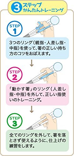 3ステップでスムーズにお箸の練習ができるトレーニング箸、右手用 携帯に便利なケース付き 3つのリングで正しい持ち方と動かし方のコツを覚え、次に「動かす箸」のリングを外して指使いの練習をし 最後はリングを全て外して箸を落さず使う仕上げの練習 初めから正しい持ち方でお箸を落さず使えるので、お子様の意欲がくじけにくい 「親指リング」と「薬指あて」で動かさないお箸をしっかり固定できる 人差し指で「閉じる」、中指で「開く」ので覚えやすい リングは柔らかいシリコン製で指に優しく、箸先はつまみやすい四角形 すべり止め加工付き。食洗機は使用不可 対象年齢は2~7歳 ケースにお箸を収納できるので持ち運びや保管の際に便利
