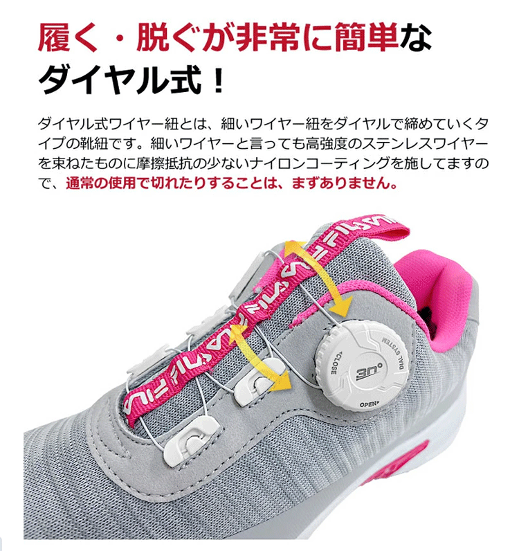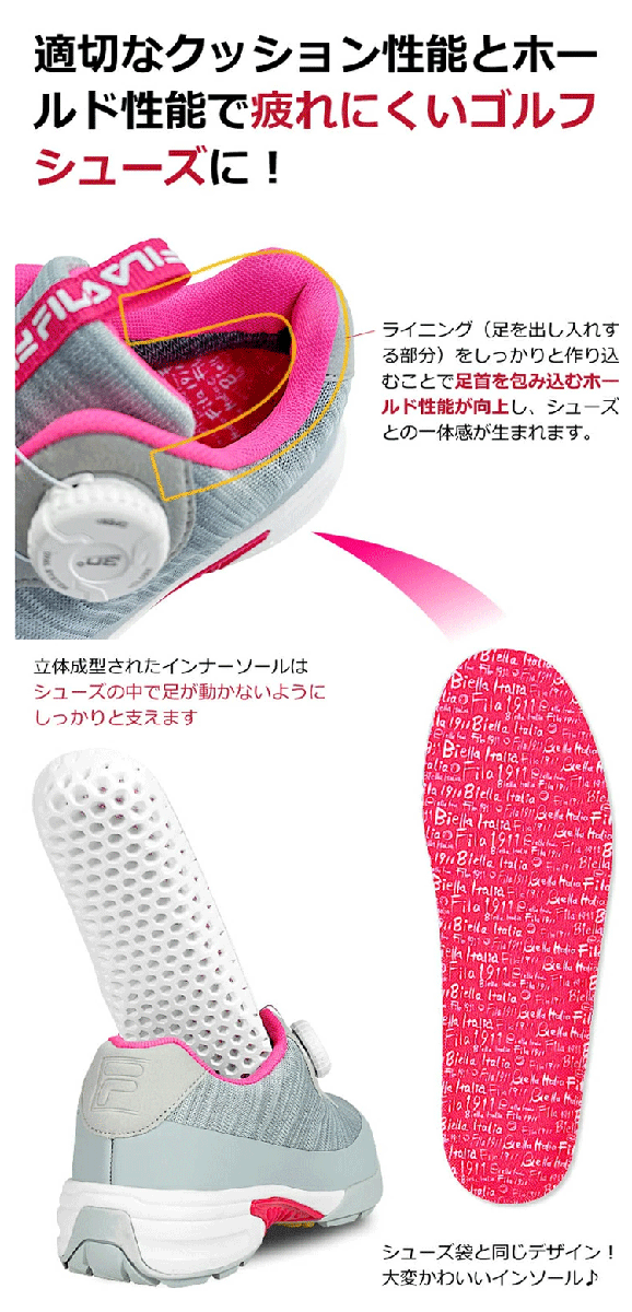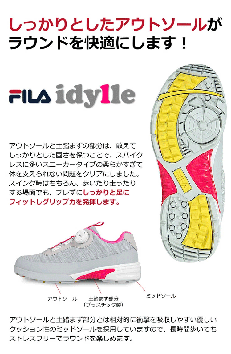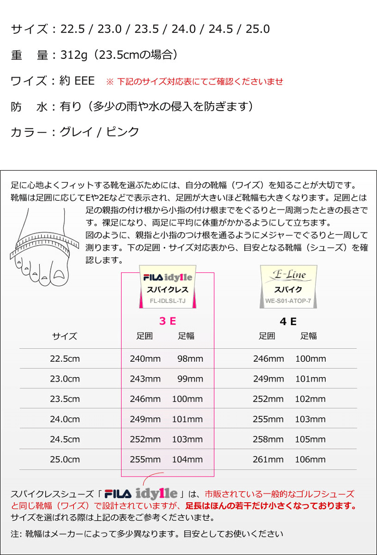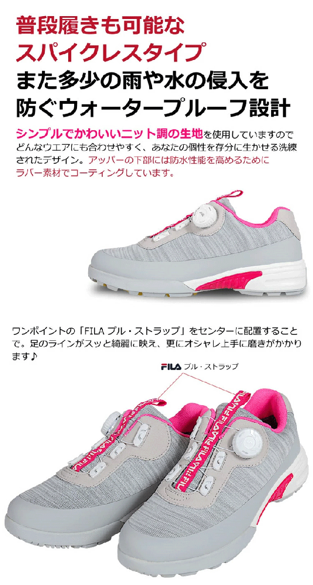 【商品特徴】 シンプルなデザイン!お気に入りのウエアに合わせやすいニットスニーカータイプ。 専用シューズ袋付き!ブランド「FILA」のシューズ袋をお付けします。 ■履く・脱ぐが非常に簡単なダイヤル式! ■ラウンド中に緩んでしまった紐を簡単&瞬時に締め直し! ■しっかりとしたアウトソールがラウンドを快適にします! ■普段履きも可能なスパイクレスタイプ ■多少の雨や水の侵入を防ぐウォータープルーフ設計 【商品詳細】 ●状態:新品・未使用品 ●サイズ:23.5cm ●幅:3E相当(ワイド) ●重量:312g(23.5cmの場合) ●防水:あり(多少の雨や水の侵入を防ぎます) ●カラー:グレイ ※撮影時の光量の具合や、ご覧いただいております画面環境によりまして、実際の商品と若干色味が違う場合がございます。