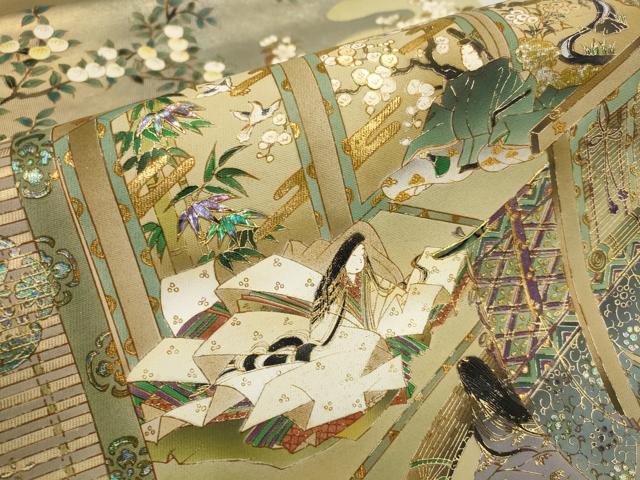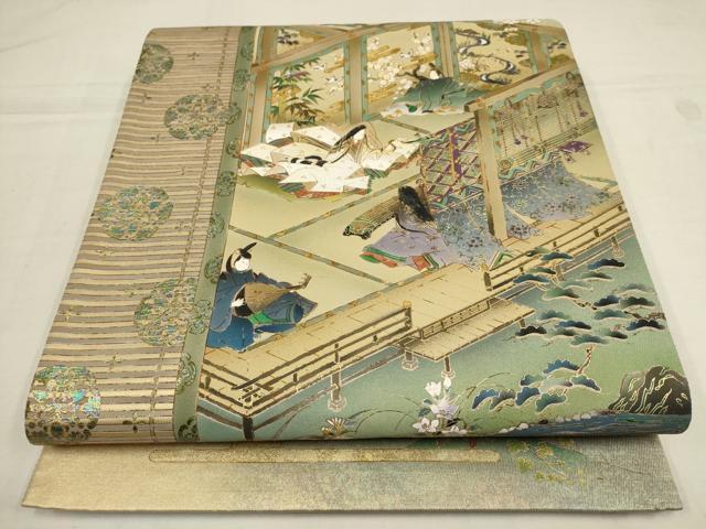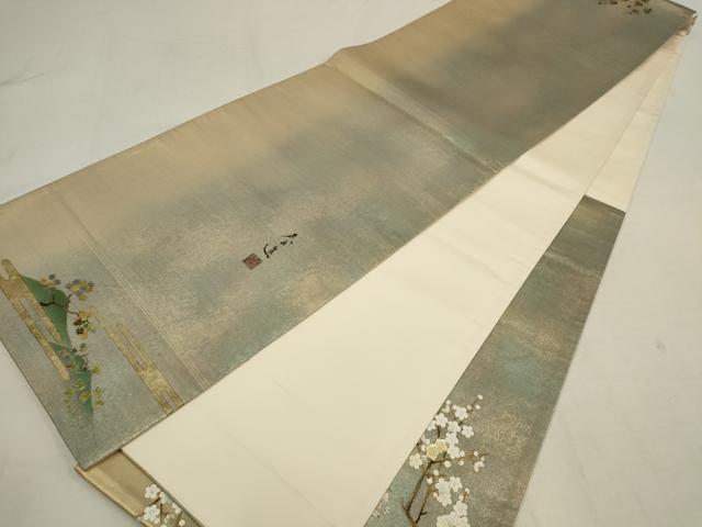 | 【正絹】 状態は接写画像のように 柄止まり・裏地に薄い汚れがございますが その他特に目立ったシミ汚れなどもなく大変良い状態です。 甲斐泰造氏は、日本随一の知名度を誇る螺鈿美術工芸作家の名工です。 螺鈿(らでん)は、主に漆器や帯などの伝統工芸に用いられる装飾技法のひとつで、 貝殻の内側、虹色光沢を持った真珠層の部分を切り出した板状の素材を、 漆地や木地の彫刻された表面にはめ込む手法です。 真珠層が光線によって、青色やピンク色などの優しい光を放ち、 自然な非規則性が神秘的で日本人の心を惹きつけてきました。 大変上質な逸品になります。 お安く出品致しますので、是非この機会にいかがでしょうか? ※汚れ等に関しましては、着用時には見えない部分になるかと思いますので あまり気にならずお召になれるかと思います。