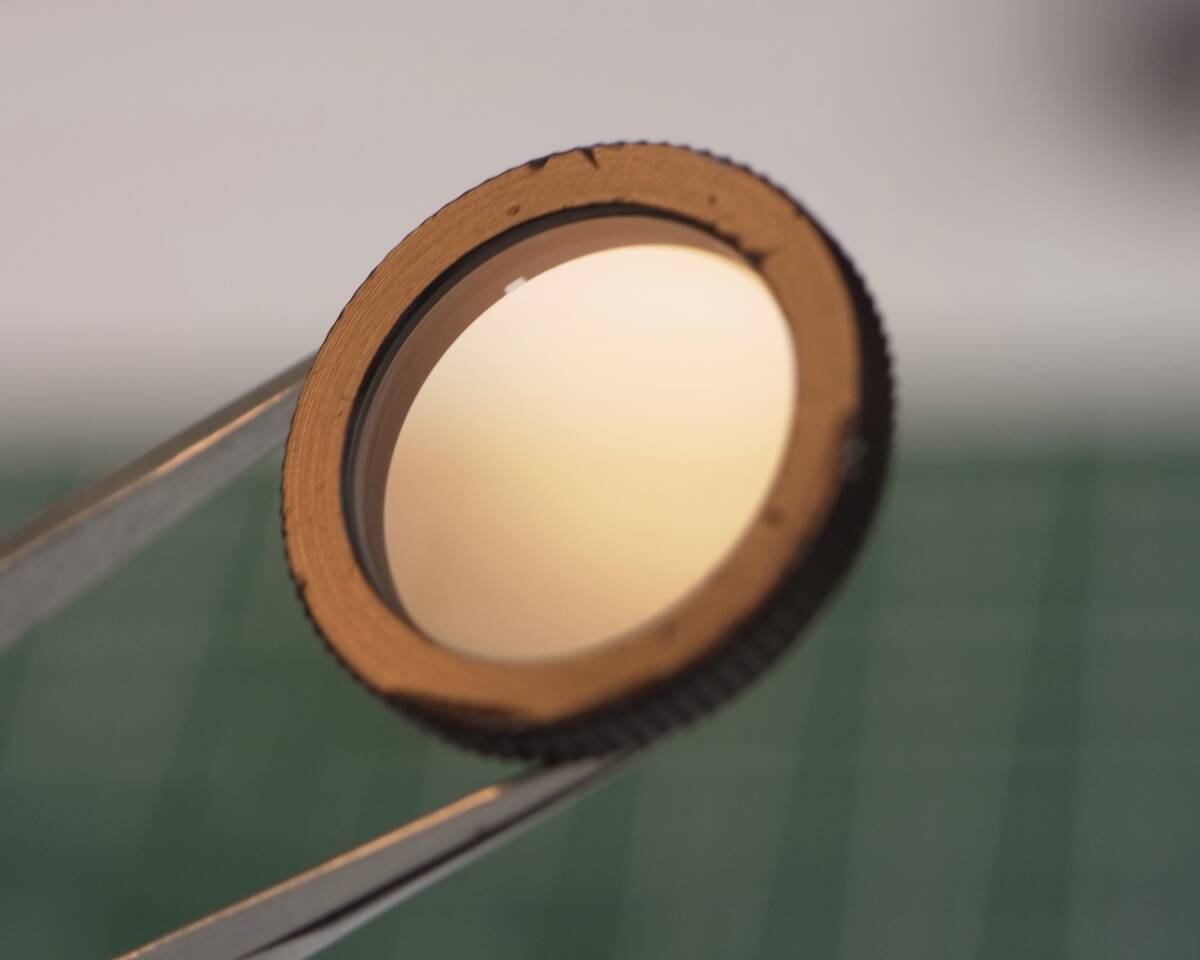 枠部に使用にともなう傷がありますが、光学系は綺麗です。エルマー5cmの保護フィルターに好適です。