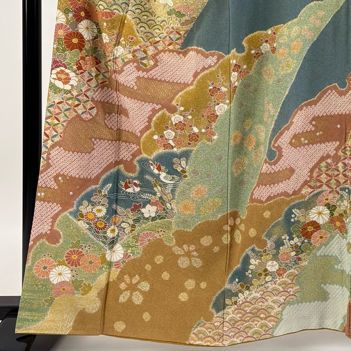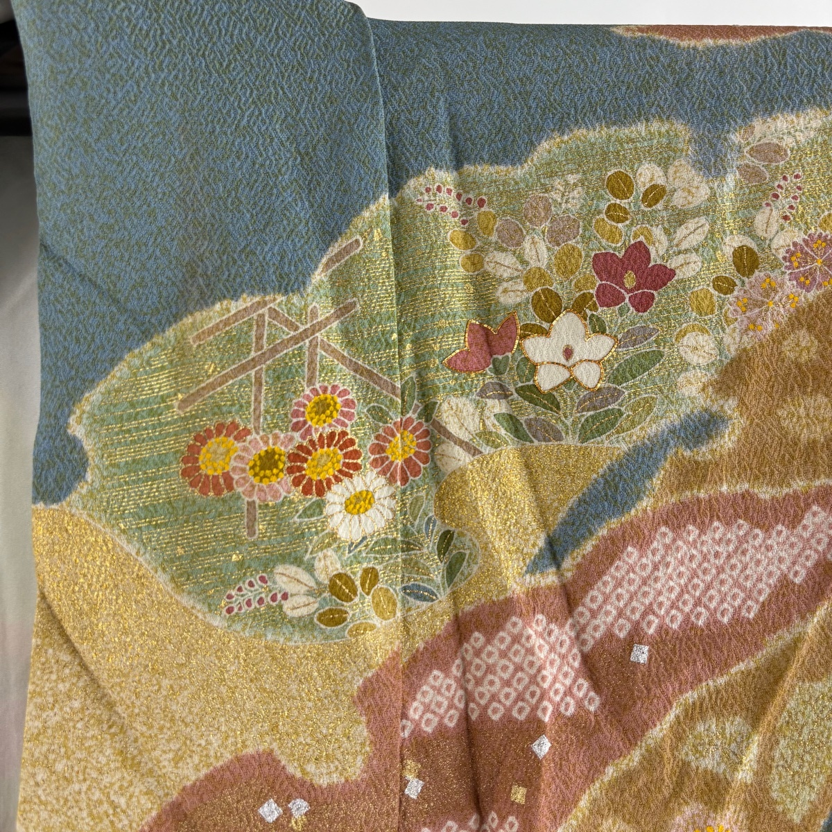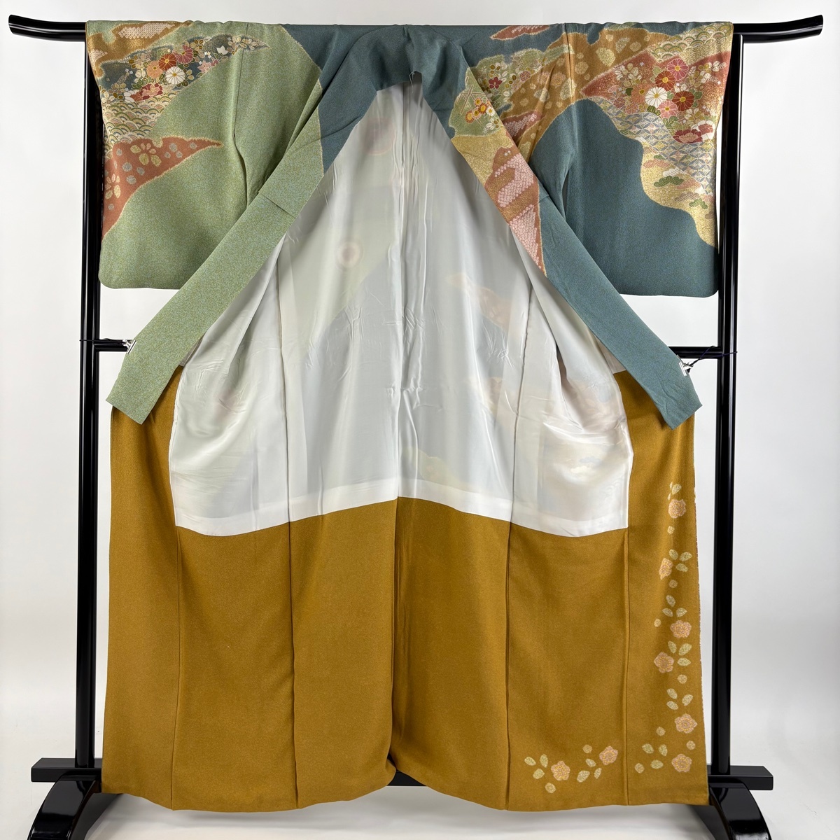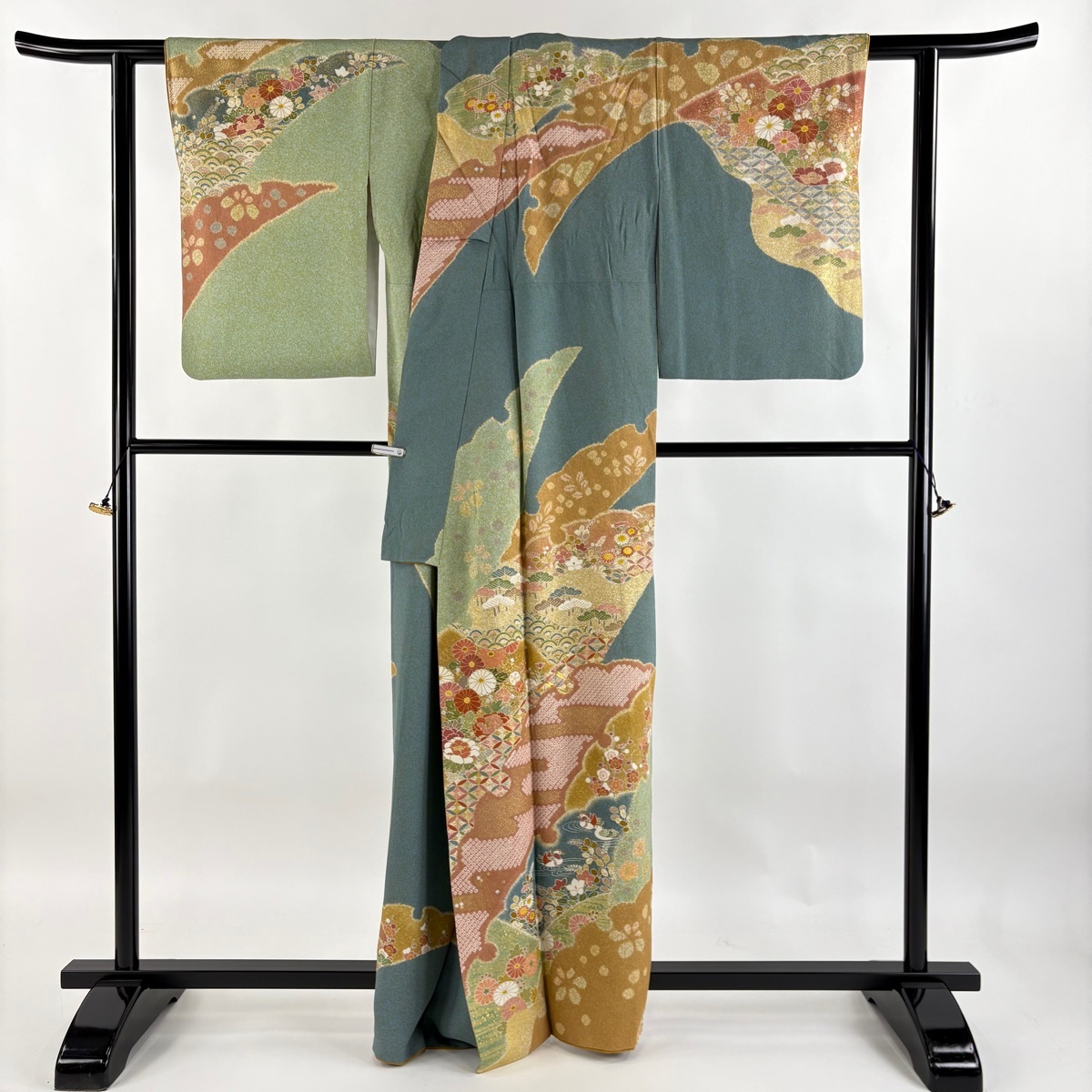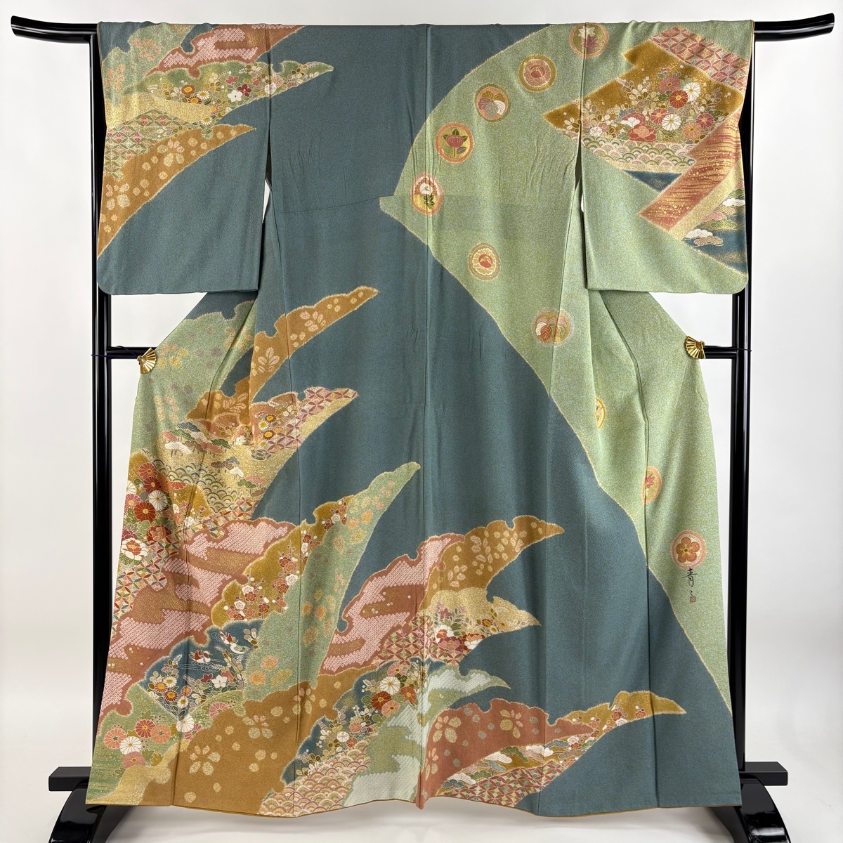 | 訪問着 逸品 松井青々 落款 草花 雪輪 金糸 金銀彩 青灰色 袷 身丈163.5 裄丈65 M 正絹 【中古】 |