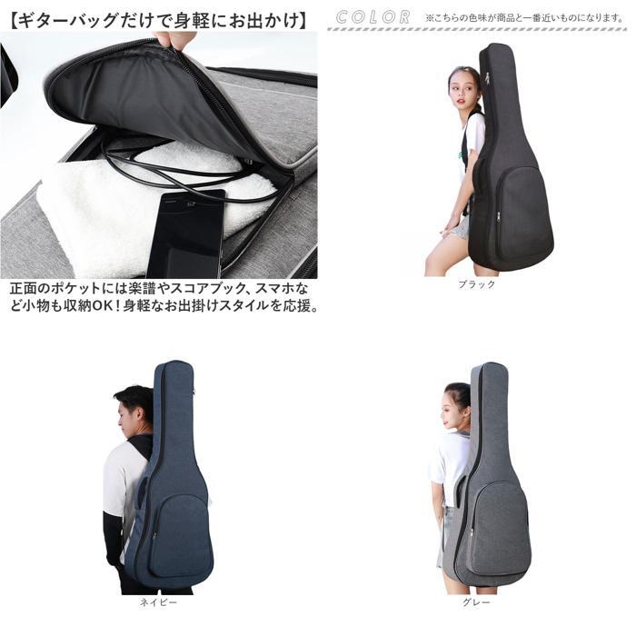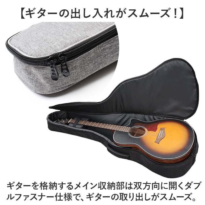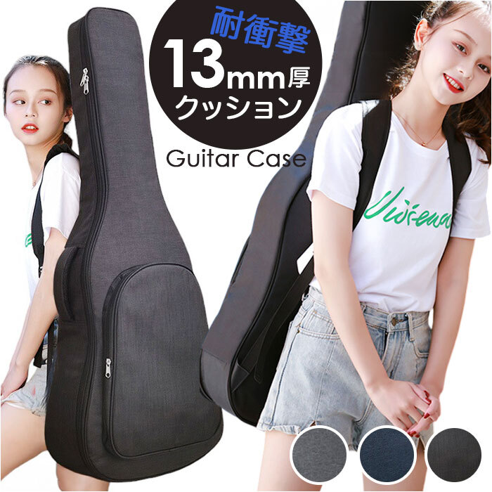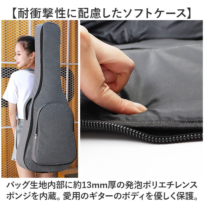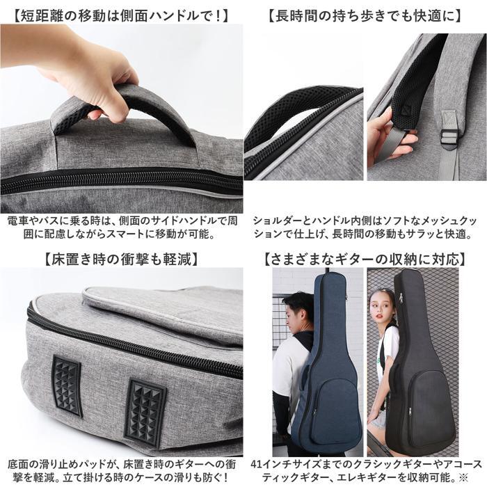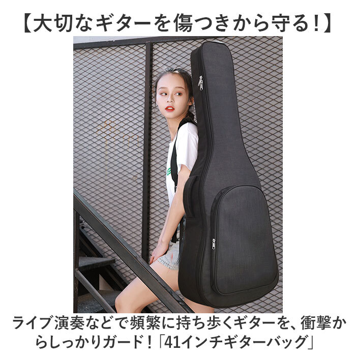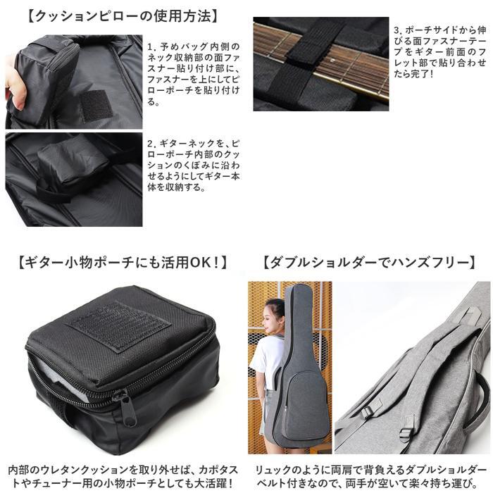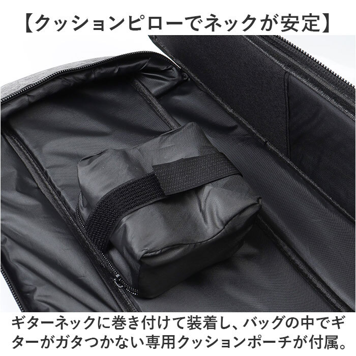 商品説明 | ・・【大切なギターを傷つきから守る!】 ・ライブ演奏などで頻繁に持ち歩くギターを、衝撃からしっかりガード!「41インチギターバッグ」 ・【耐衝撃性に配慮したソフトケース】 ・バッグ生地内部に約13mm厚の発泡ポリエチレンスポンジを内蔵。愛用のギターのボディを優しく保護。 ・【ギターの出し入れがスムーズ!】 ・ギターを格納するメイン収納部は双方向に開くダブルファスナー仕様で、ギターの取り出しがスムーズ。 ・【クッションピローでネックが安定】 ・ギターネックに巻き付けて装着し、バッグの中でギターがガタつかない専用クッションポーチが付属。 ・【クッションピローの使用方法】 ・1.予めバッグ内側のネック収納部の面ファスナー貼り付け部に、ファスナーを上にしてピローポーチを貼り付ける。 ・2.ギターネックを、ピローポーチ内部のクッションのくぼみに沿わせるようにしてギター本体を収納する。 ・3.ポーチサイドから伸びる面ファスナーテープをギター前面のフレット部で貼り合わせたら完了! ・【ギター小物ポーチにも活用OK!】 ・内部のウレタンクッションを取り外せば、カポタストやチューナー用の小物ポーチとしても大活躍! ・【ダブルショルダーでハンズフリー】 ・リュックのように両肩で背負えるダブルショルダーベルト付きなので、両手が空いて楽々持ち運び。 ・【短距離の移動は側面ハンドルで!】 ・電車やバスに乗る時は、側面のサイドハンドルで周囲に配慮しながらスマートに移動が可能。 ・【長時間の持ち歩きでも快適に】 ・ショルダーとハンドル内側はソフトなメッシュクッションで仕上げ、長時間の移動もサラッと快適。 ・【床置き時の衝撃も軽減】 ・底面の滑り止めパッドが、床置き時のギターへの衝撃を軽減。立て掛ける時のケースの滑りも防ぐ! ・【さまざまなギターの収納に対応】 ・・41インチサイズまでのクラシックギターやアコースティックギター、エレキギターを収納可能。 ・※ご購入の前に、ケースのサイズとお手持ちのギターのサイズをご確認ください。 ・【ギターバッグだけで身軽にお出かけ】 ・正面のポケットには楽譜やスコアブック、スマホなど小物も収納OK!身軽なお出掛けスタイルを応援。 |