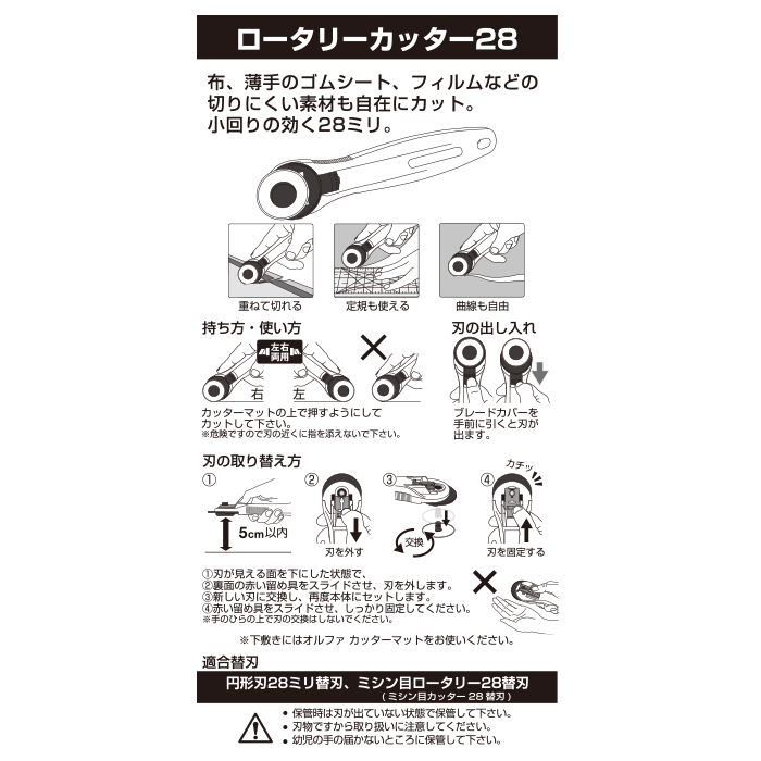 適合替刃:ミシン目カッター28替刃、円形刃28ミリ替刃