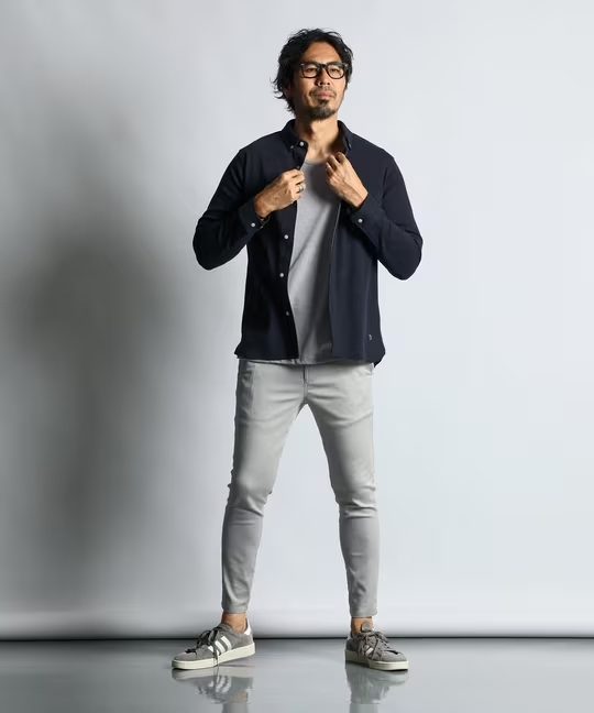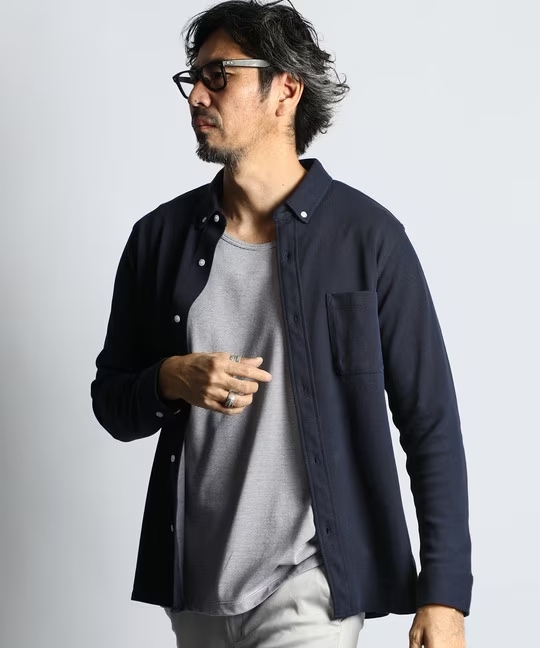 台衿付きボタンダウンの前開きタイプで、シャツのディテールを鹿の子素材で構築したミックスデザイン。