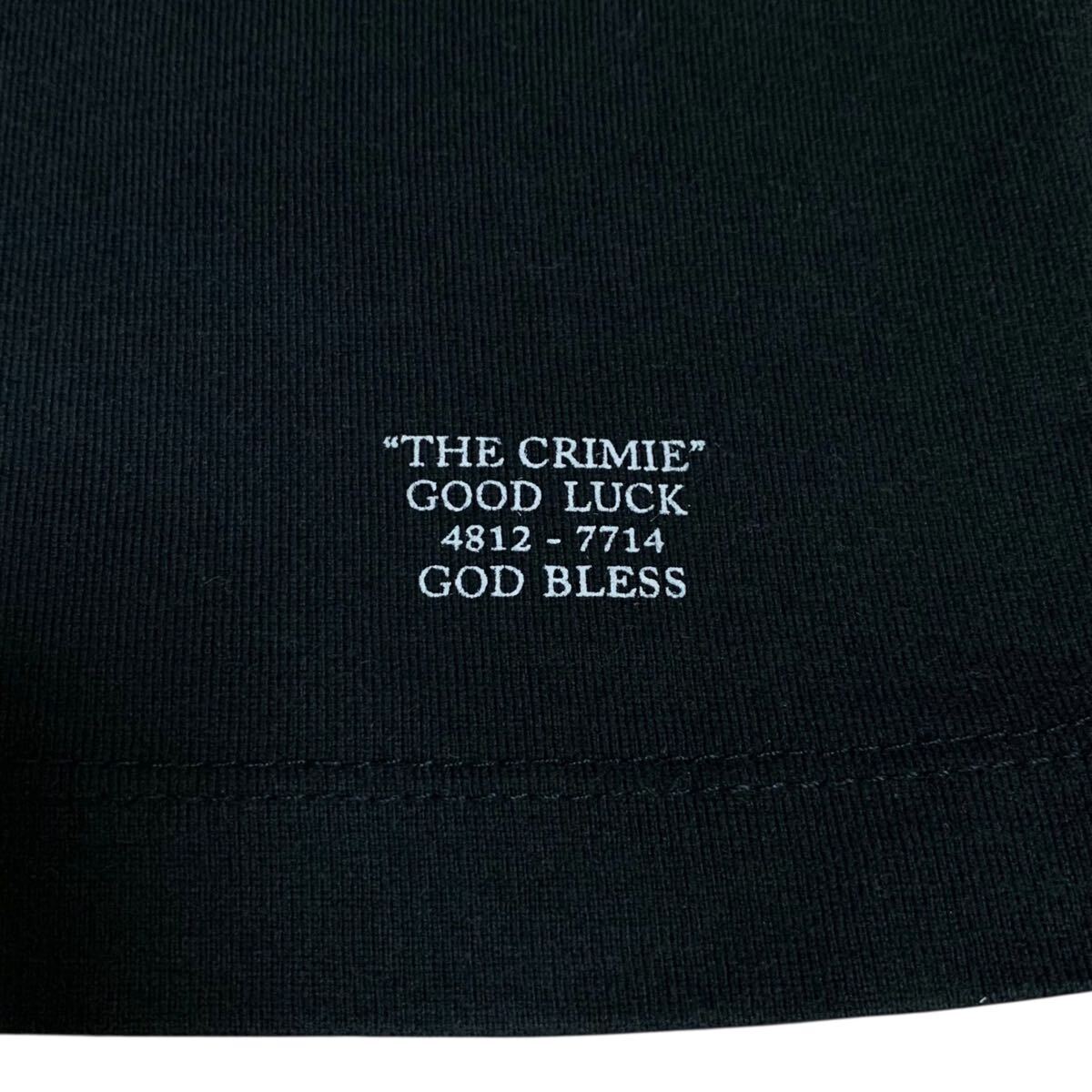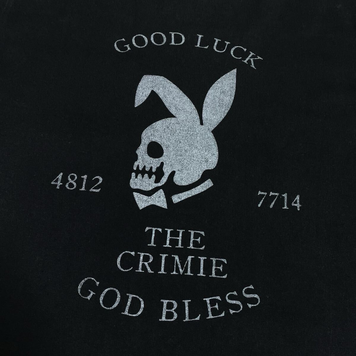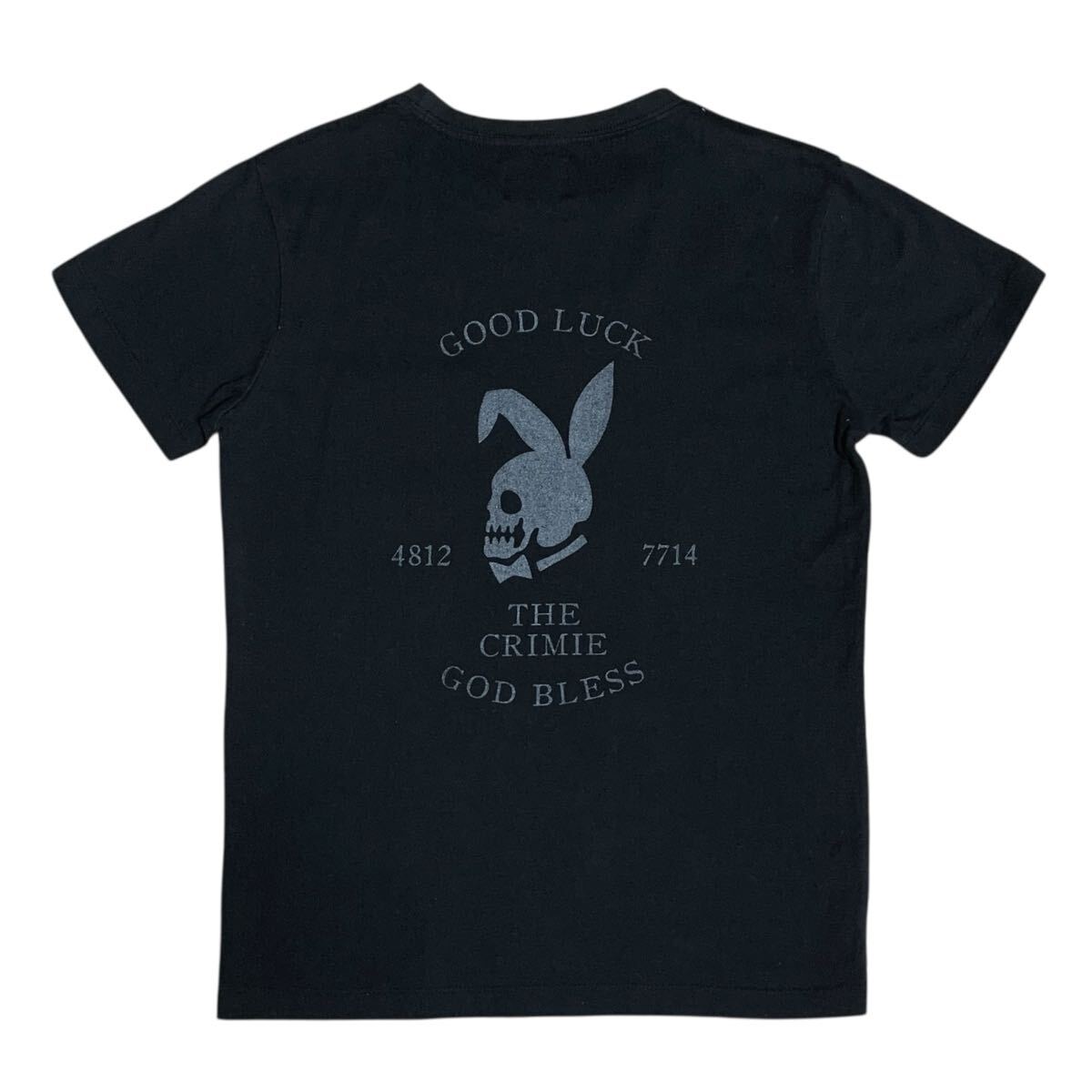 フロントは裾にワンポイント、背中にはプレイボーイ風のスカルが描かれたプリントがCRIMIEらしい無骨な雰囲気が魅力です。