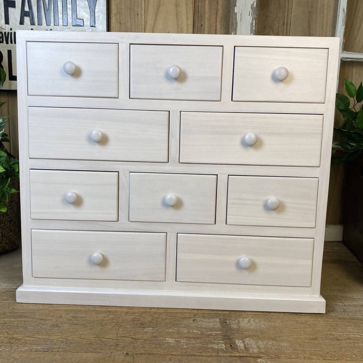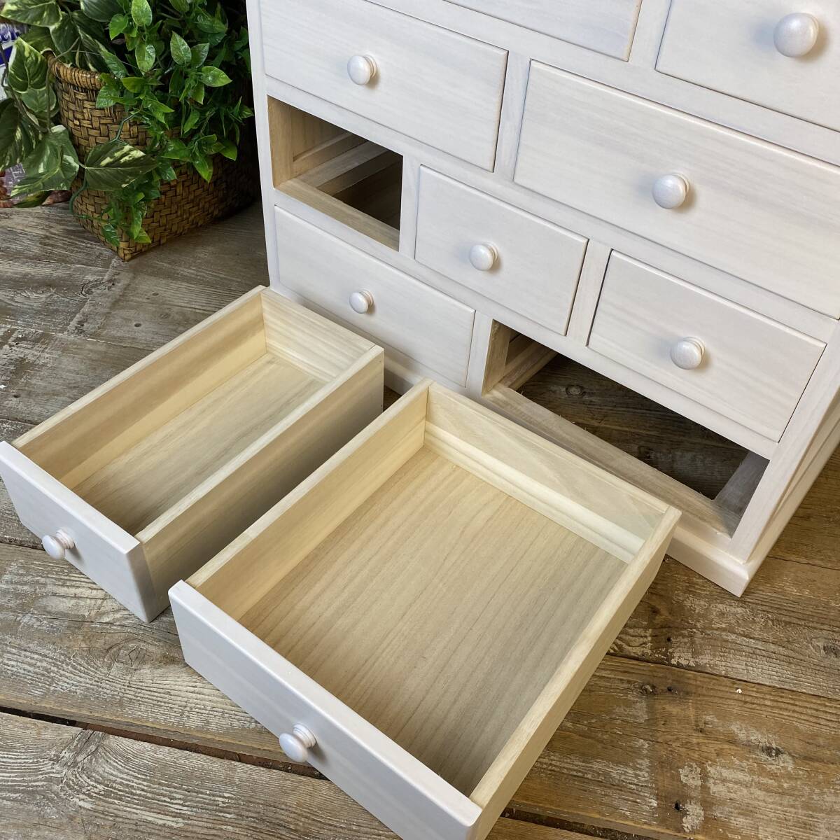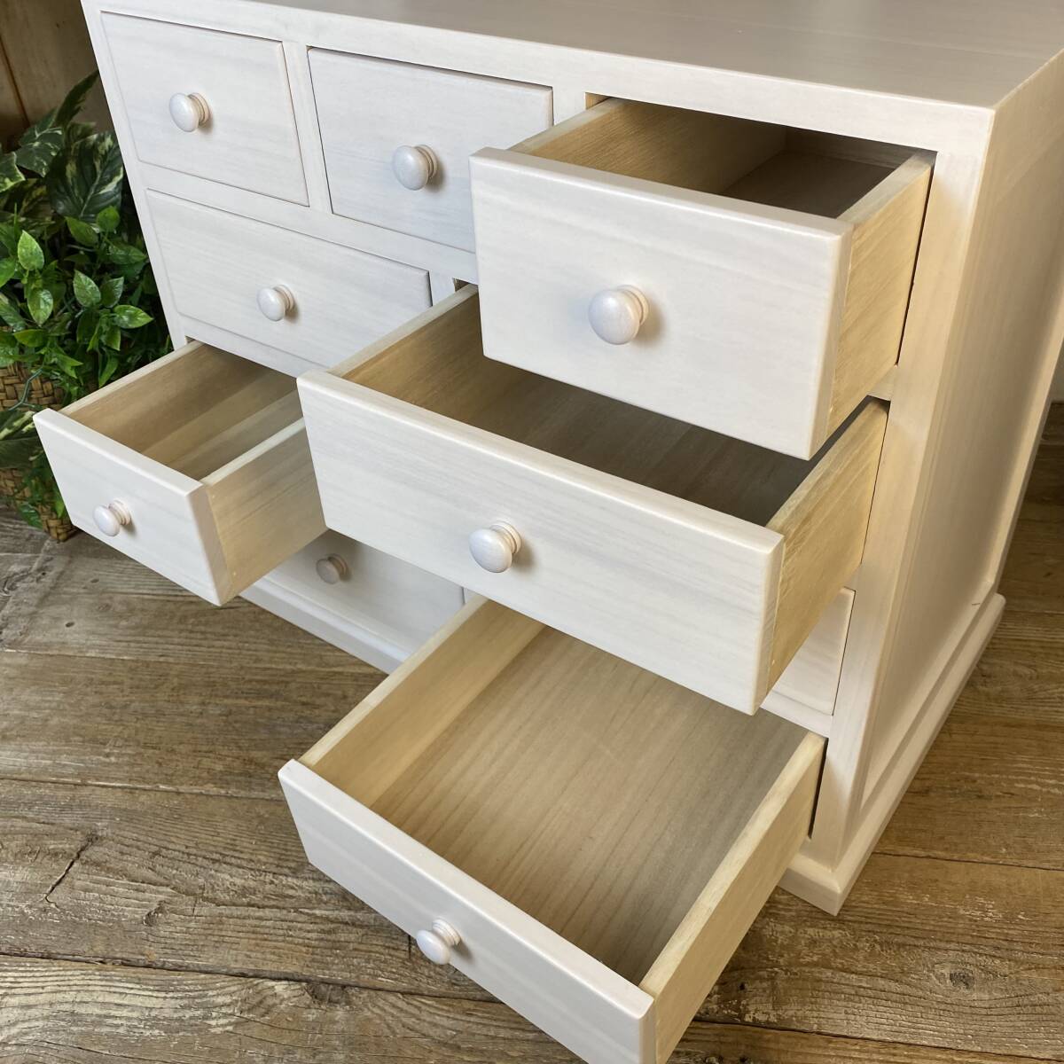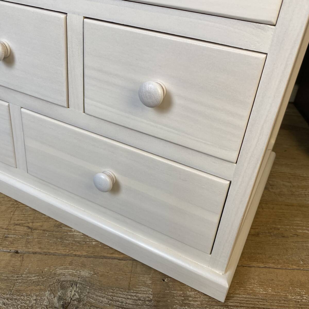 ◆◇商品詳細◇◆ 多引き出しタンスホワイト 落ち着きのあるシンプルな多引出しチェストタンス。桐材の木目を活かした美しい木目デザイン。桐材無垢板使用で、軽く、持ち運び移動も楽々です。真っ白なお色がどんなお部屋にも合わせやすいですよ!小ぶりなタンスですが多引き出しで収納力があり、お部屋の整理整頓に役立ちます。アパートの小部屋、施設ルーム、寮部屋などに最適なサイズです。この機会に是非どうぞ。 【商品状態説明】 小キズあり、まずまずの美品。 完成品になります。 こちらの商品は、現品画像ではありません。未開封の在庫の中から丁寧に検品後、発送いたします。 【サイズ】 横幅:60cm(下部土台含む横幅:62㎝) 奥行:34cm 高さ:53cm 引出し内寸大24.5cm×29cm×8cm 引出し内寸小14.5cm×29cm×8cm 【素材】 木製、桐材無垢 【カラー】 ホワイト 【参考価格】 ¥19.800 | ◆◇発送方法◇◆ ●送料は基本無料ですが、沖縄・離島などにお住まいの方はご負担ください。 (沖縄・離島の方はメールにてご連絡いただければ、送料をお知らせいたします。) ●ヤマト運輸・佐川急便・第一貨物のいずれかにて配送いたします。 (運送会社の指定はできません。ご了承ください。) ●日時・時間指定のある方や、お問い合わせ(追跡)番号をご希望の方は取引連絡の際にお知らせください。 | |