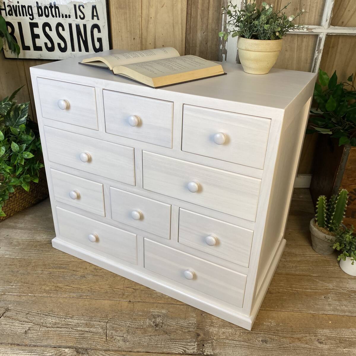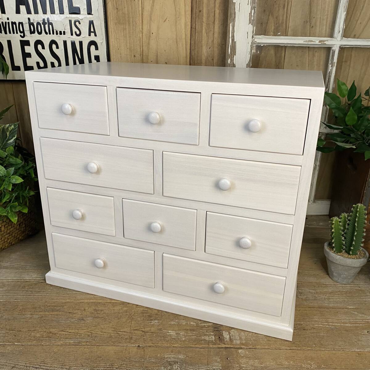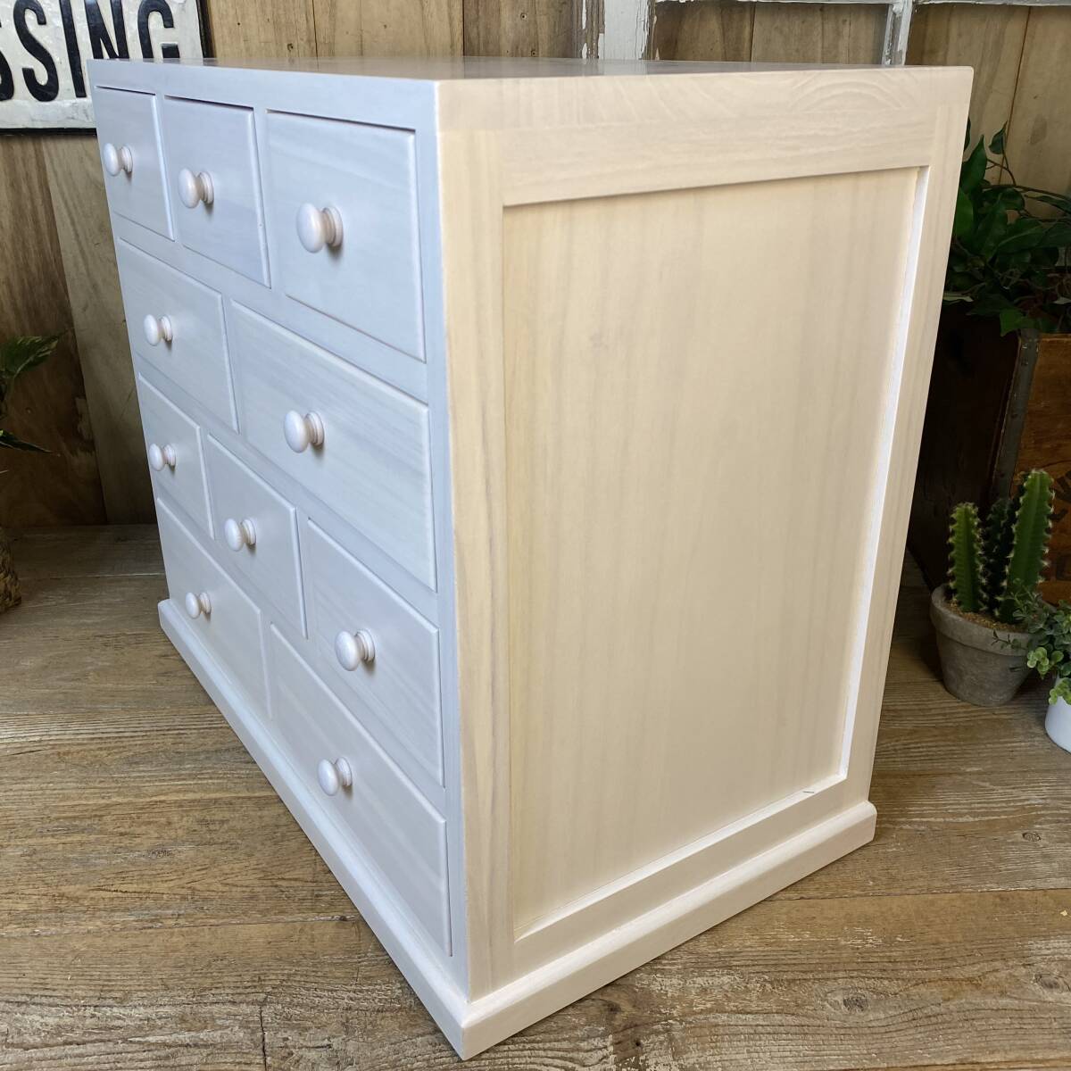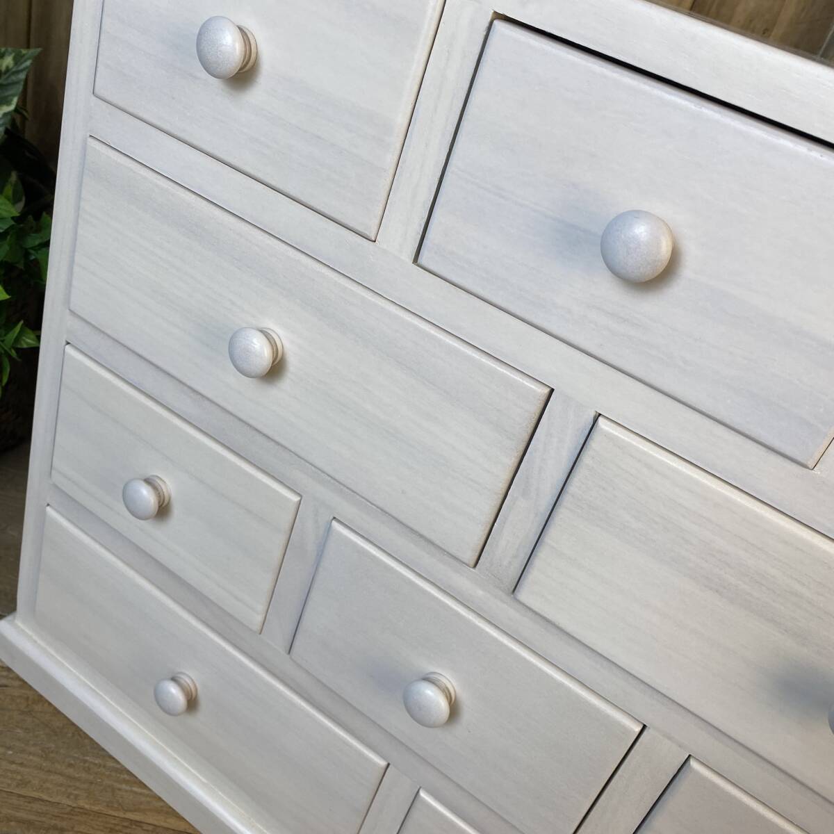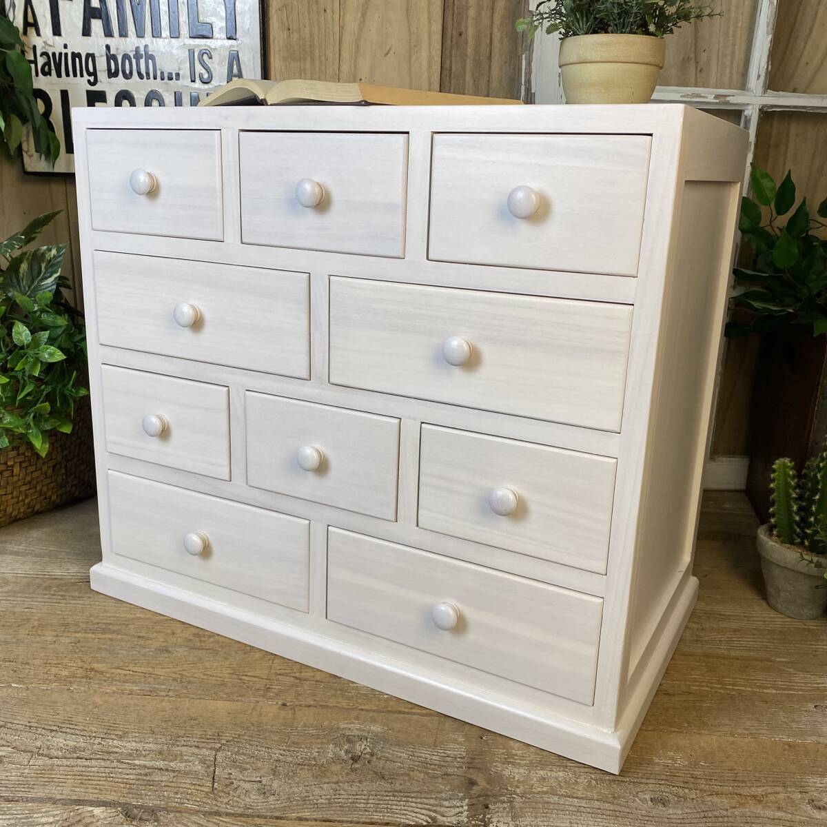 ◆◇商品詳細◇◆ 多引き出しタンスホワイト 落ち着きのあるシンプルな多引出しチェストタンス。桐材の木目を活かした美しい木目デザイン。桐材無垢板使用で、軽く、持ち運び移動も楽々です。真っ白なお色がどんなお部屋にも合わせやすいですよ!小ぶりなタンスですが多引き出しで収納力があり、お部屋の整理整頓に役立ちます。アパートの小部屋、施設ルーム、寮部屋などに最適なサイズです。この機会に是非どうぞ。 【商品状態説明】 小キズあり、まずまずの美品。 完成品になります。 こちらの商品は、現品画像ではありません。未開封の在庫の中から丁寧に検品後、発送いたします。 【サイズ】 横幅:60cm(下部土台含む横幅:62㎝) 奥行:34cm 高さ:53cm 引出し内寸大24.5cm×29cm×8cm 引出し内寸小14.5cm×29cm×8cm 【素材】 木製、桐材無垢 【カラー】 ホワイト 【参考価格】 ¥19.800 | ◆◇発送方法◇◆ ●送料は基本無料ですが、沖縄・離島などにお住まいの方はご負担ください。 (沖縄・離島の方はメールにてご連絡いただければ、送料をお知らせいたします。) ●ヤマト運輸・佐川急便・第一貨物のいずれかにて配送いたします。 (運送会社の指定はできません。ご了承ください。) ●日時・時間指定のある方や、お問い合わせ(追跡)番号をご希望の方は取引連絡の際にお知らせください。 | |