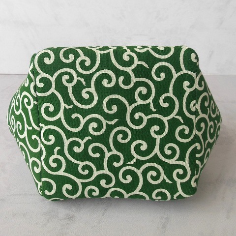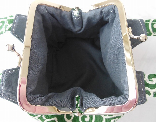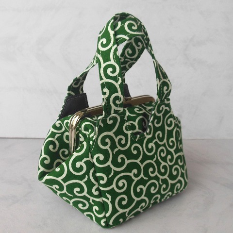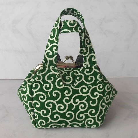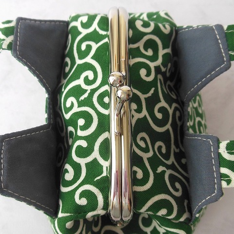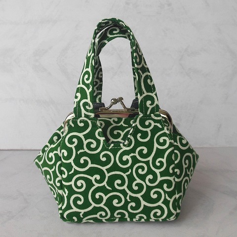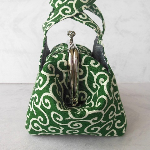 ◆がま口ポーチ◆あおりバッグ風◆唐草模様 グリーン◆ハンドメイド 化粧ポーチ 口金10㎝