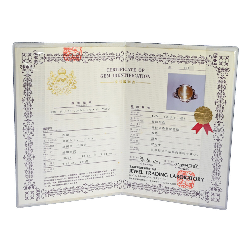 実寸サイズ | ライン:キャッツアイ グラム:7.5g 石の個数:1P 親石:9.13ct リングサイズ:JP:10.5号/EURO:50.5/US:5.75/UK:K-L(指回り:50.8mm) シェイプ:ラウンド カッティングスタイル:カボション セッティング:プロングセッティング 鑑定機関:ジュエルトレーディングラボラトリー [サイズ(以下約)] 親石寸法(H×W 見え寸):10.34×10.54×8.42 mm モチーフトップ:H13.0 mm × W13.4 mm リング幅:2.2-2.9×18.8×1.4-10.6 mm リング内径:16.2 mm サイズ直し:可能 |