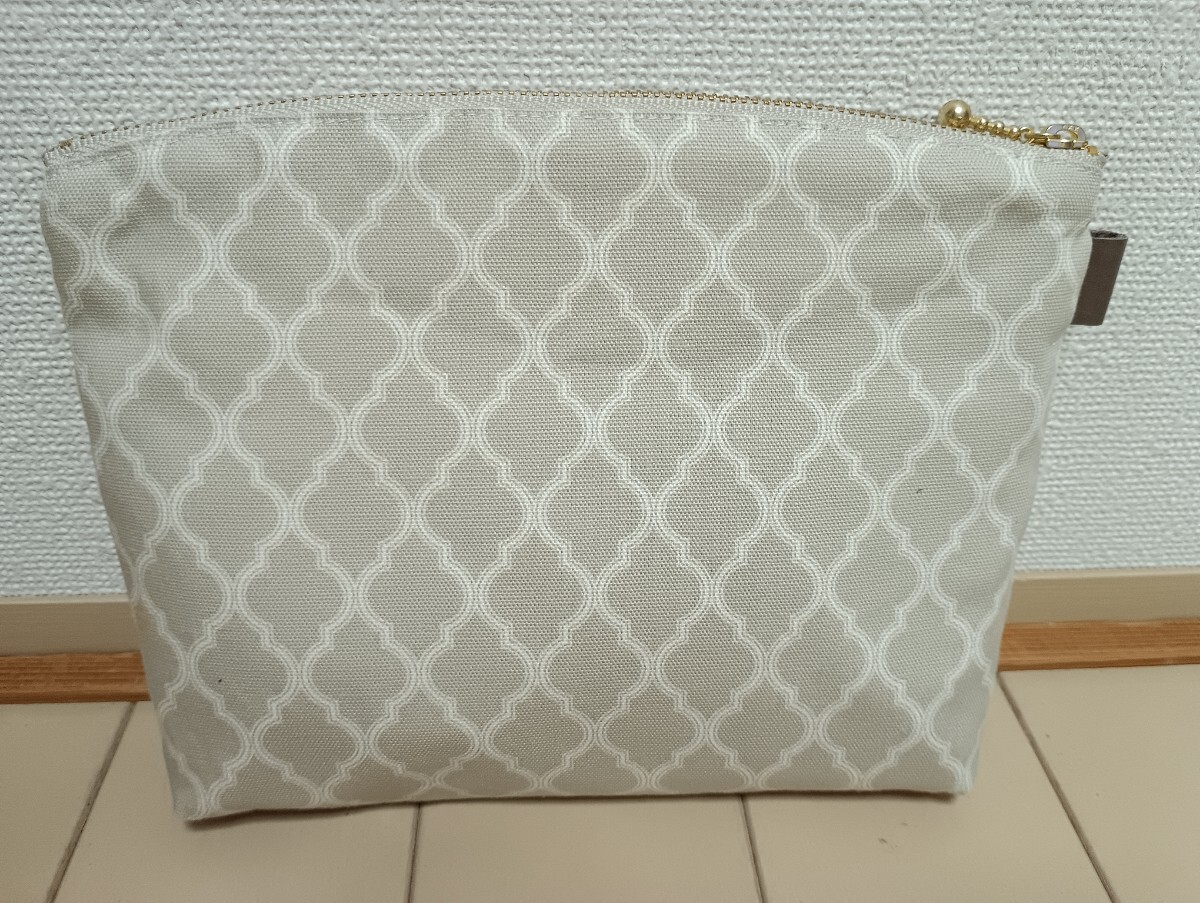 ハンドメイド  YUWA 白&ベージュ色のモロッカン柄のポーチです。前にポケット付いてます。中は生成りの生地です。20cmのファスナーを使用しています。通帳入れにもお使い頂けます。